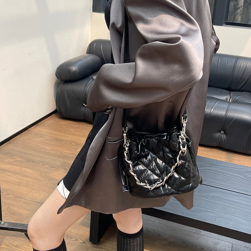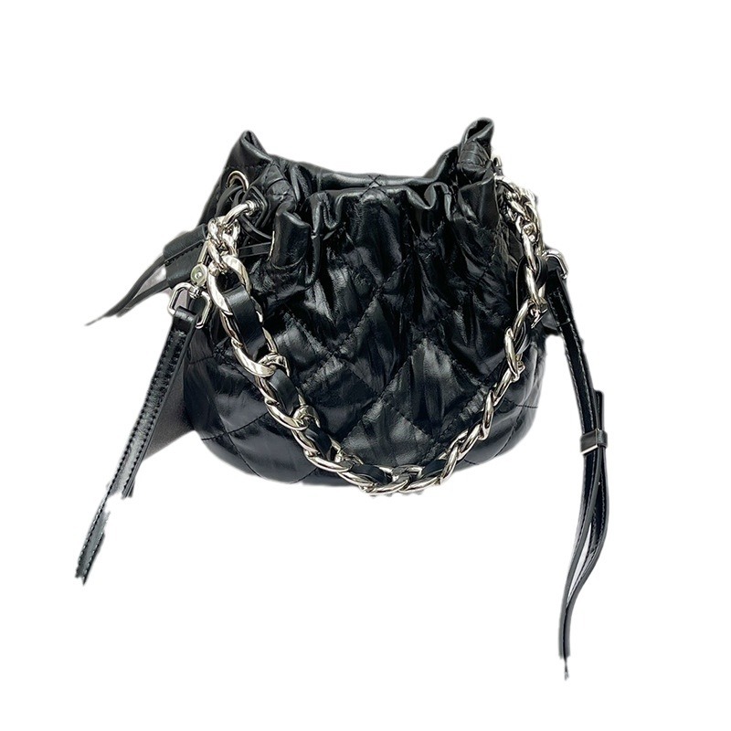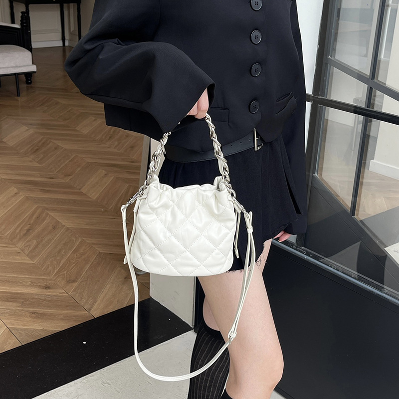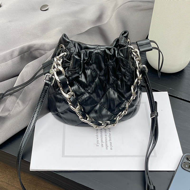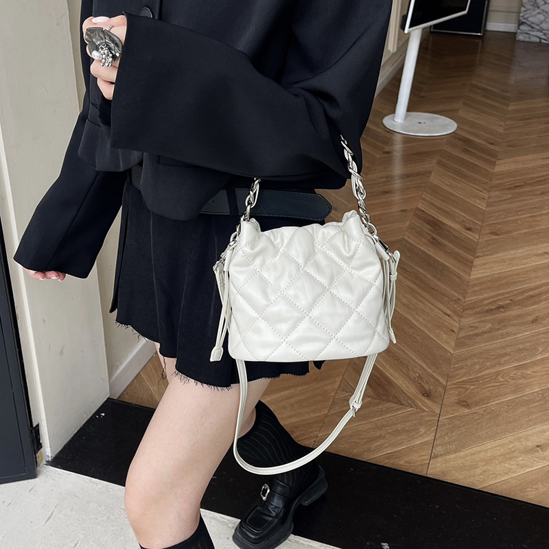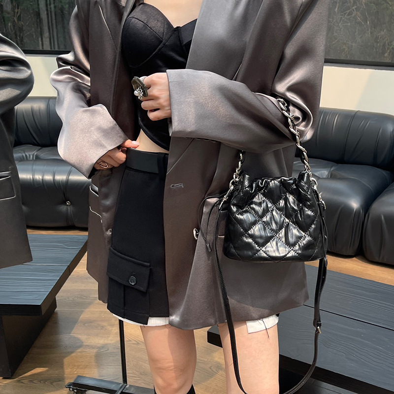 2024新款质感真皮菱格斜挎水桶包高级感百搭手提小链条单肩包女