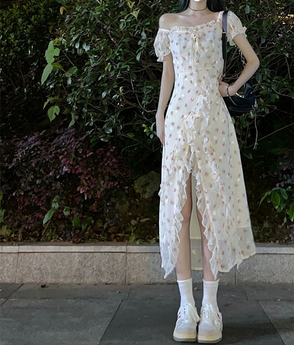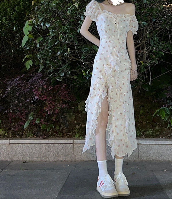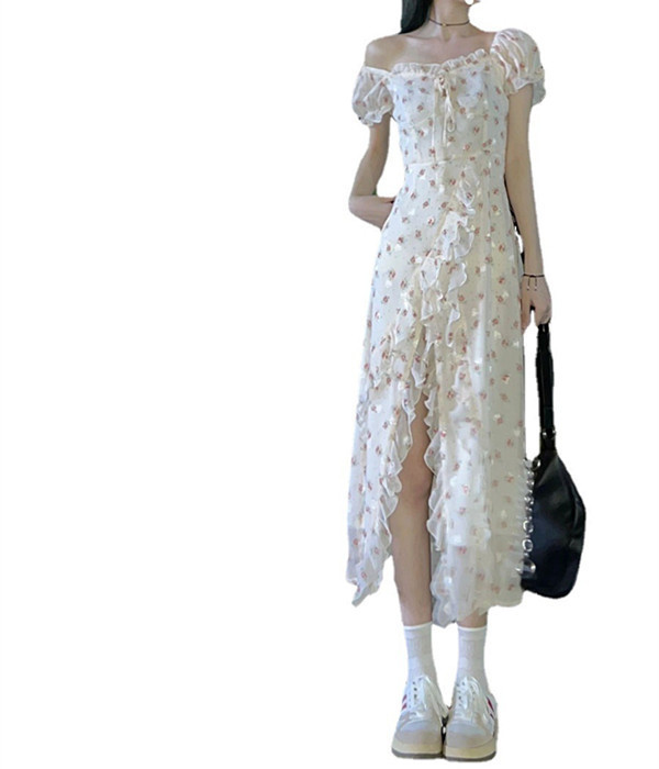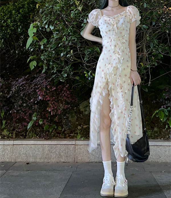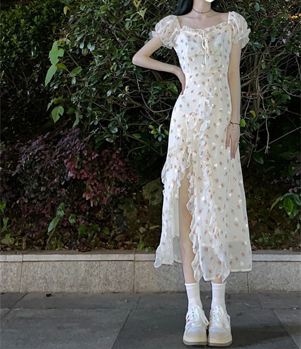 茶歇法式方领泡泡袖雪纺碎花连衣裙女夏季不规则开叉裙子仙女长裙