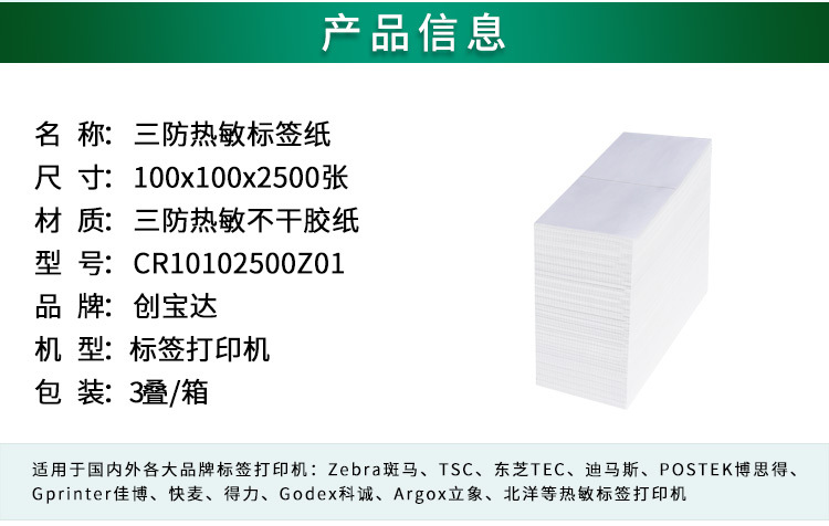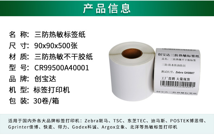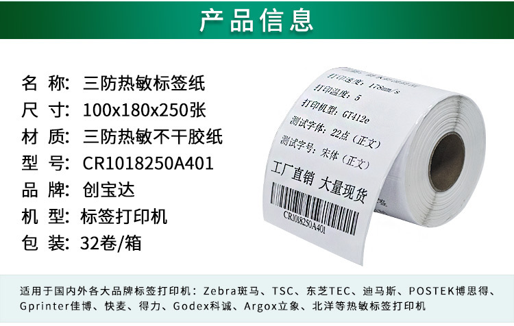 深圳创宝达科技有限公司主要生产:不干胶标签、热敏标签、热敏合成纸标签、铜板纸不干胶标签、PET合成纸标签、哑银龙标签、遇水变红标签、冷库冷链用耐低温冷库标签、防水标签、耐高温标签等,可生产卷装、单张、折叠等以满足国内外客户的不同设备需求。