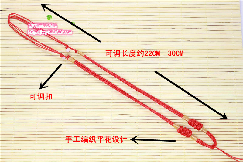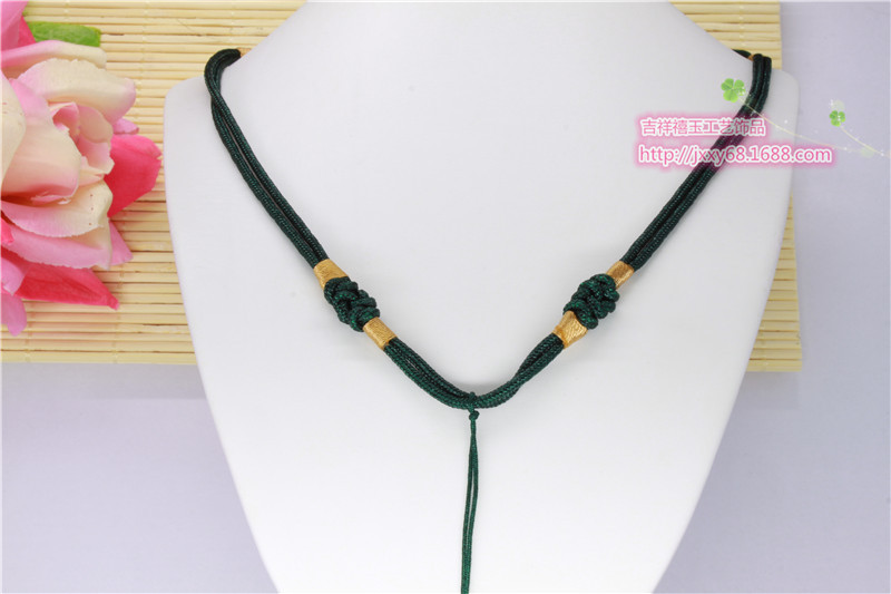 【材质】:台湾玉线 【规格】:项链挂绳长短可以调节,调节范围为:22cm~30cm 【用途】:可用于挂金器、银器、玉器、陶瓷器、饰品配件等吊坠用 【包装】:无单独的包装 【说明】:手工编织项链挂绳,出现线头或者毛边的情况实属正常只要用打火机烧一下就能弄好。