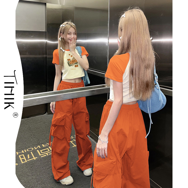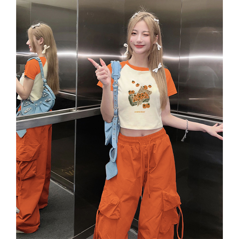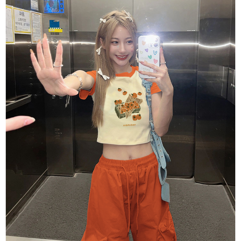 夏日多巴胺穿搭短款橘色插肩短袖t恤女復古bm甜辣設計感小眾上衣