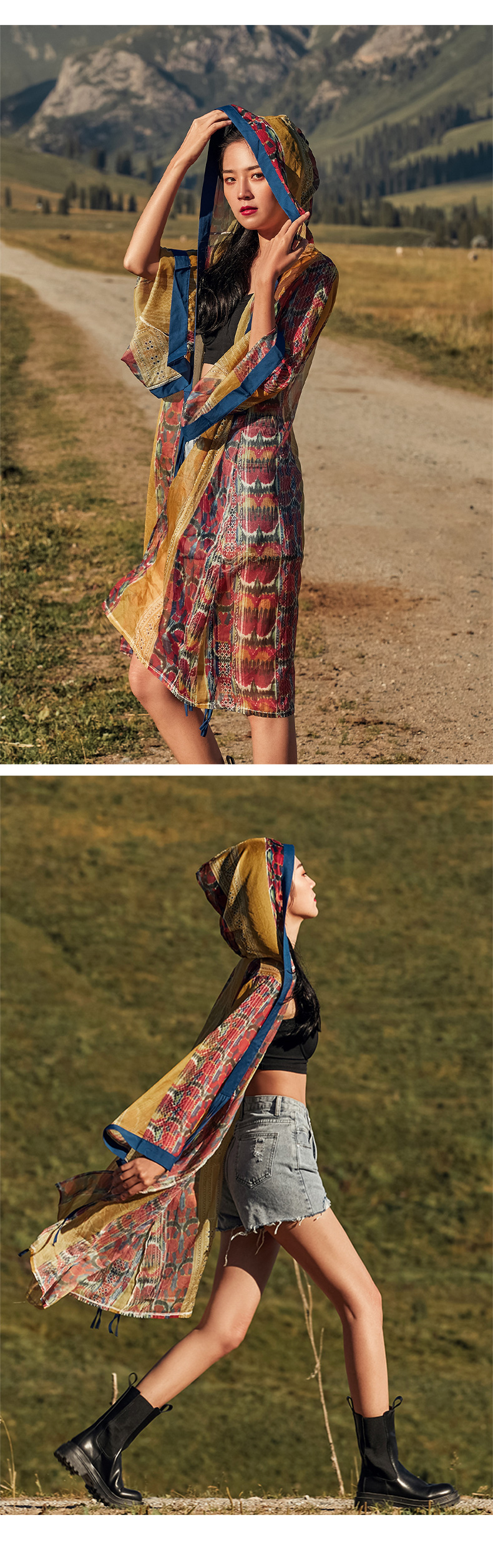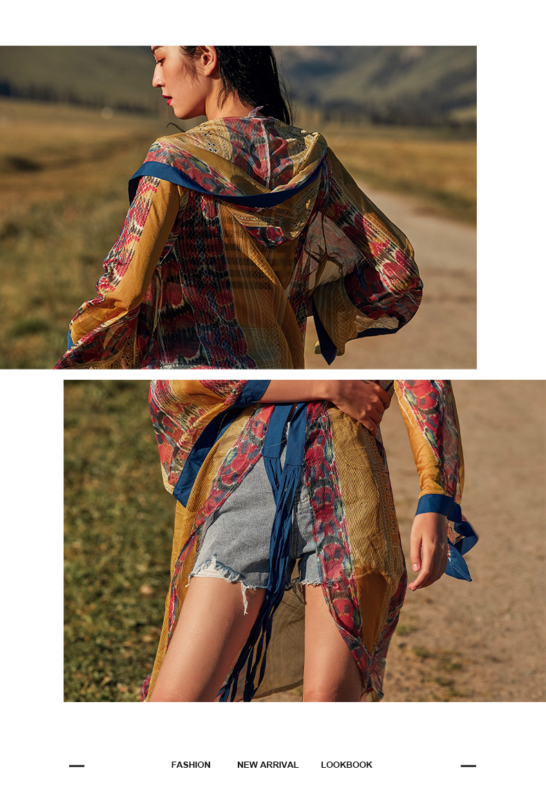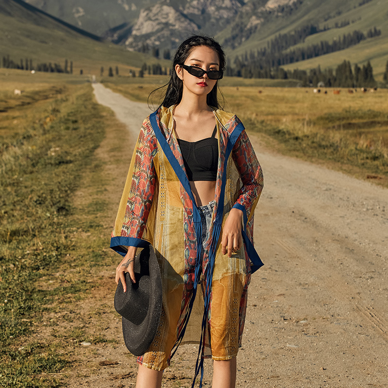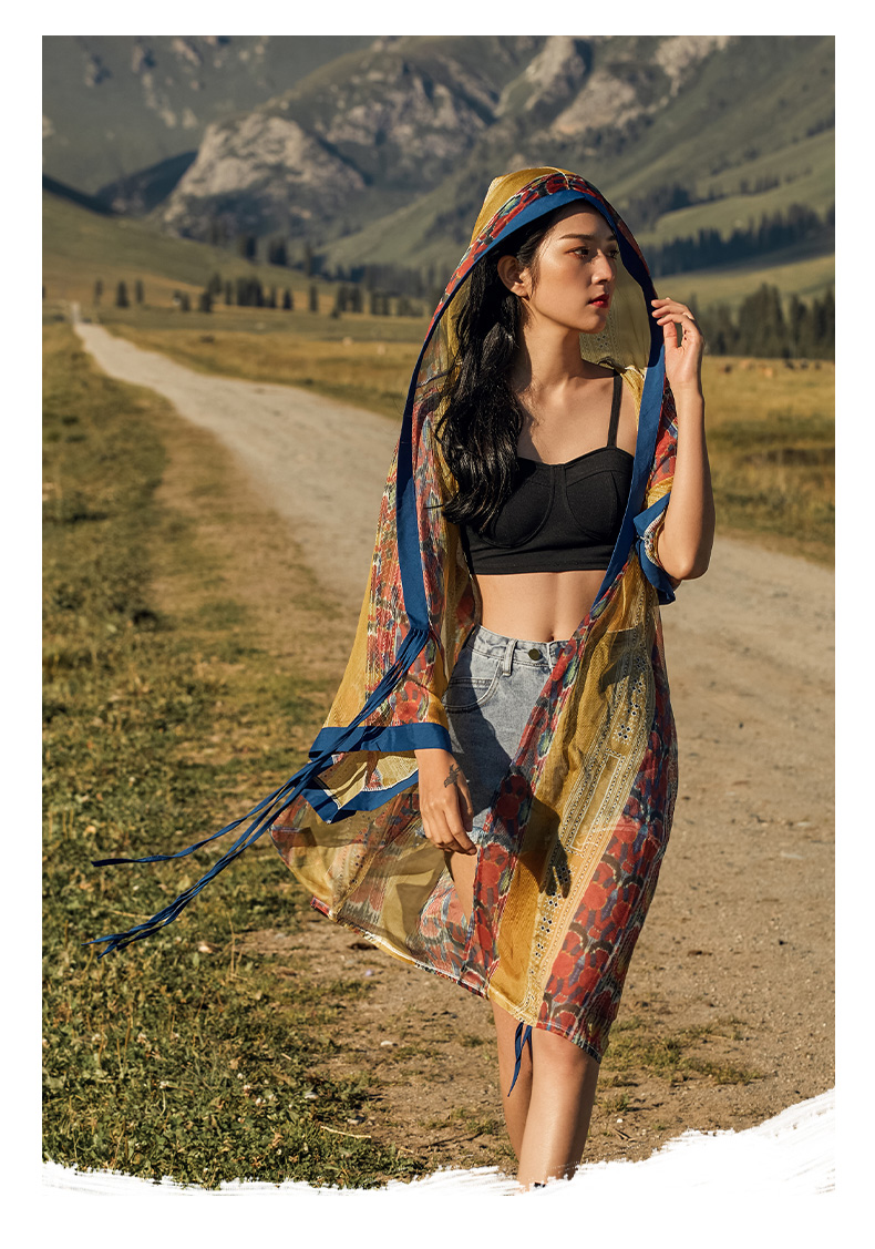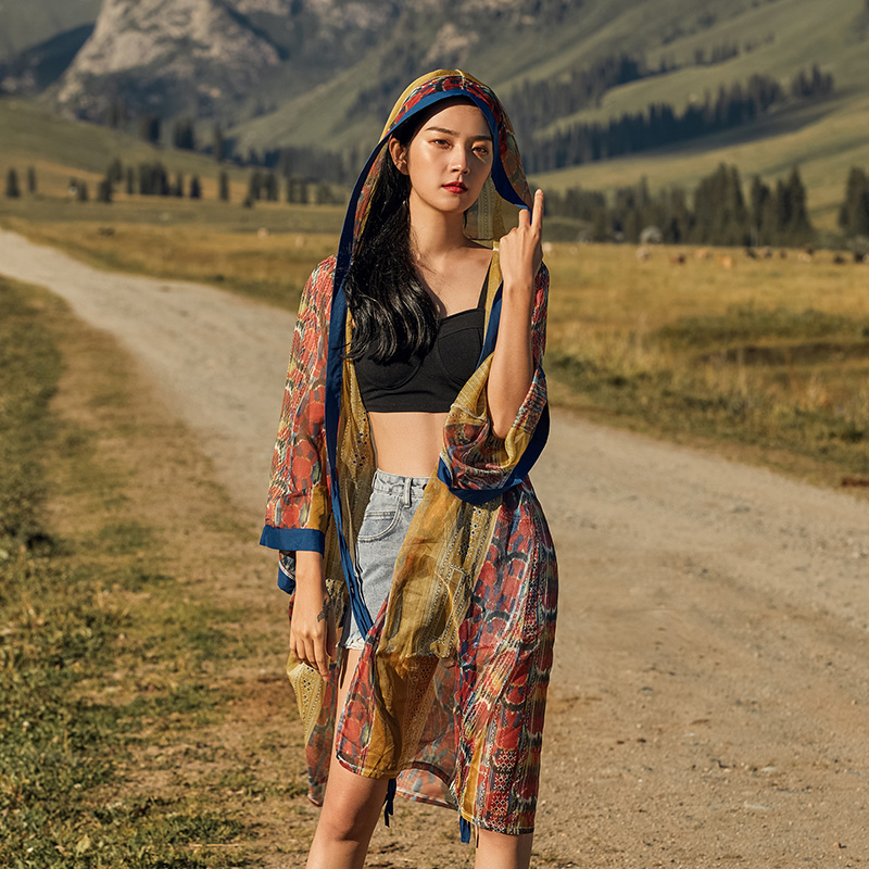 波西米亞雪紡沙灘防曬連帽開衫女薄款海邊度假長版長袖外搭大尺碼