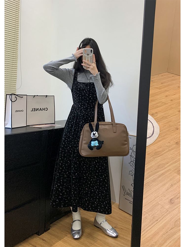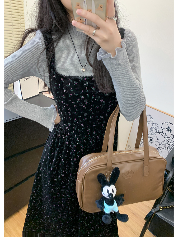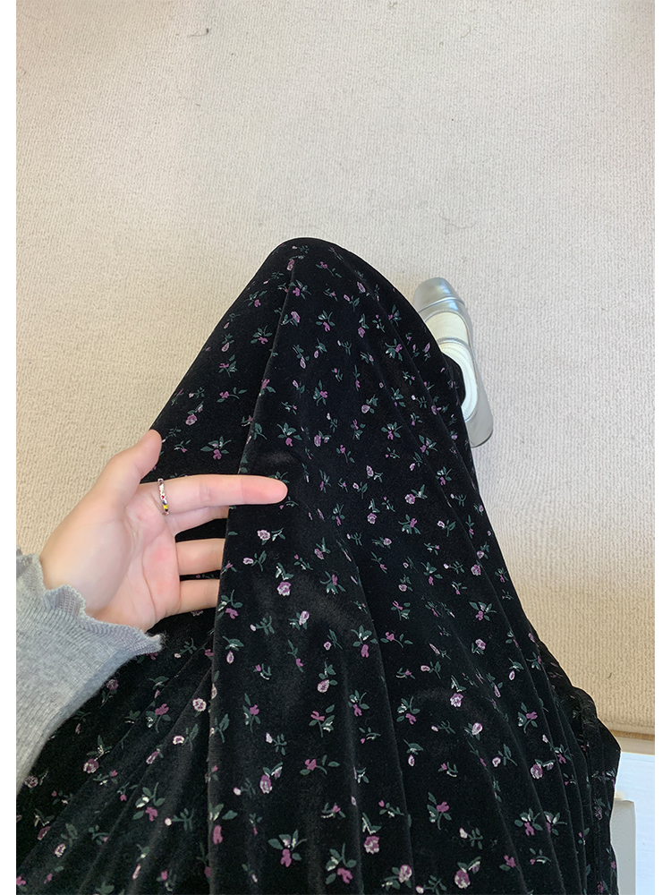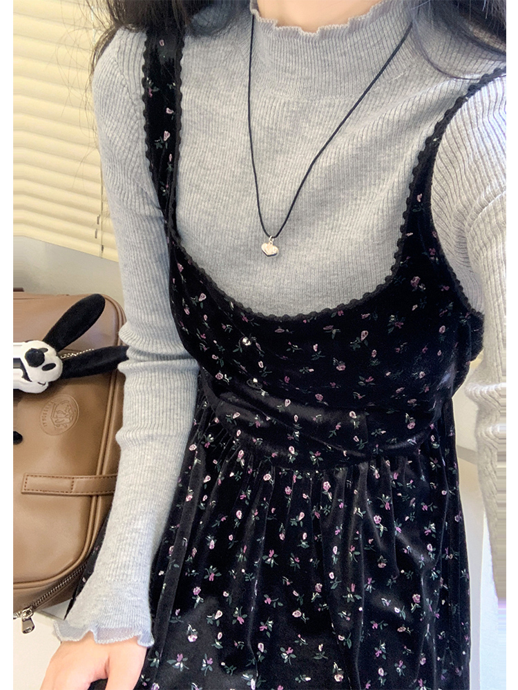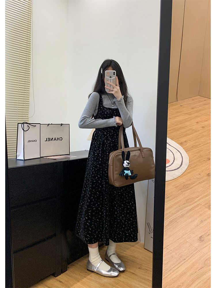 心動百利甜復古碎花絲絨洋裝女冬大方領收腰吊帶背心長裙