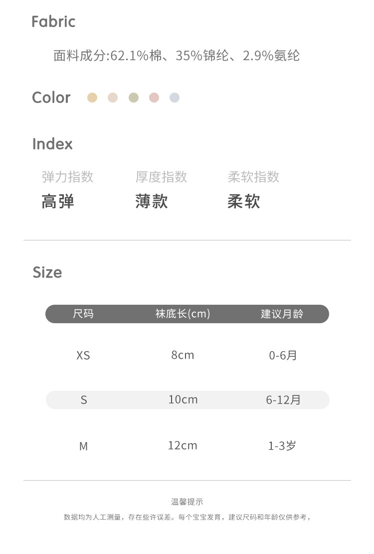 童袜尺码 XS码0-6个月,S码6-12个月,M码1-3岁