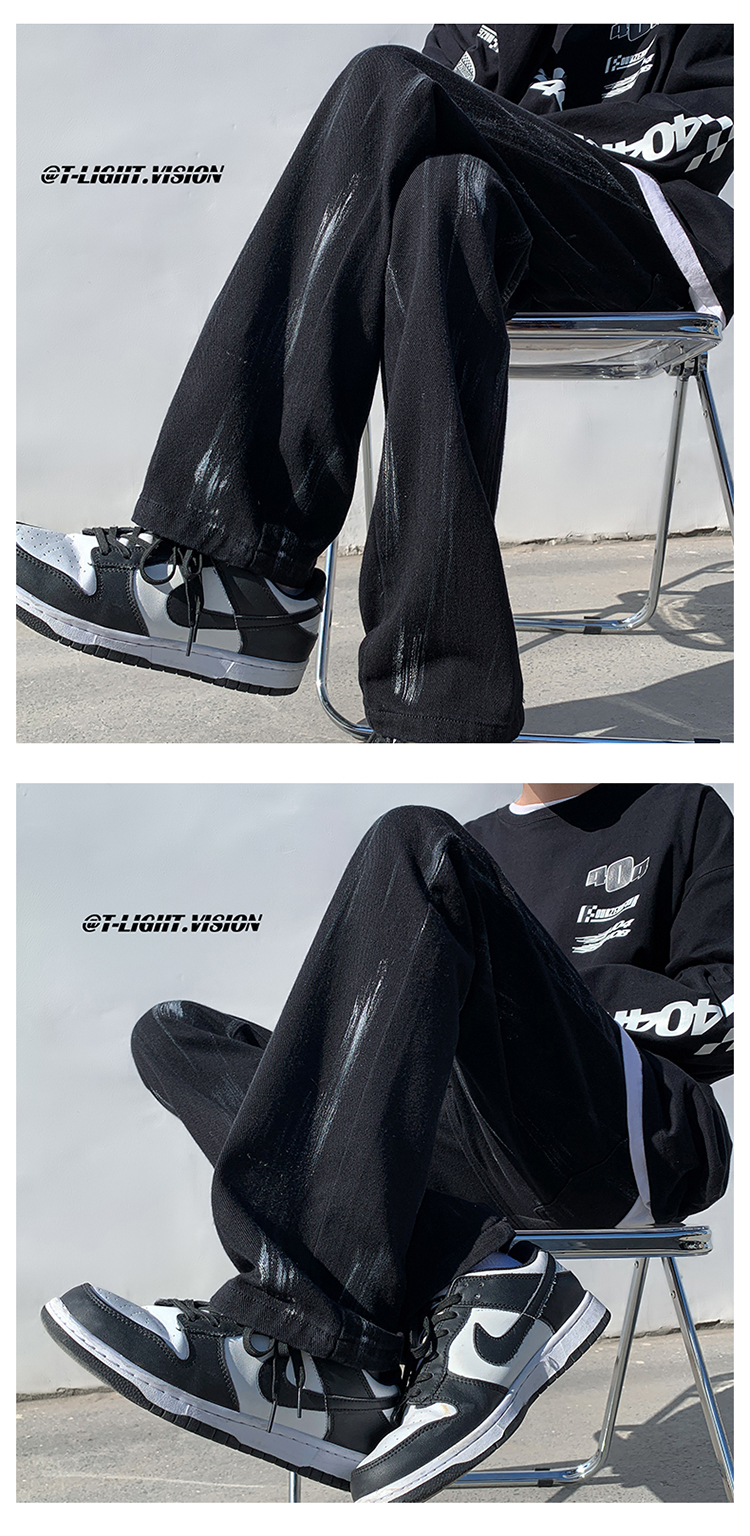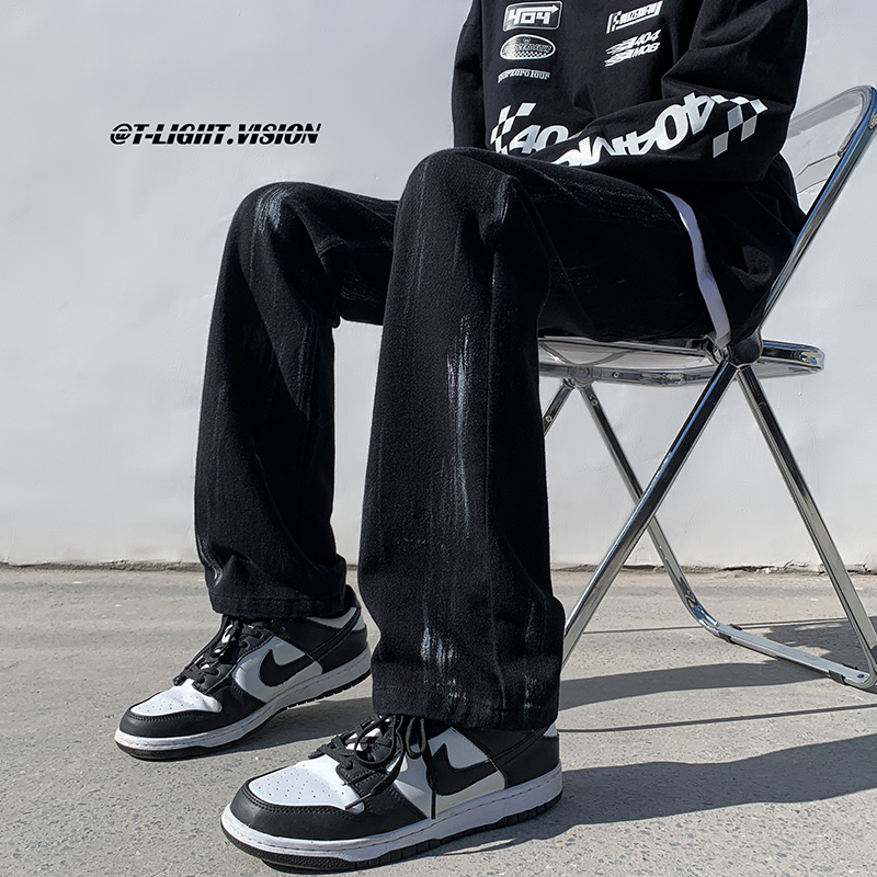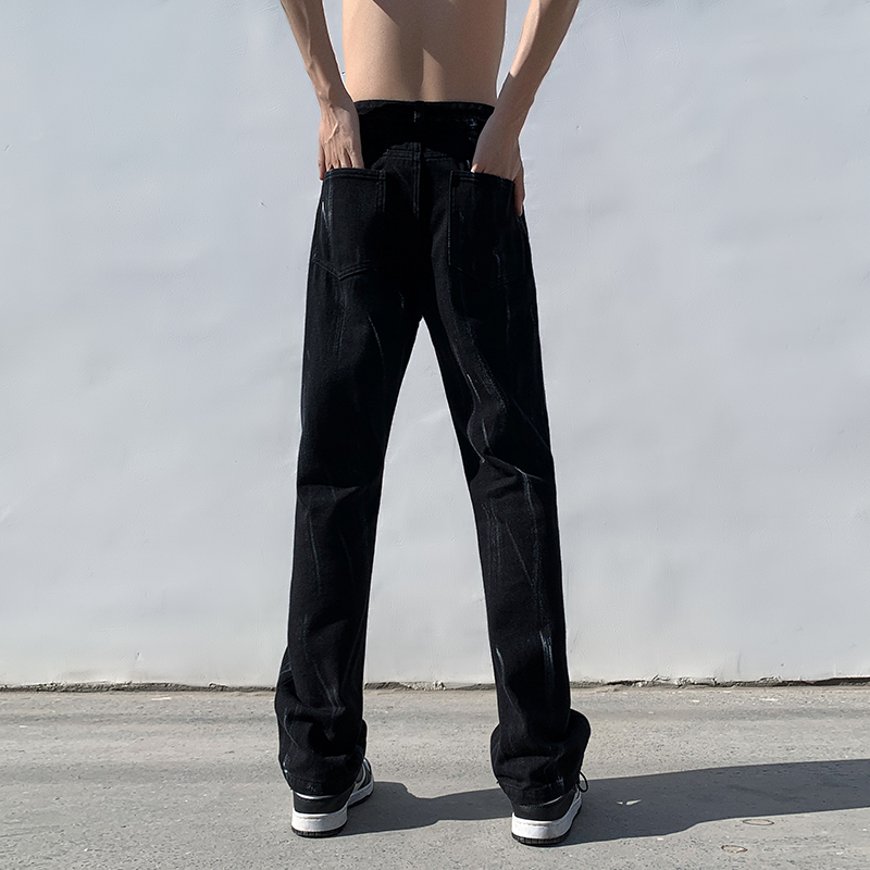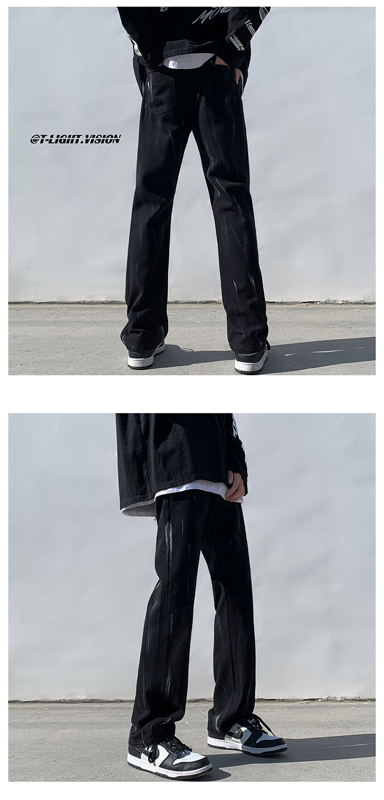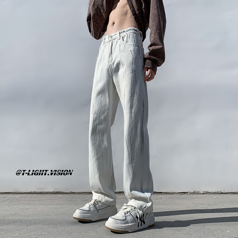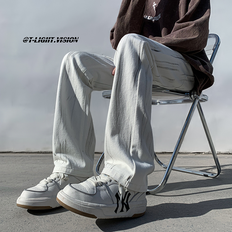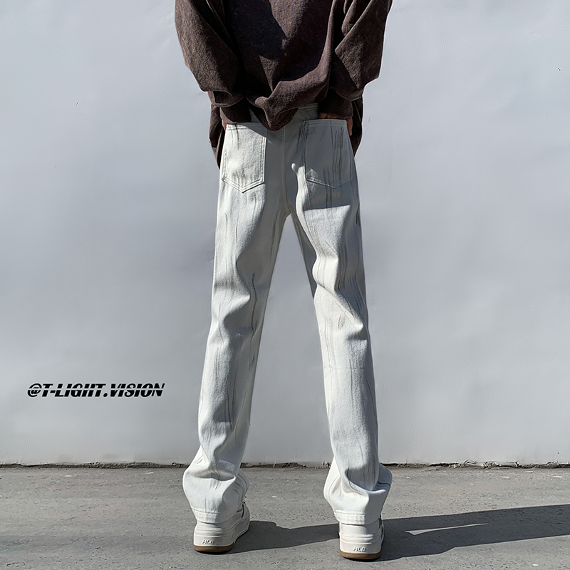 白色紮染牛仔褲男款修身美式vibe褲子高街潮牌直筒hiphop微喇叭褲