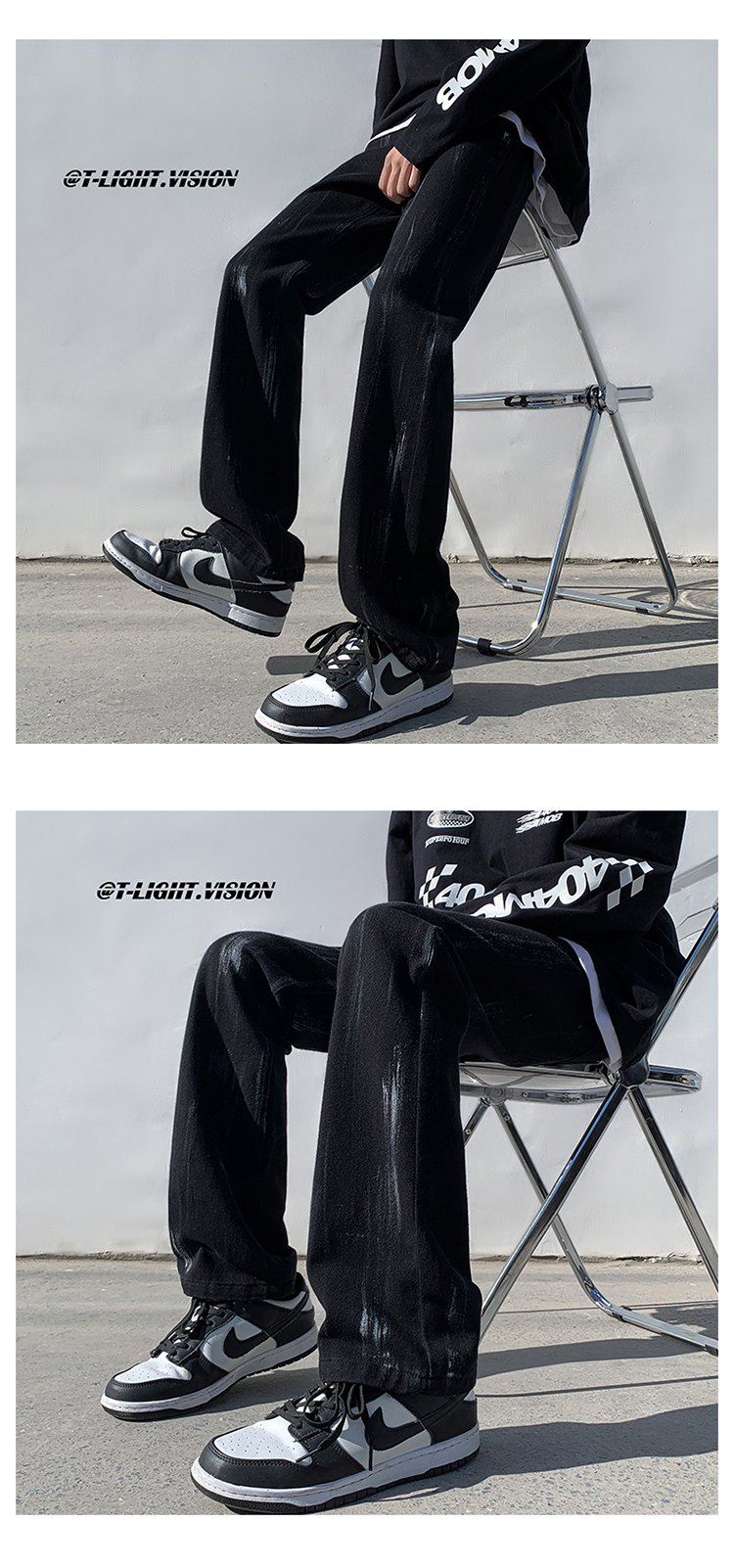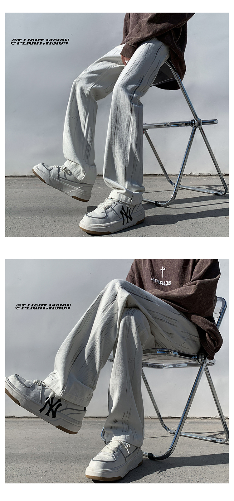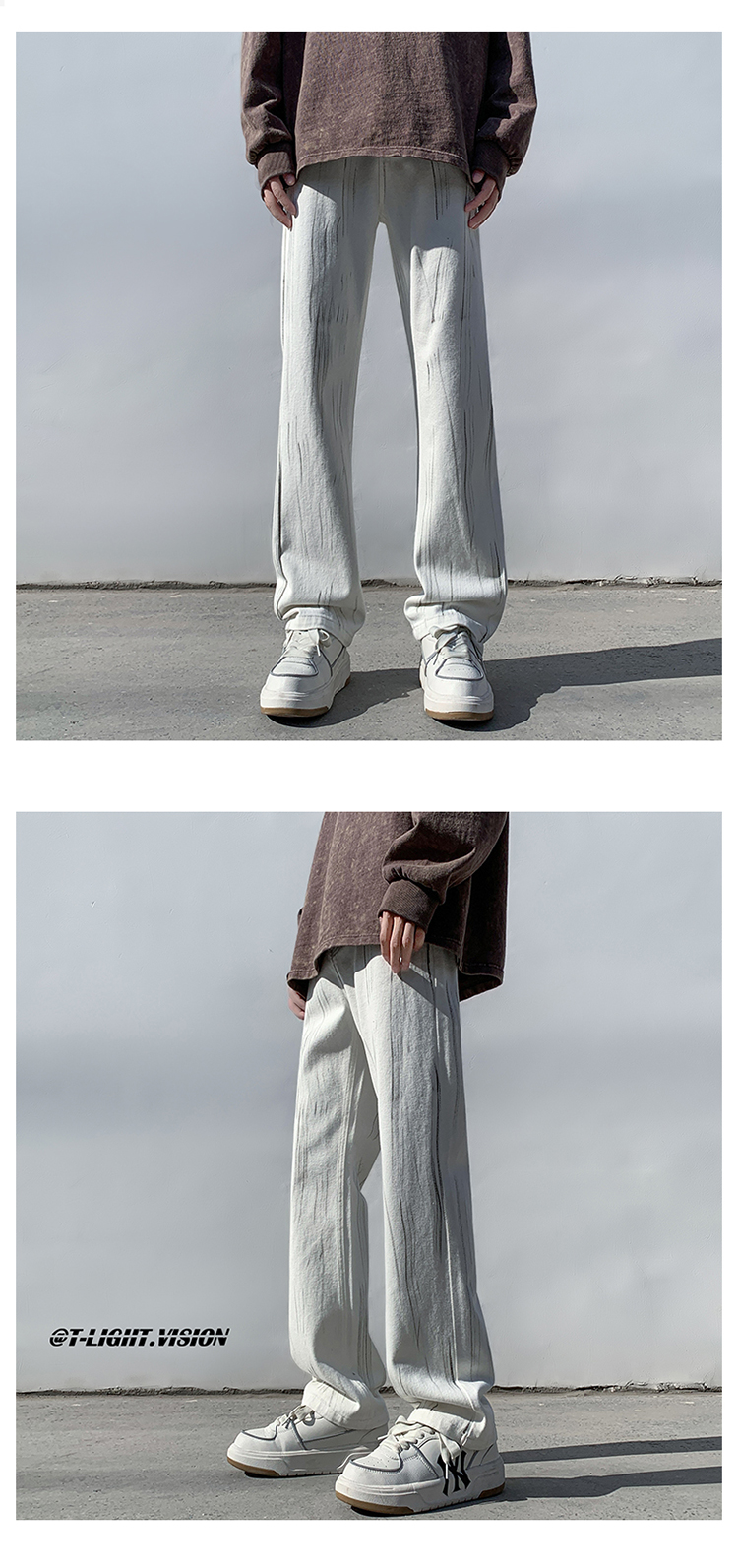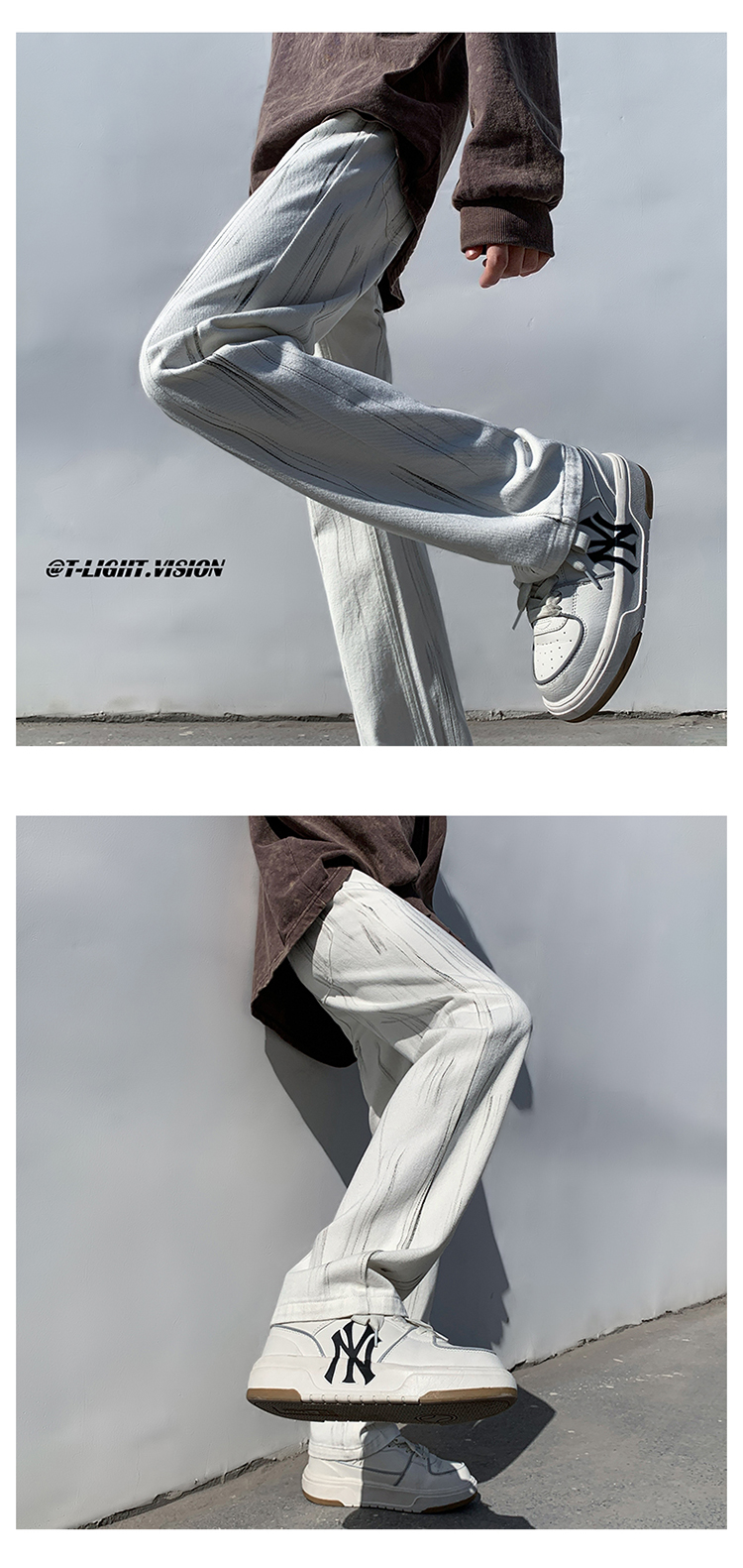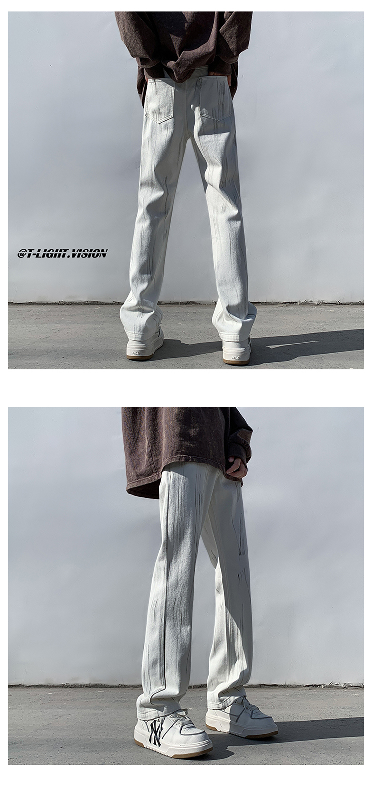 白色紮染牛仔褲男款修身美式vibe褲子高街潮牌直筒hiphop微喇叭褲