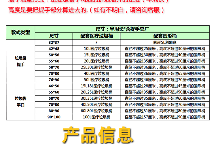 颜色 手提32*37/配套4L内利器盒100个-,手提42*48/10L以内桶黄色100个,手提50*56/15L桶黄色100个,手提55*60/20L桶黄色100个,手提58*70/30L桶黄色100个,手提70*80/40L桶黄色100个,手提76*90/50/70L桶黄色100个,平口46*50/15/18L桶黄色100个,平口50*56/20L桶黄色100个,平口55*60/20L桶黄色100个,平口58*70/30/40L桶黄色100个,平口70*80/50L桶黄色100个,平口80*90/60/80L桶黄色100个,平口90*100/100L特厚黄色100个,平口110*120/120L特厚黄色100个,平口120*140/240L特厚黄色100个