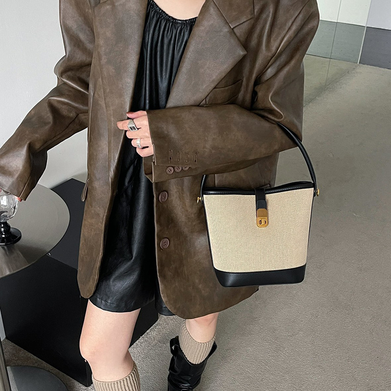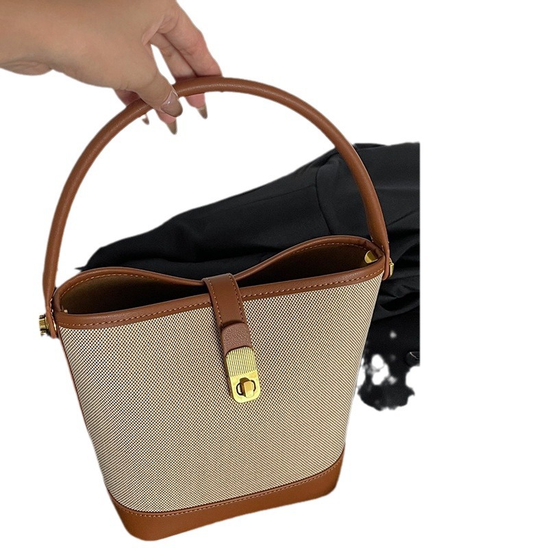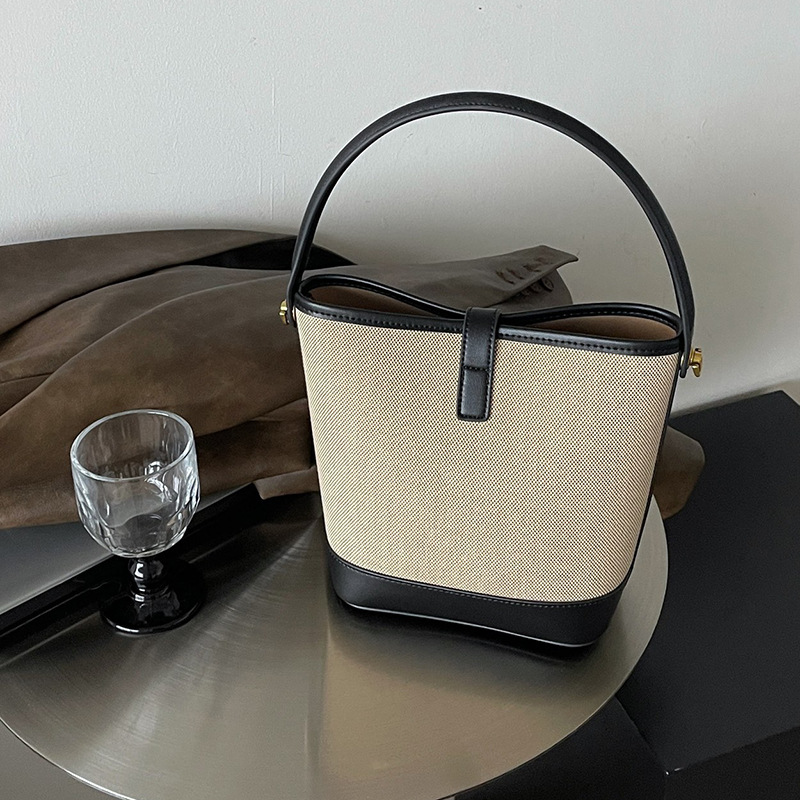 2024新款单肩包牛皮拼接帆布水桶包高级感小众简约手提斜挎女包