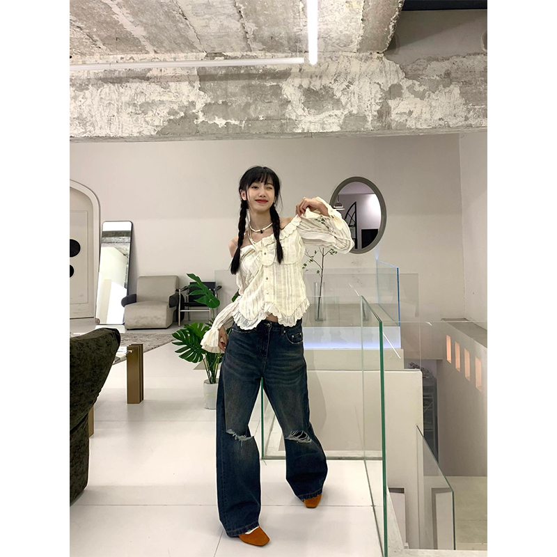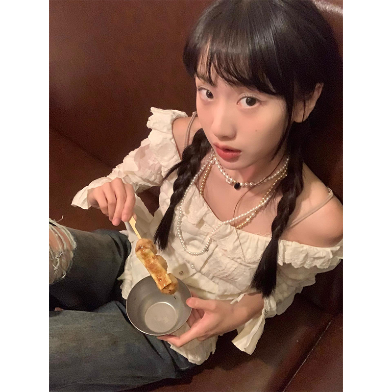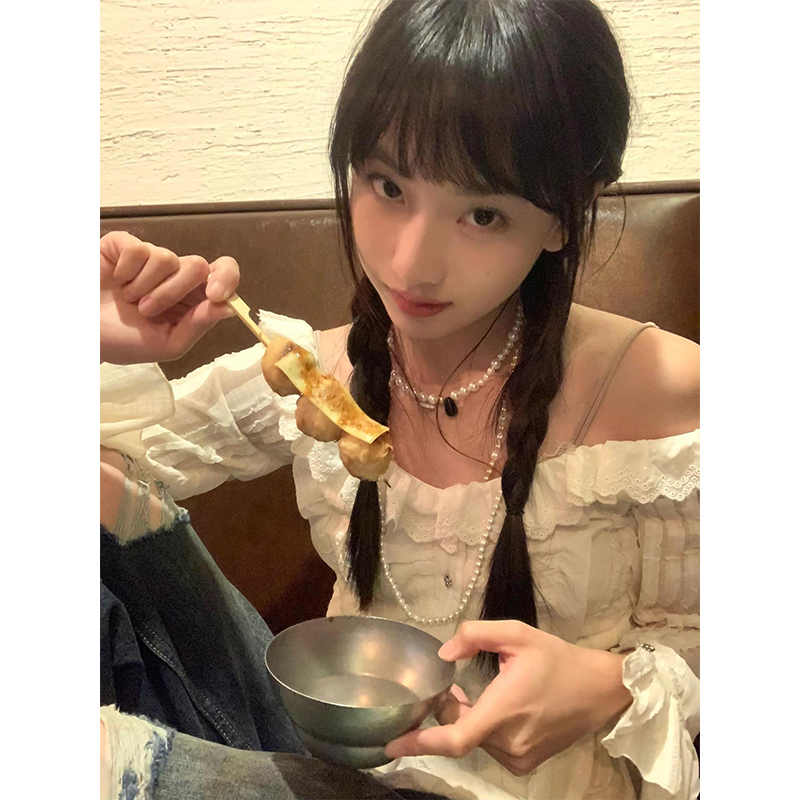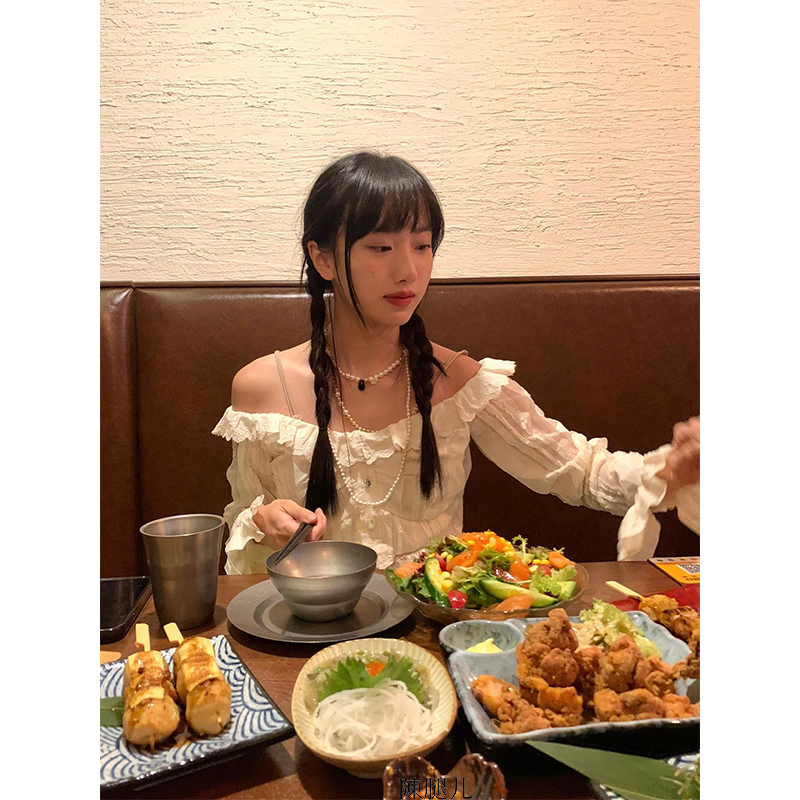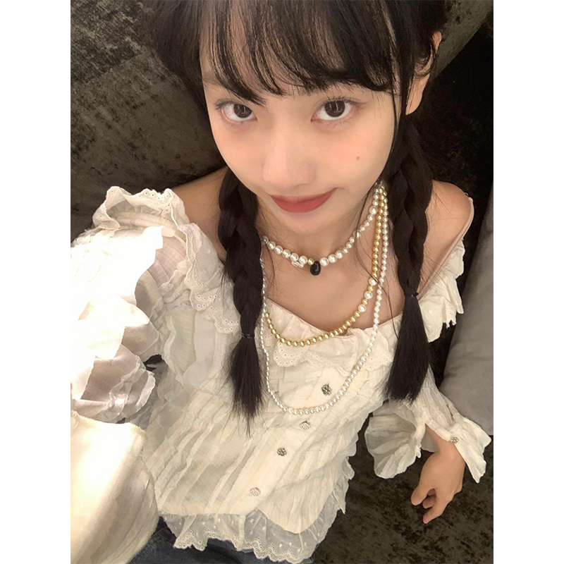 陳小腿~Turn left 法式復古氣質花邊一字露肩襯衫女設計感上衣ins