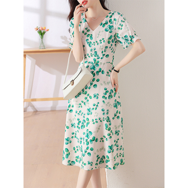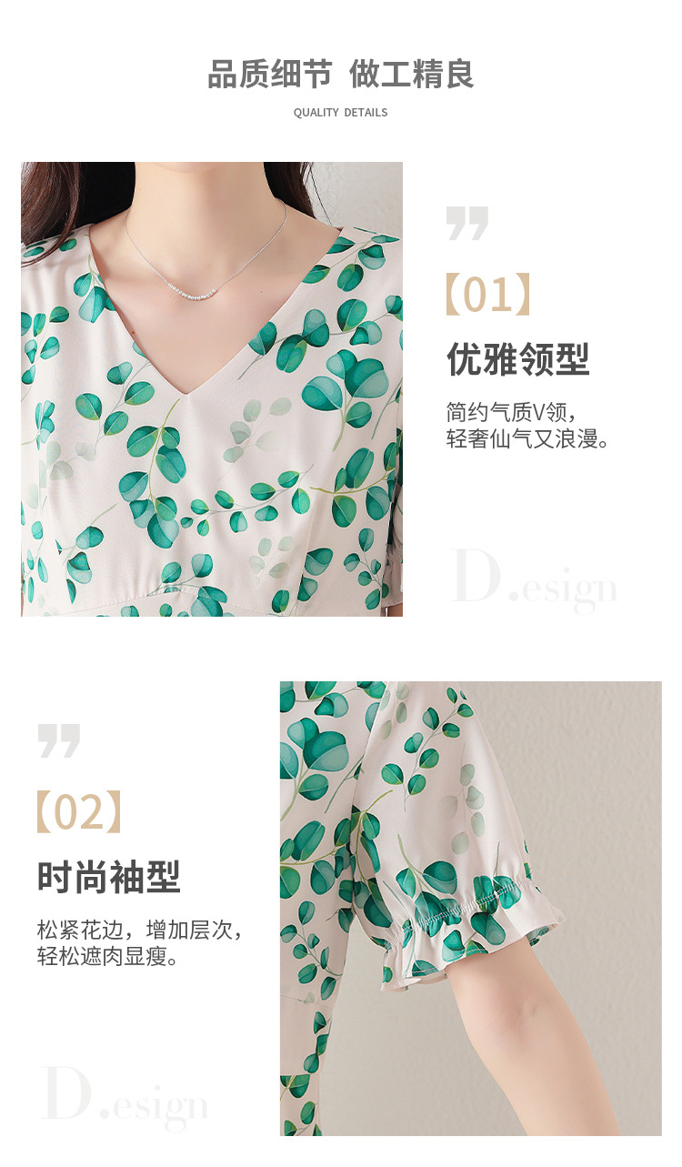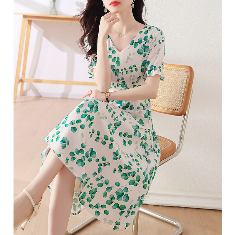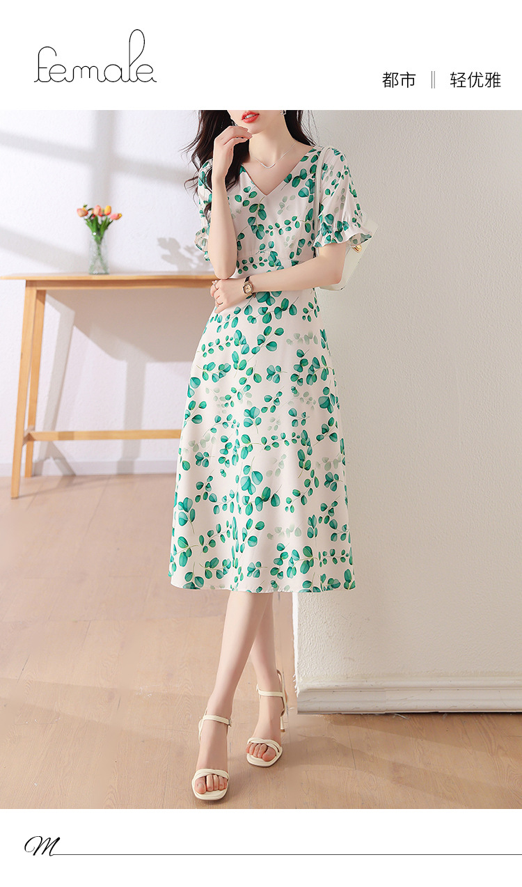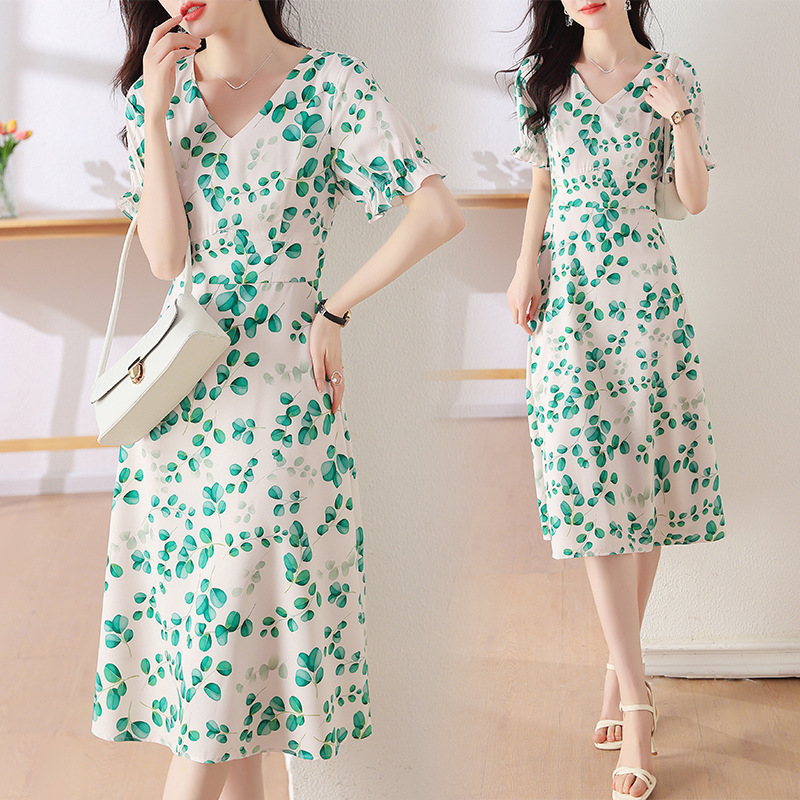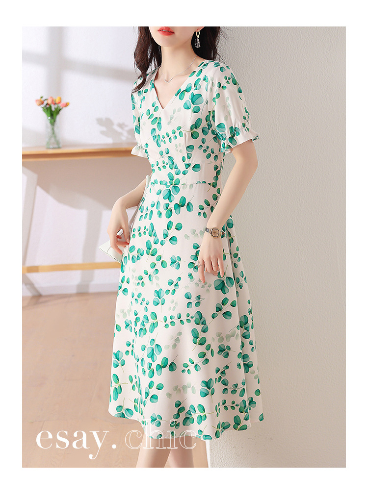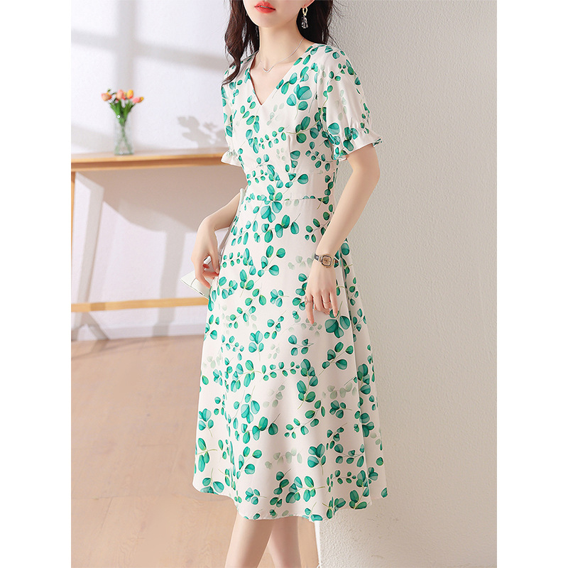 泡泡袖碎花连衣裙女夏装2023年新款夏季高级感短袖中长款v领裙子