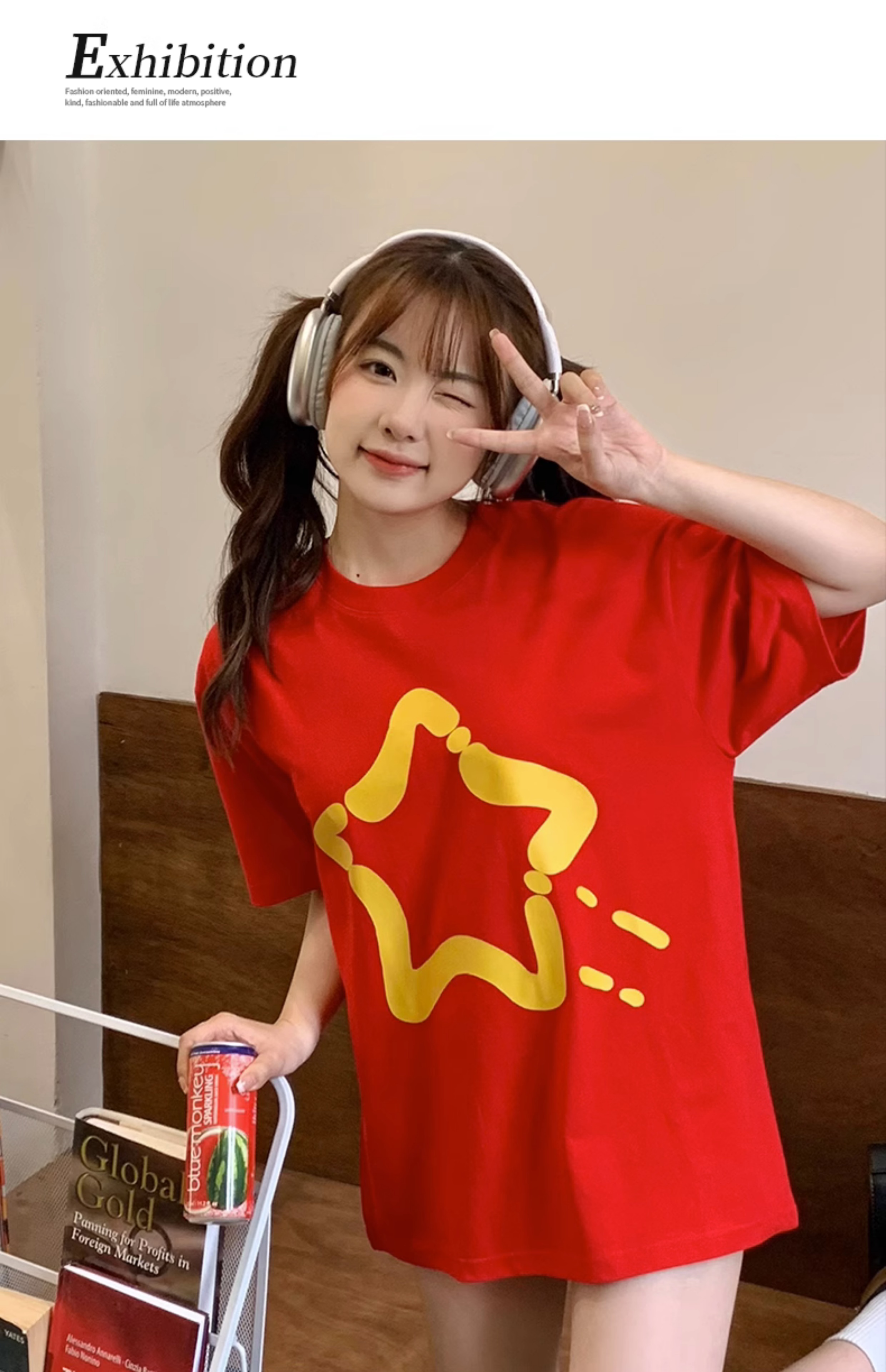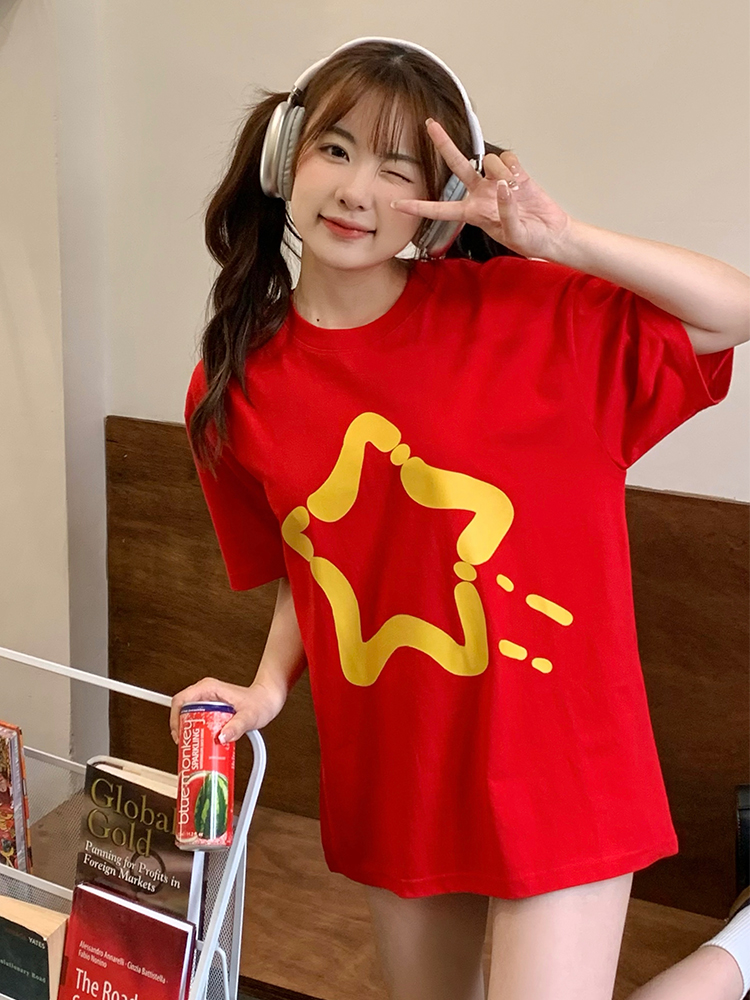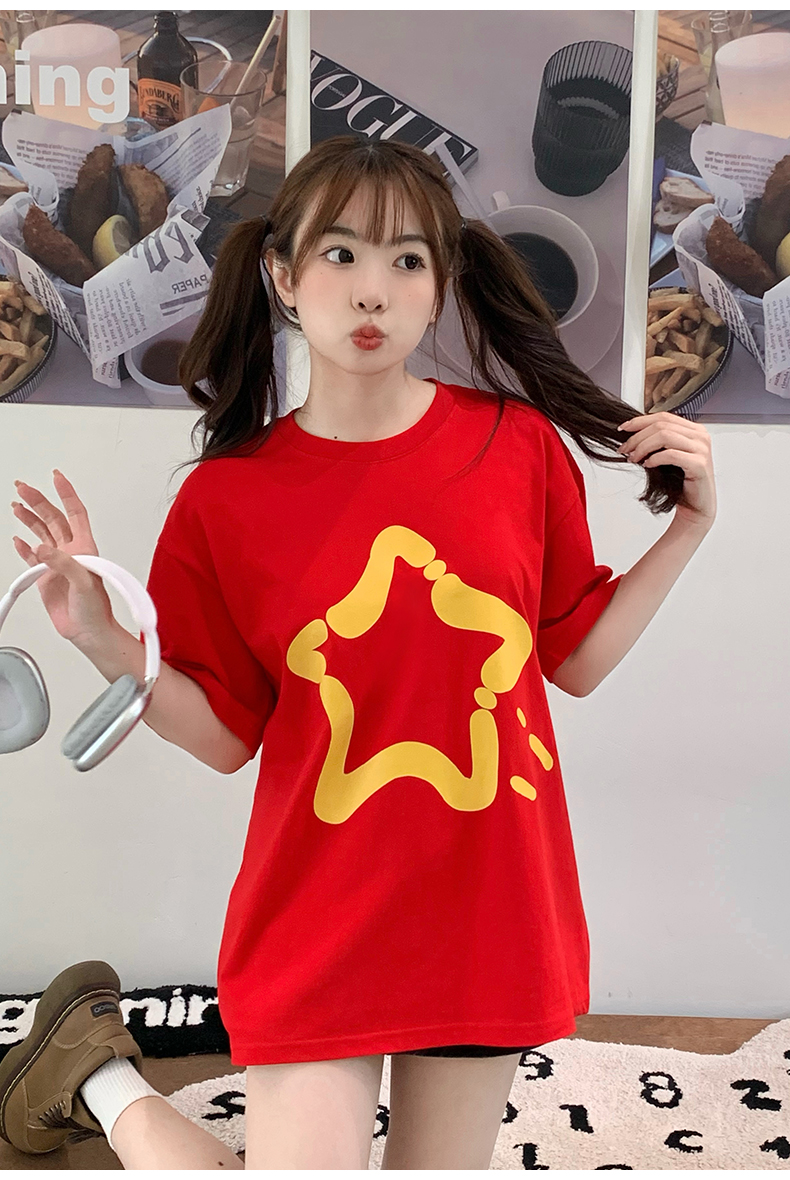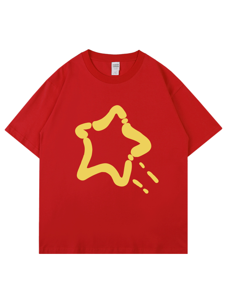 很潤工作室 潮牌五角星落肩短袖男女紅色T恤百搭純棉情侶T恤夏