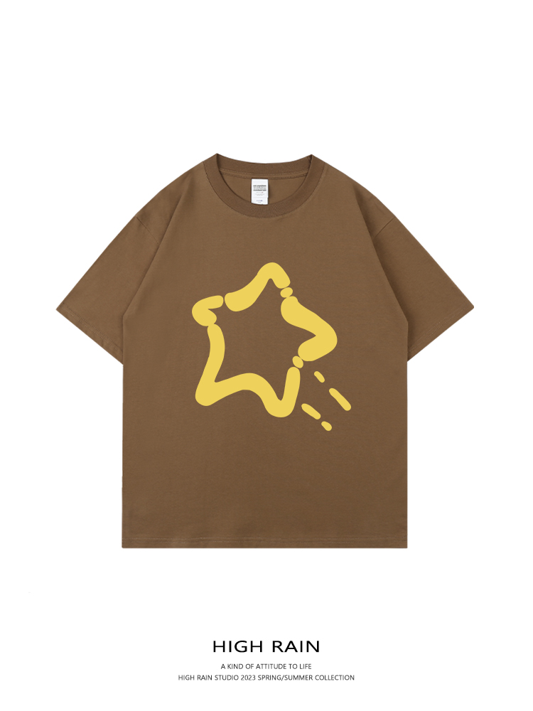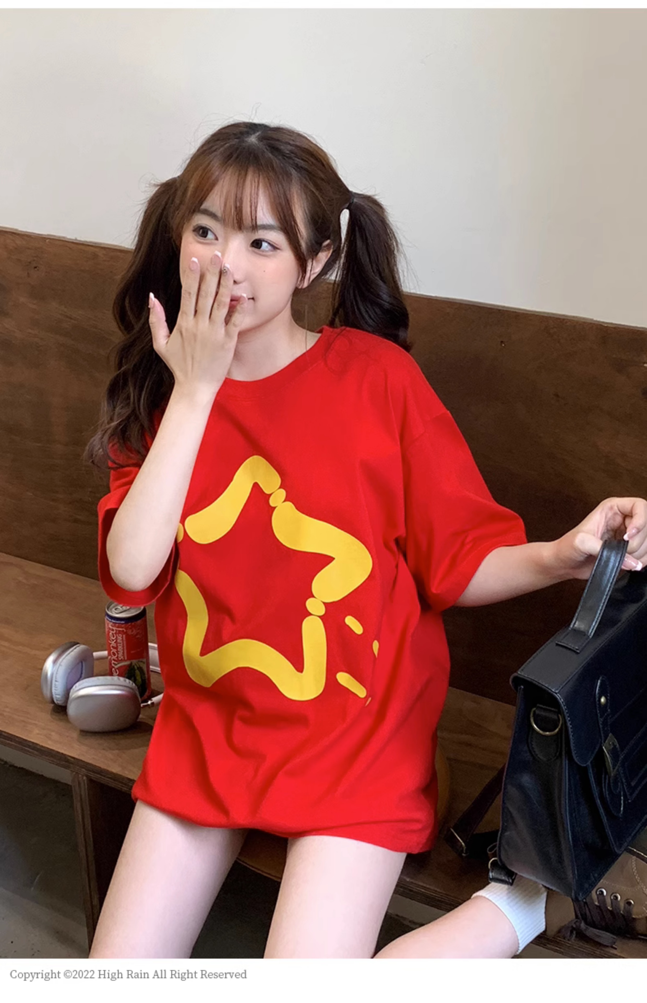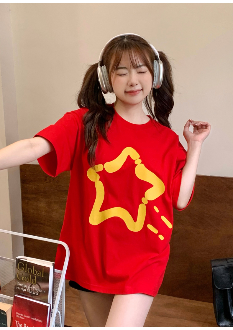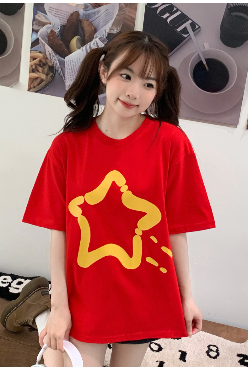 很潤工作室 潮牌五角星落肩短袖男女紅色T恤百搭純棉情侶T恤夏