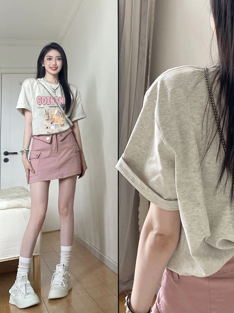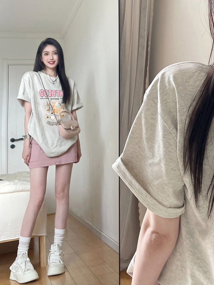 純棉短袖t恤女設計感小眾美式復古寬鬆顯瘦正肩上衣灰色半袖T恤
