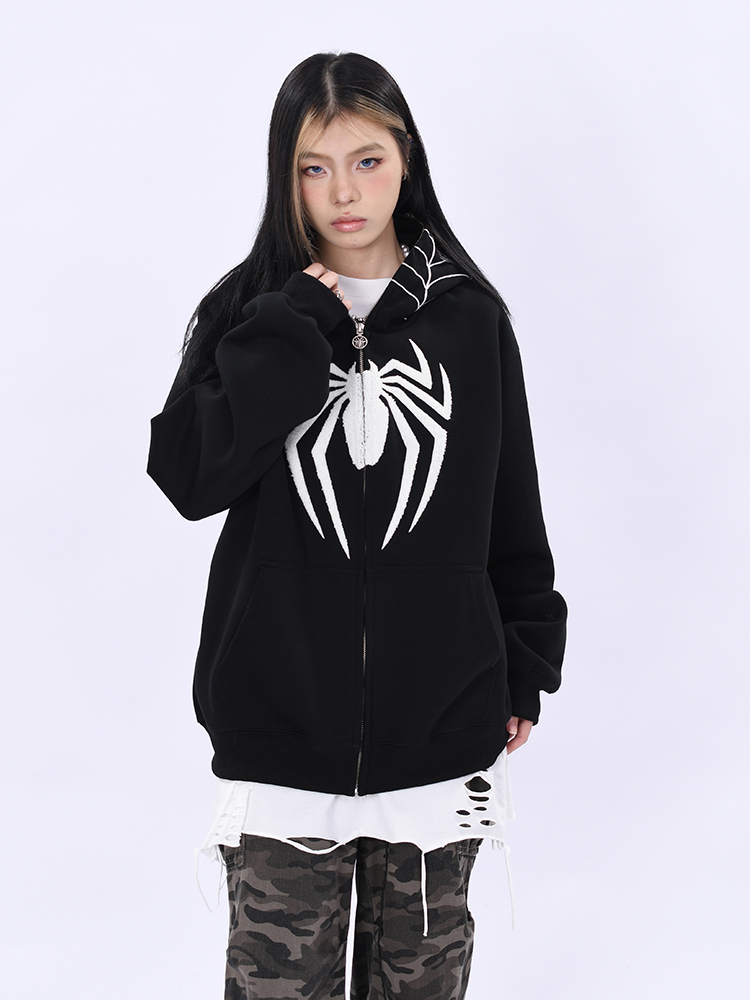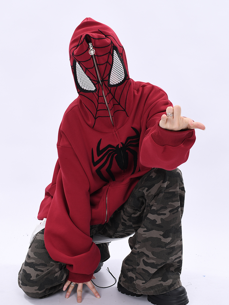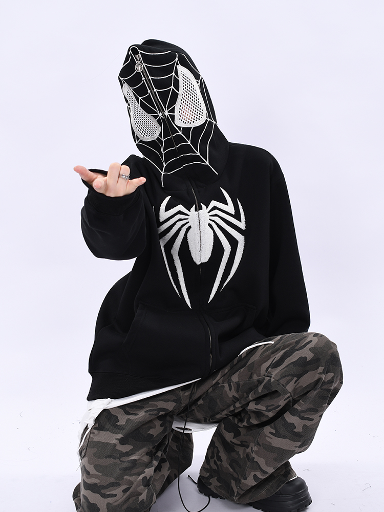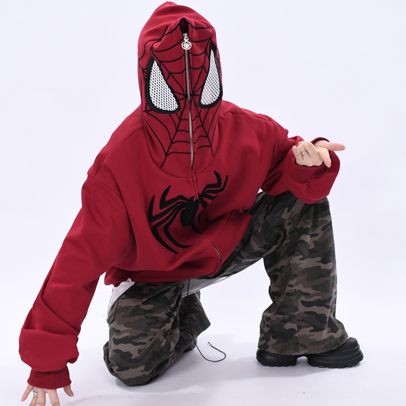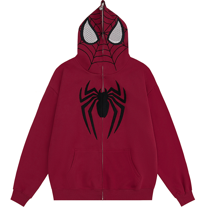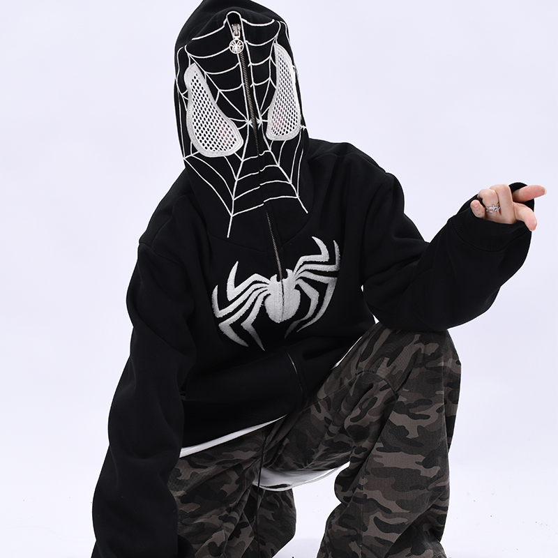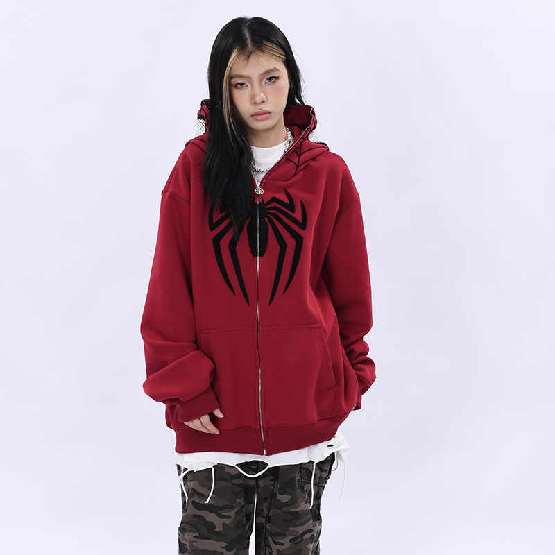 OV原創秋季高街復古蜘蛛人設計感連帽運動衫男女bf小眾寬鬆開衫外套