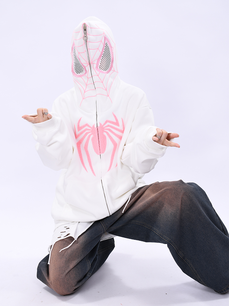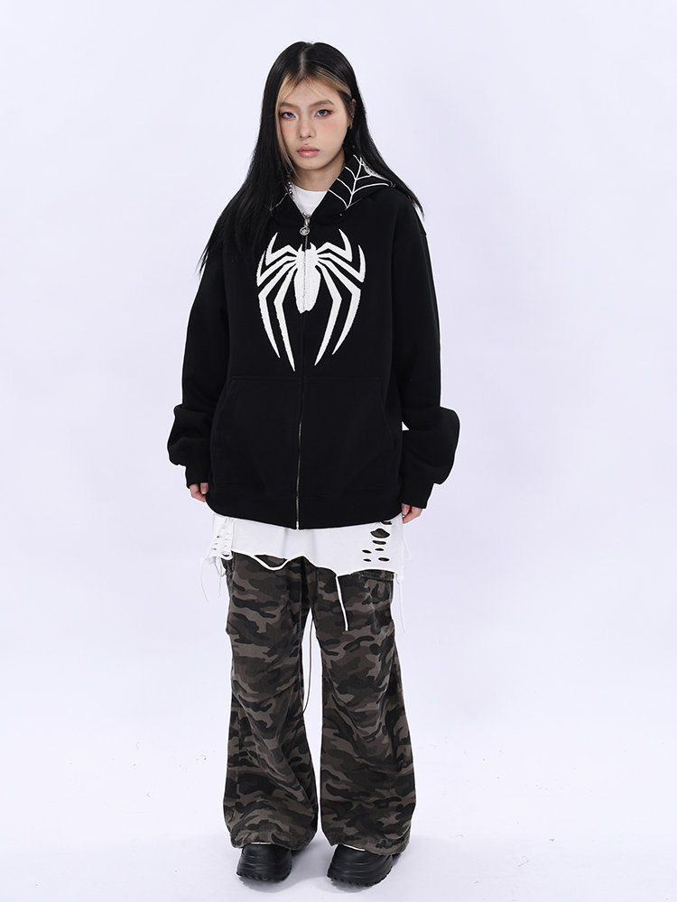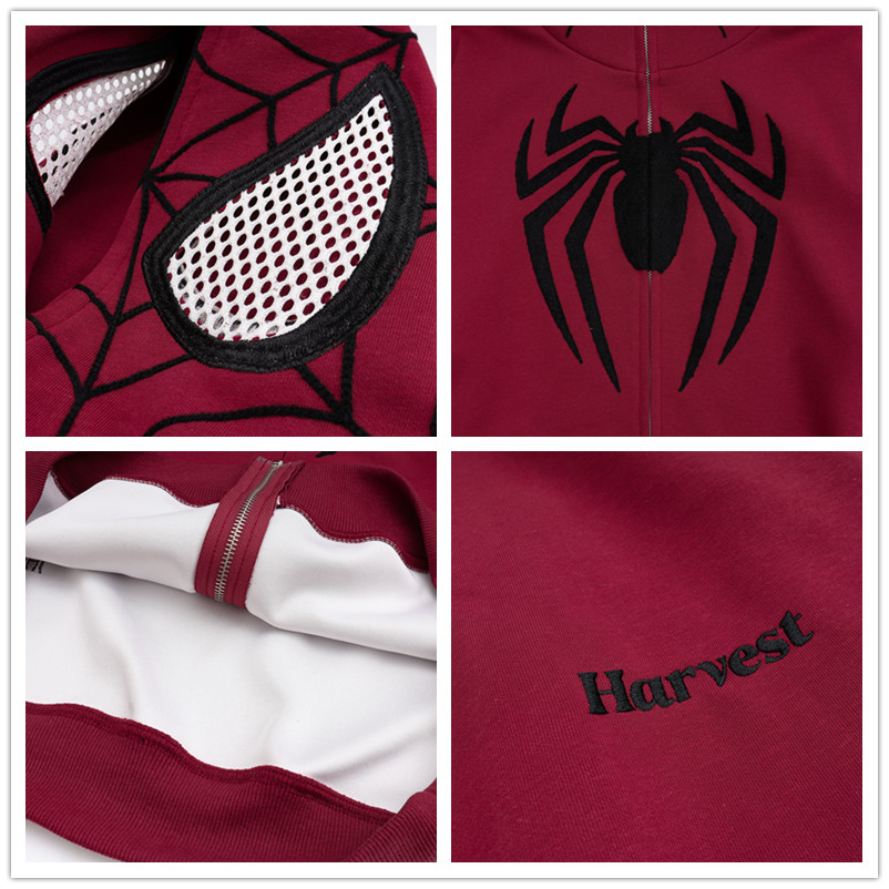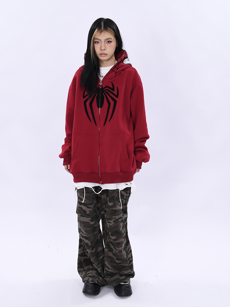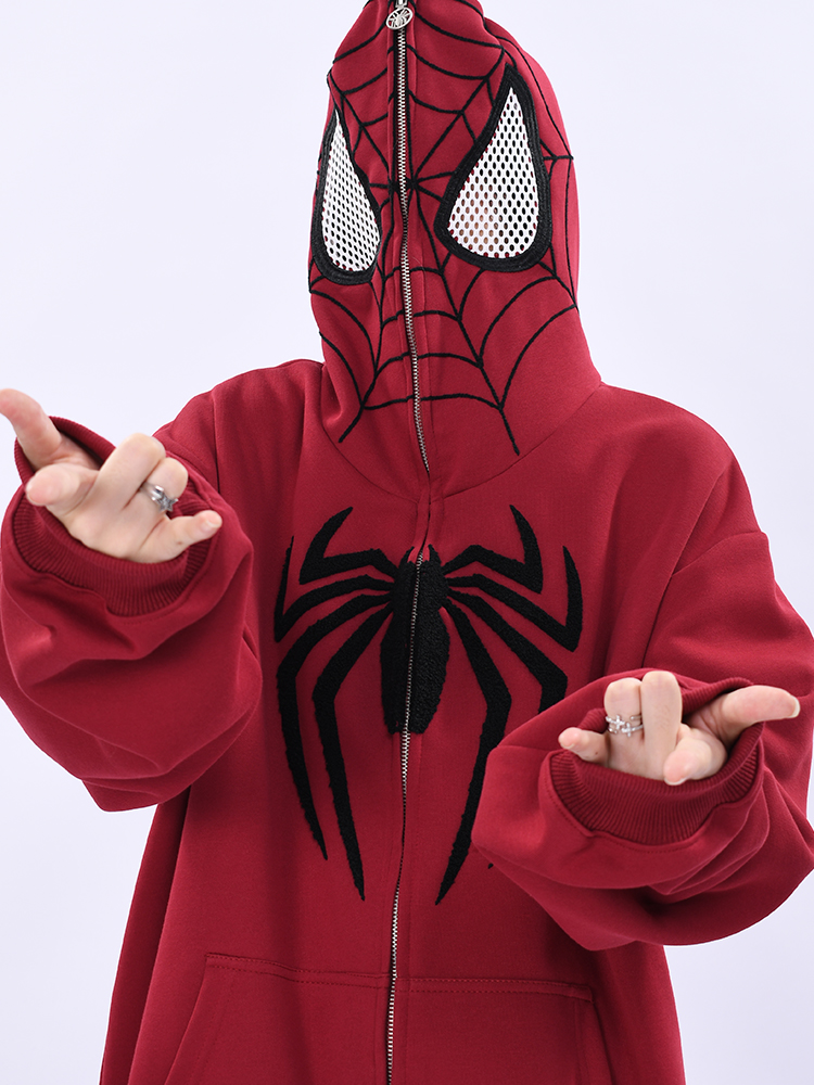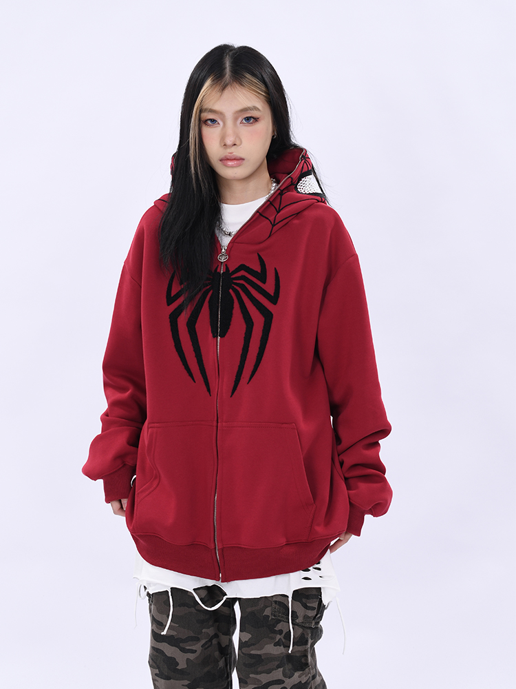 OV原創秋季高街復古蜘蛛人設計感連帽運動衫男女bf小眾寬鬆開衫外套