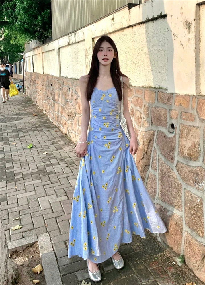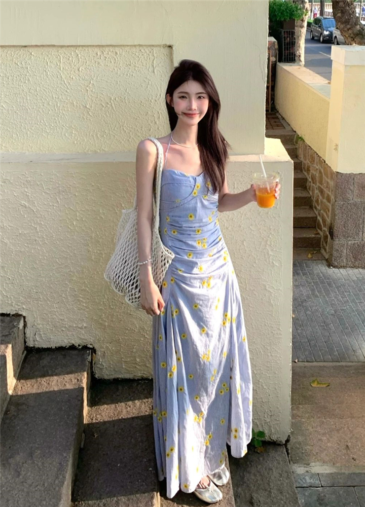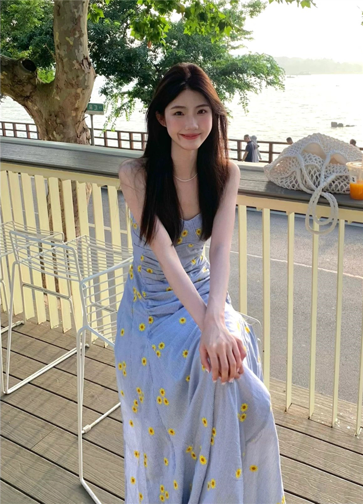 浪漫筆記優雅條紋掛頸吊帶洋裝女夏季海邊度假法式純欲露背長裙