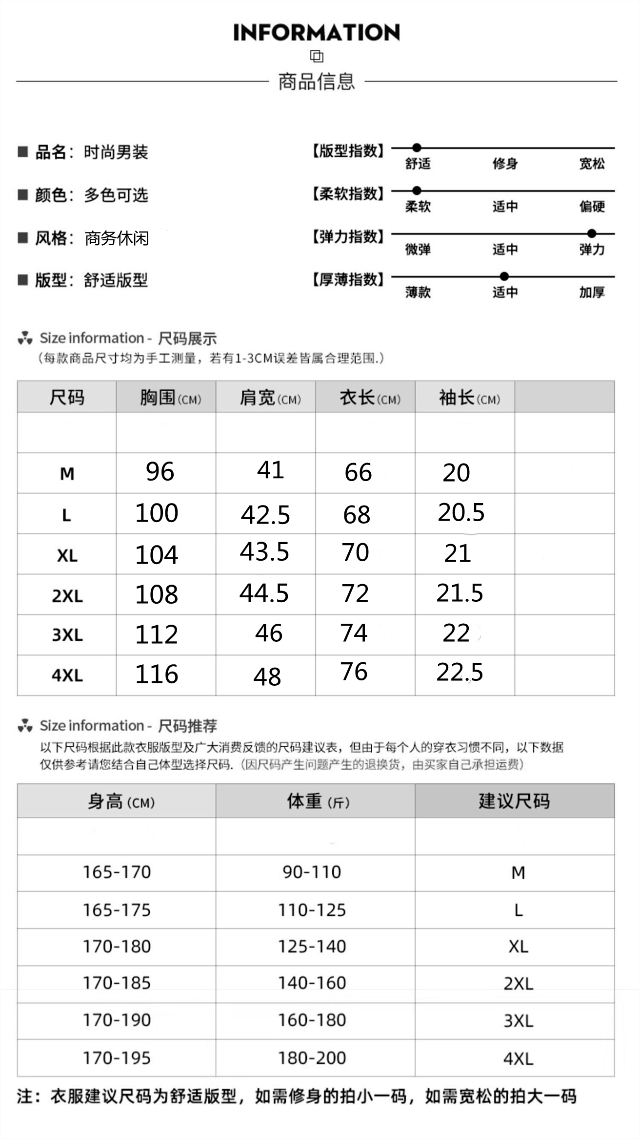 尺碼 165/M,170/L,175/XL,180/XXL,185/XXXL,190/XXXXL