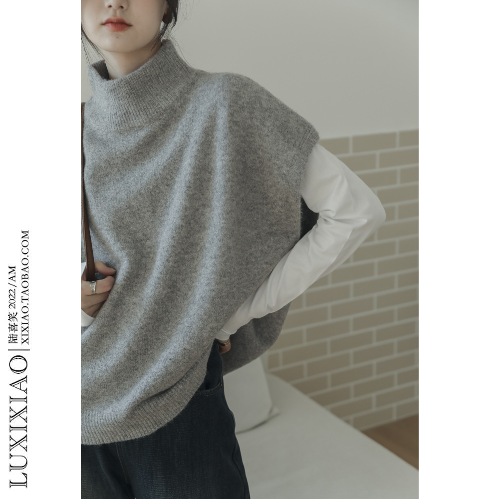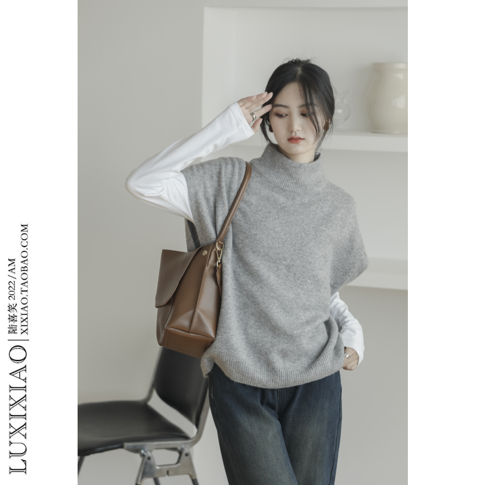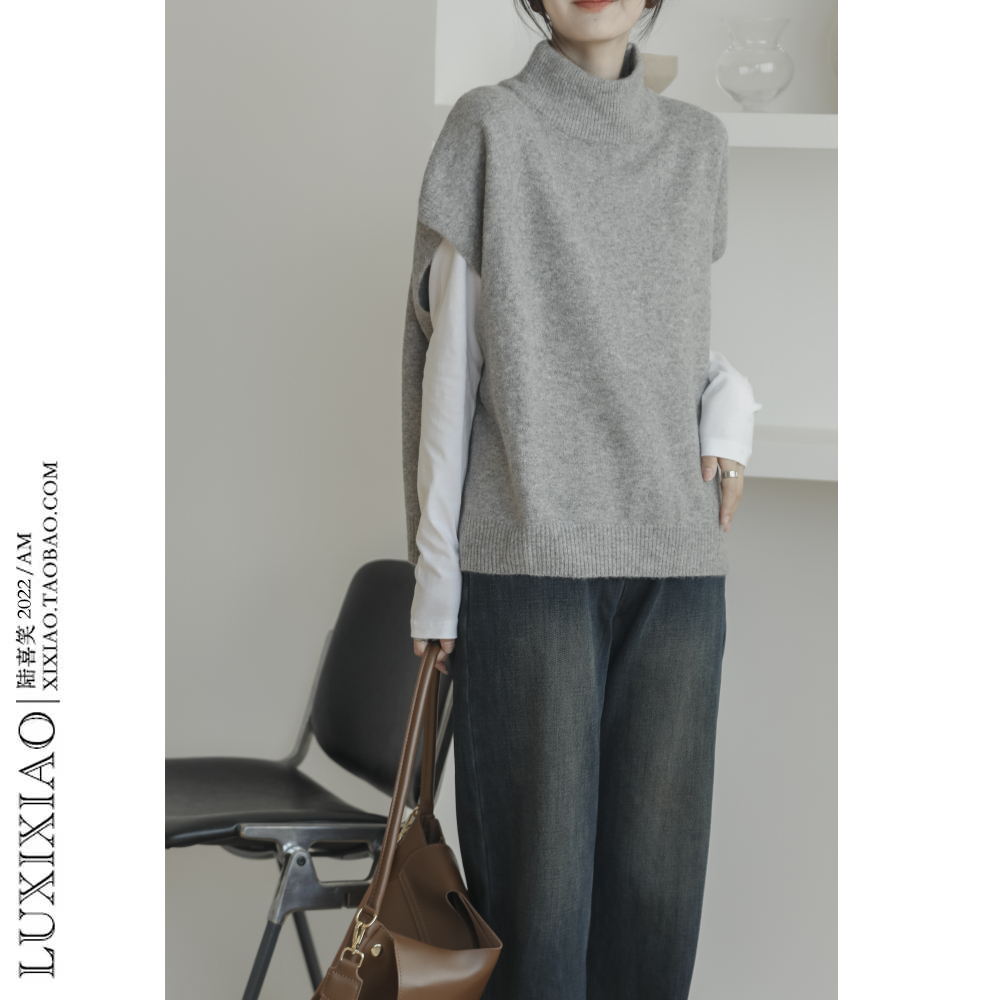LUXIXIAO針織馬甲女外搭學院風無袖高領坎肩背心毛衣寬鬆灰色上衣