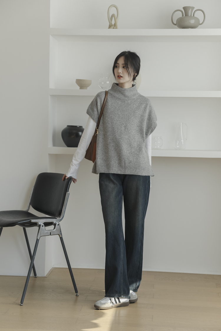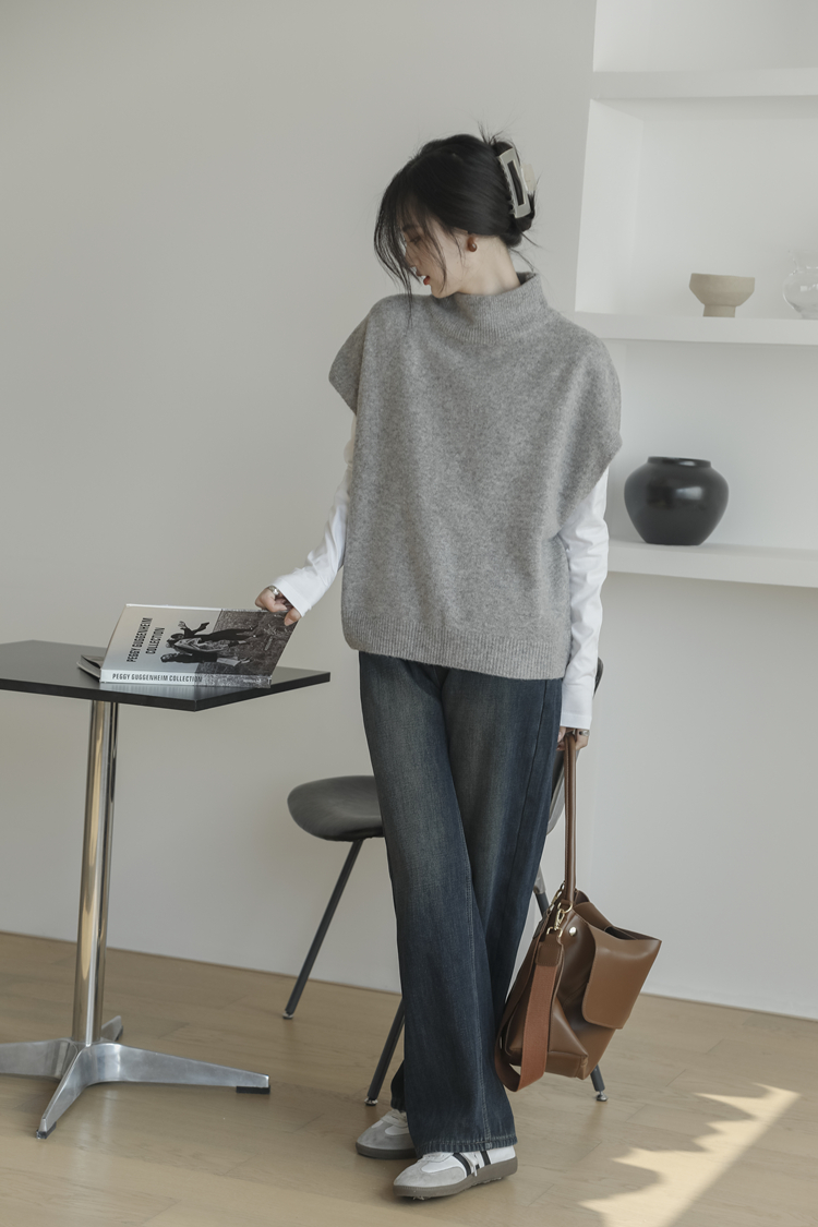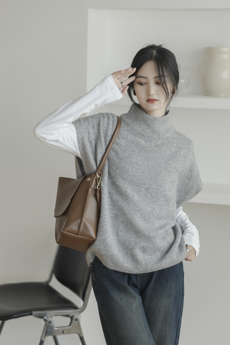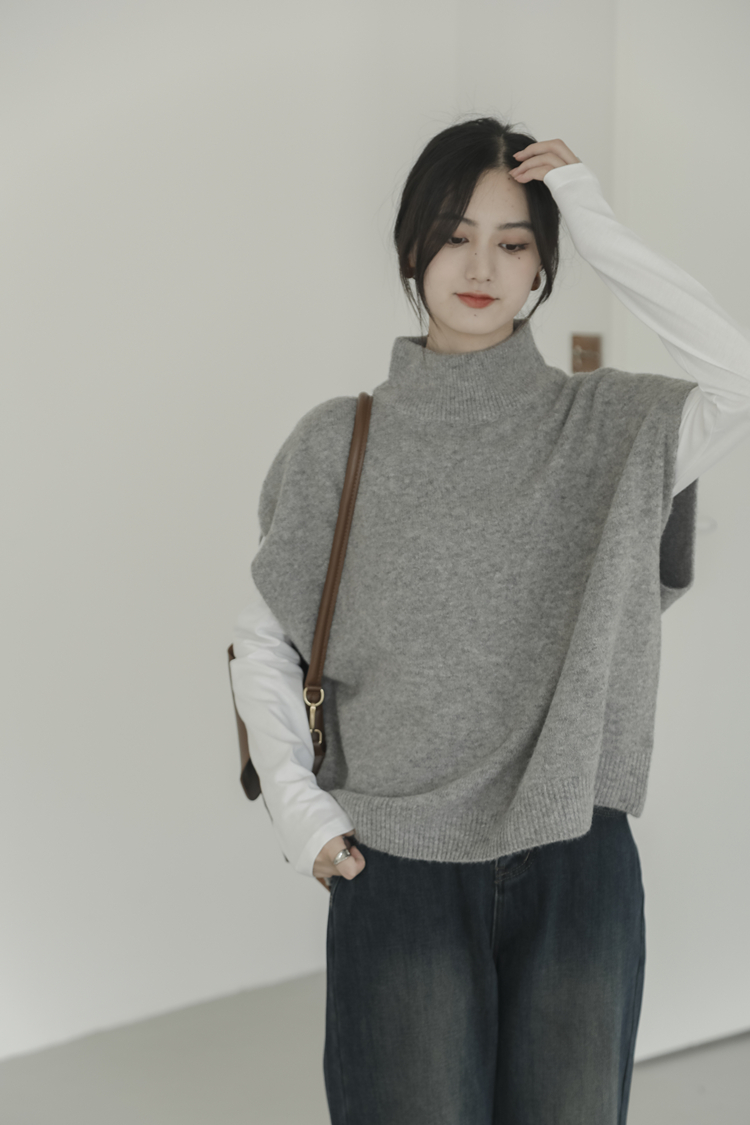 LUXIXIAO針織馬甲女外搭學院風無袖高領坎肩背心毛衣寬鬆灰色上衣
