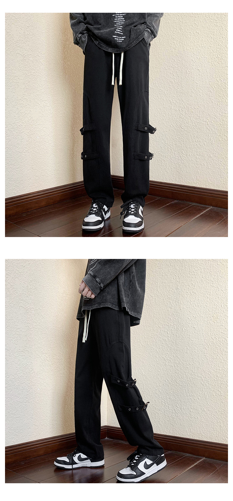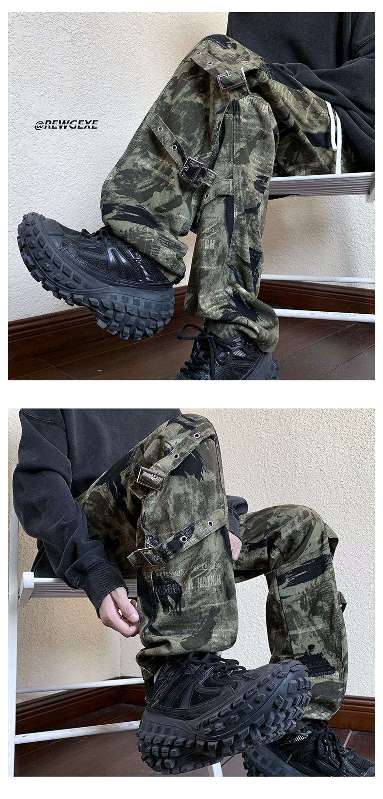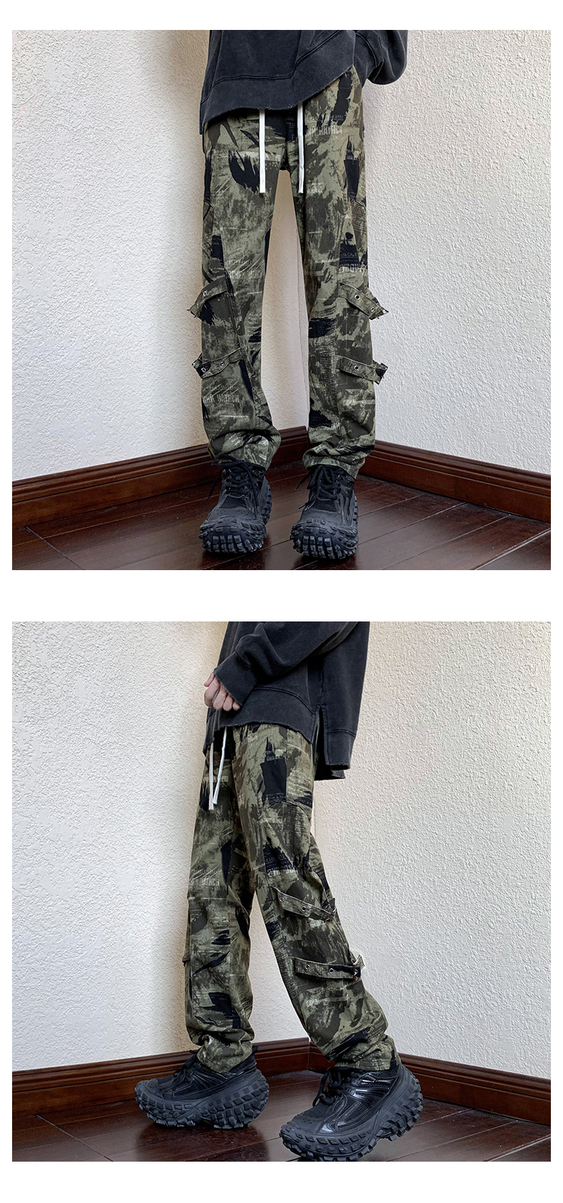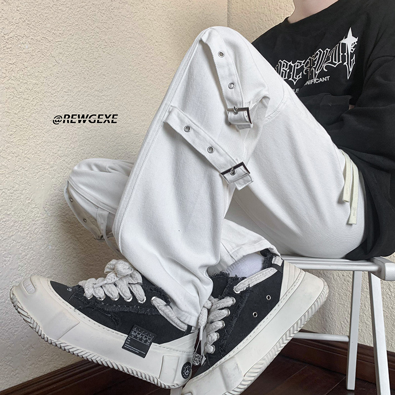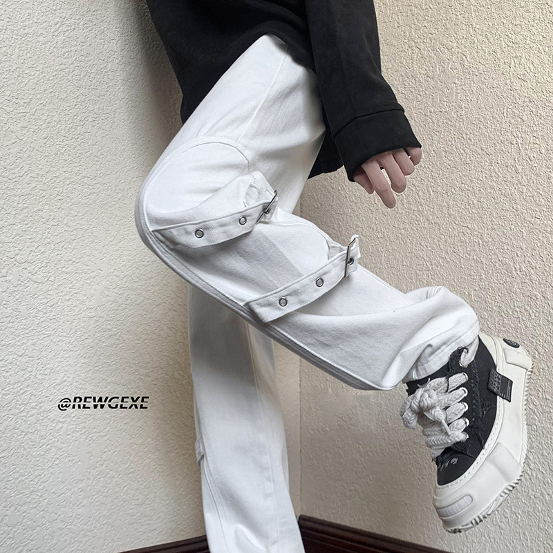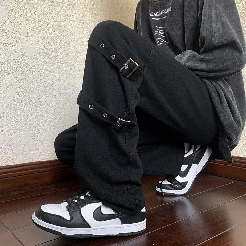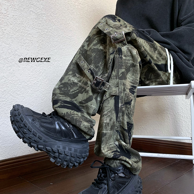 迷彩裝飾帶褲子復古日系慵懶風闊腿褲設計感小眾hiphop工裝直筒褲