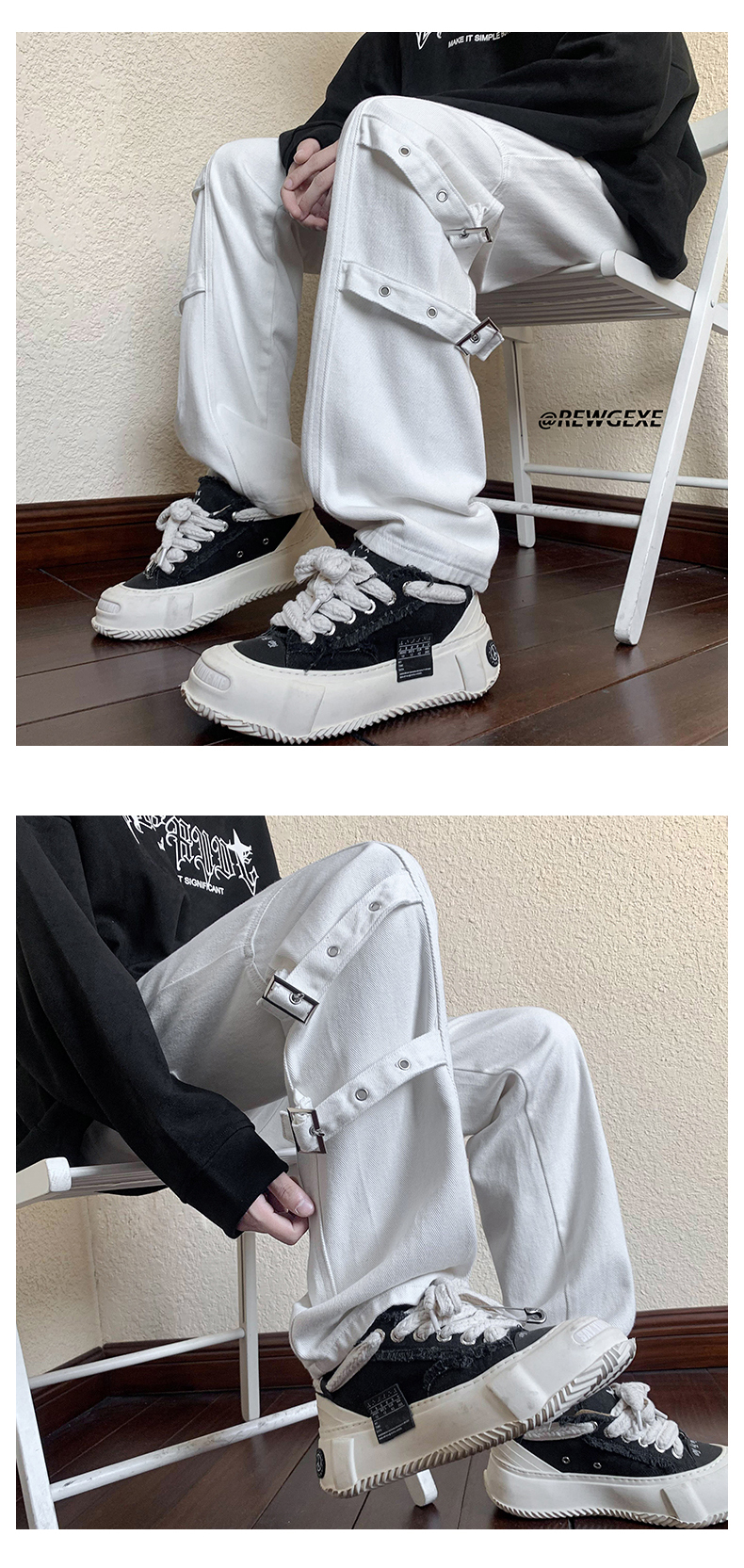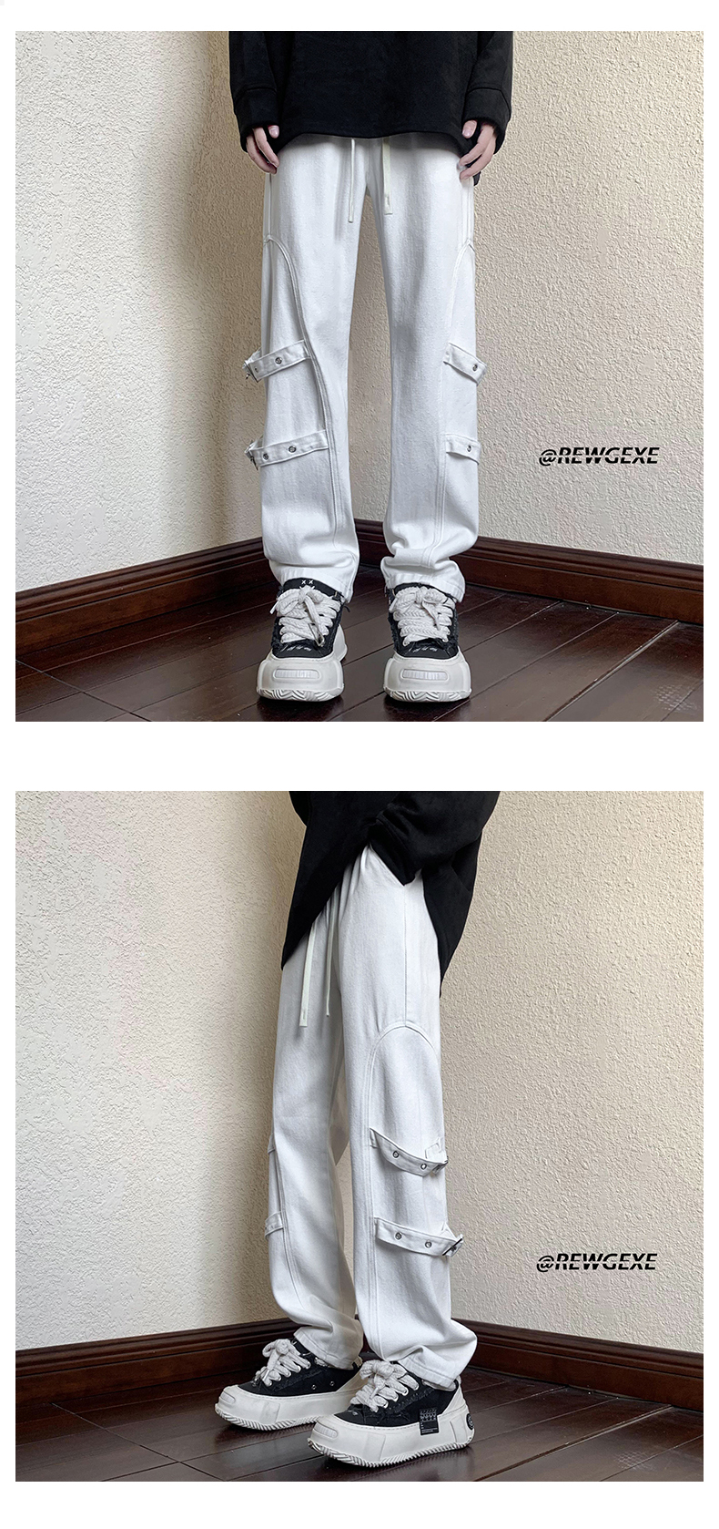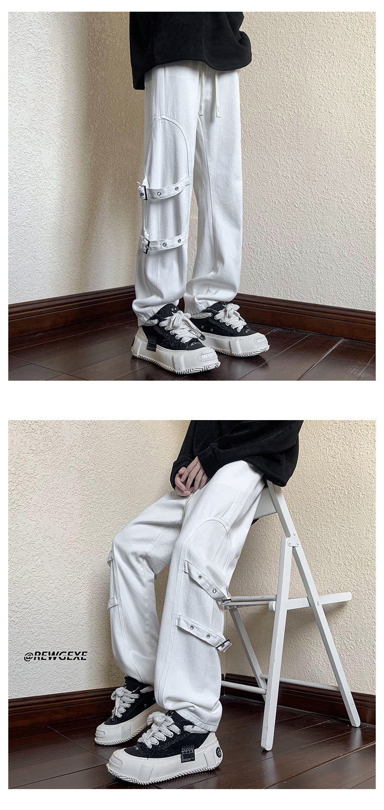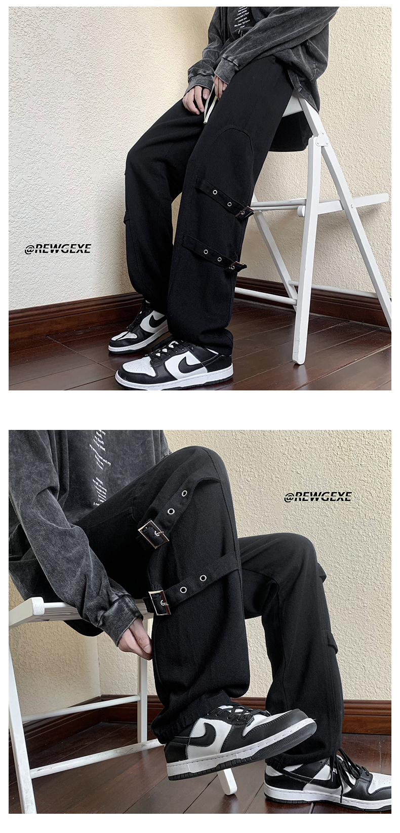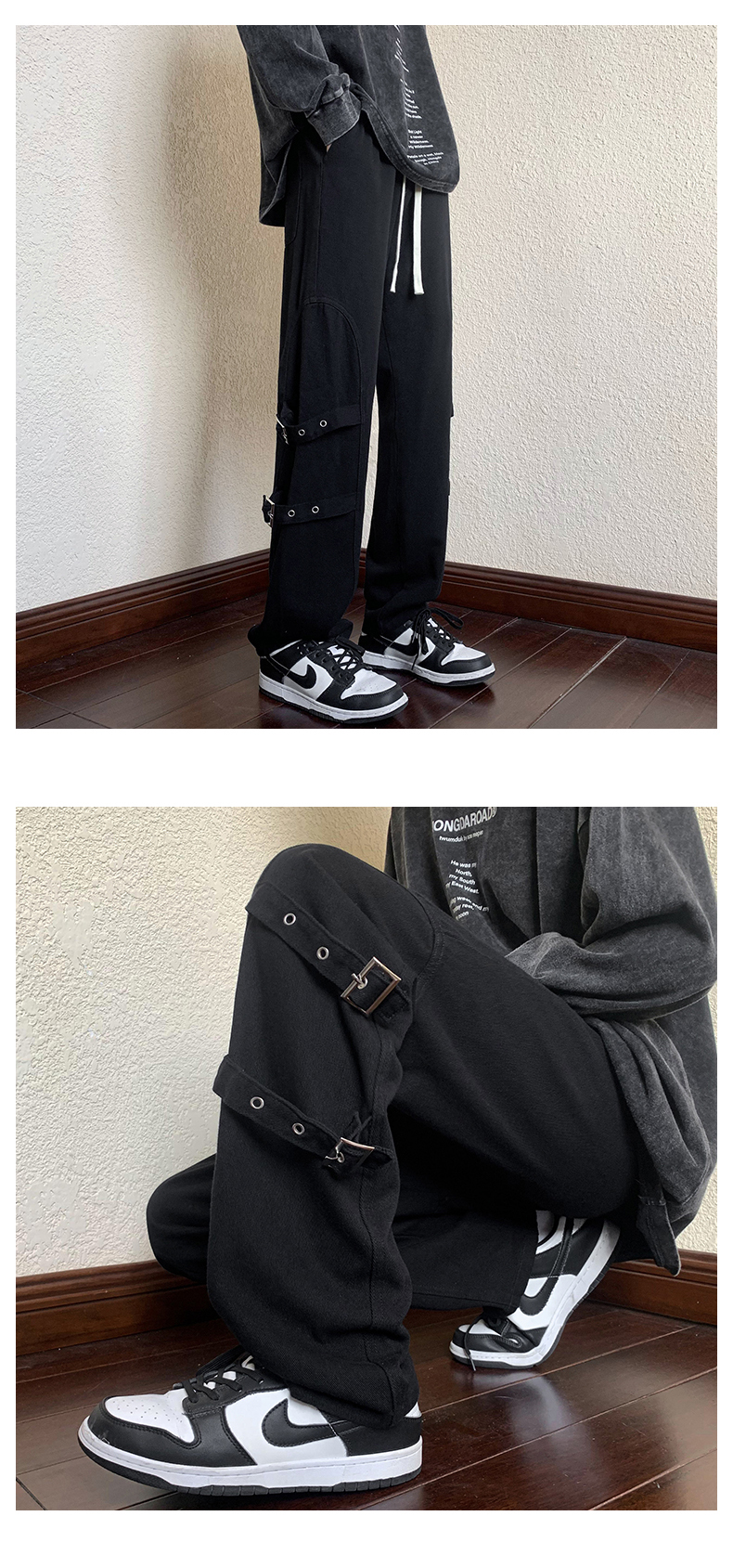 迷彩裝飾帶褲子復古日系慵懶風闊腿褲設計感小眾hiphop工裝直筒褲