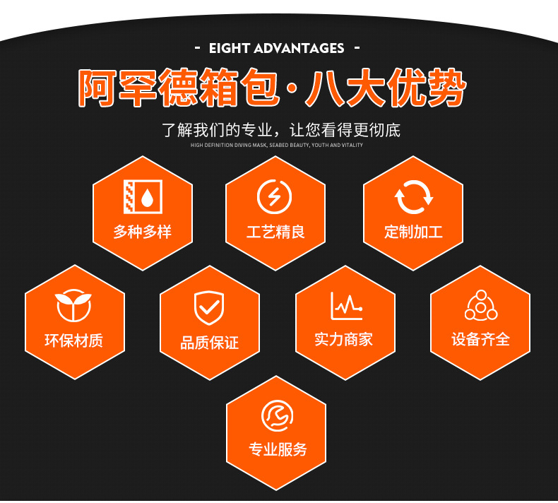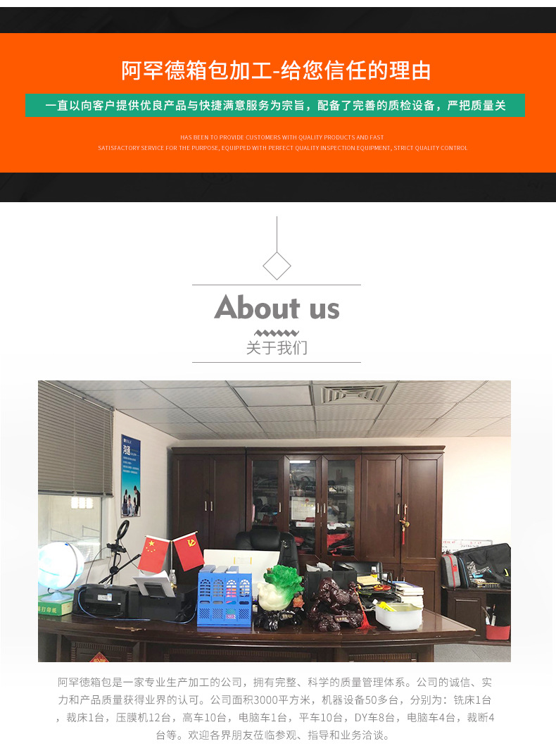 阿罕徳箱包是一家专业生产加工的公司,拥有完整、科学的质量管理体系。公司的诚信、实力和产品质量获得业界的认可。公司面积3000平方米,机器设备50多台,分别为:铣床1台,裁床1台,压膜机12台,高车10台,电脑车1台,平车10台,DY车8台,电脑车4台,裁断4台等。欢迎各界朋友莅临参观、指导和业务洽谈。