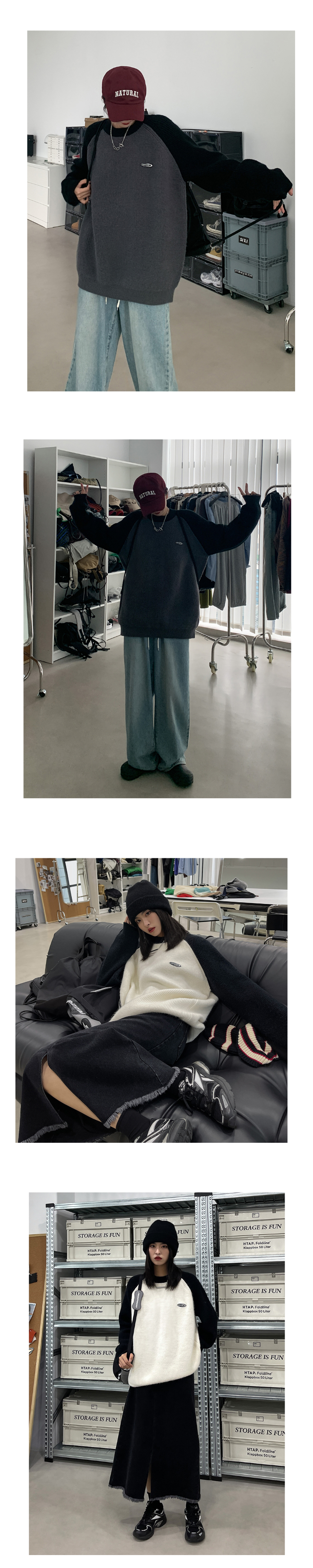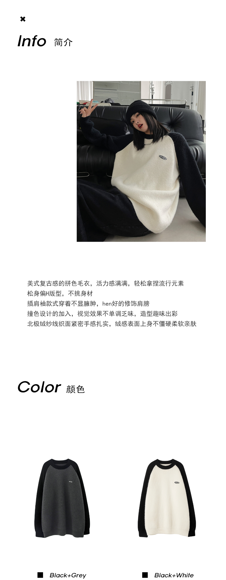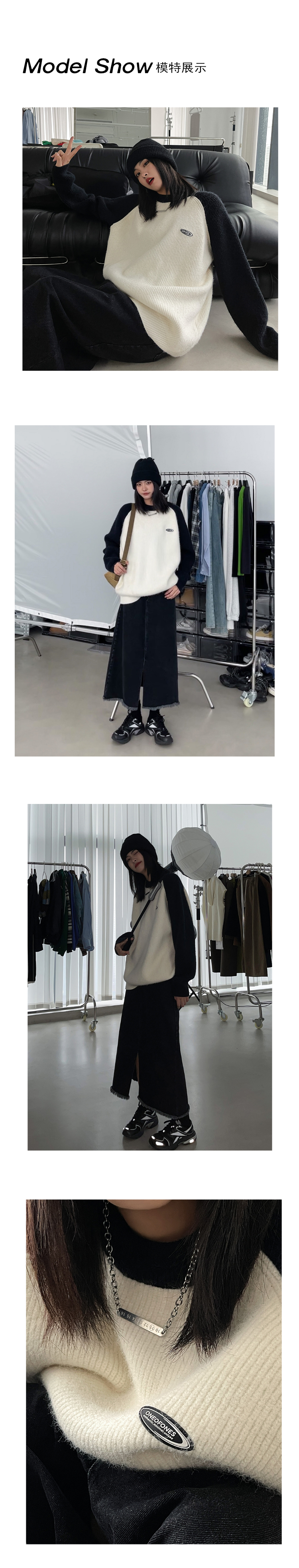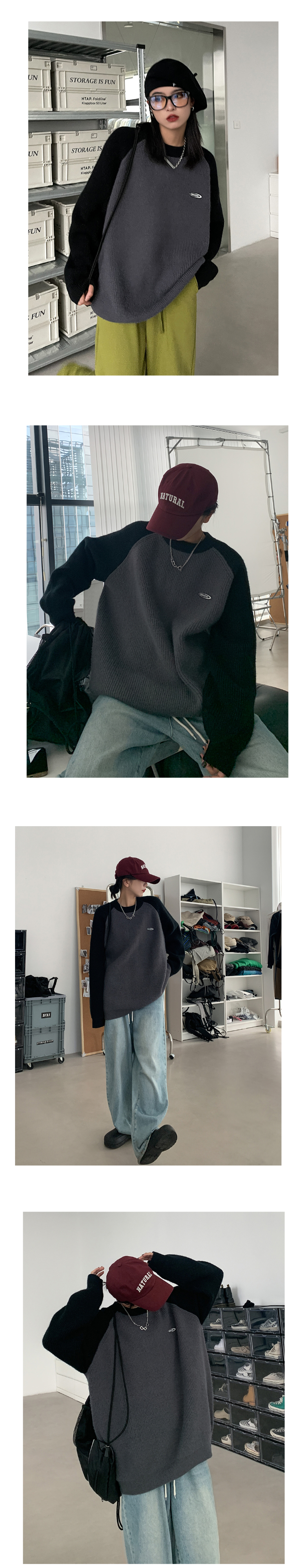 SIXI四喜家春季 撞色拼接插肩袖毛衣女慵懶寬鬆圓領套頭針織外套