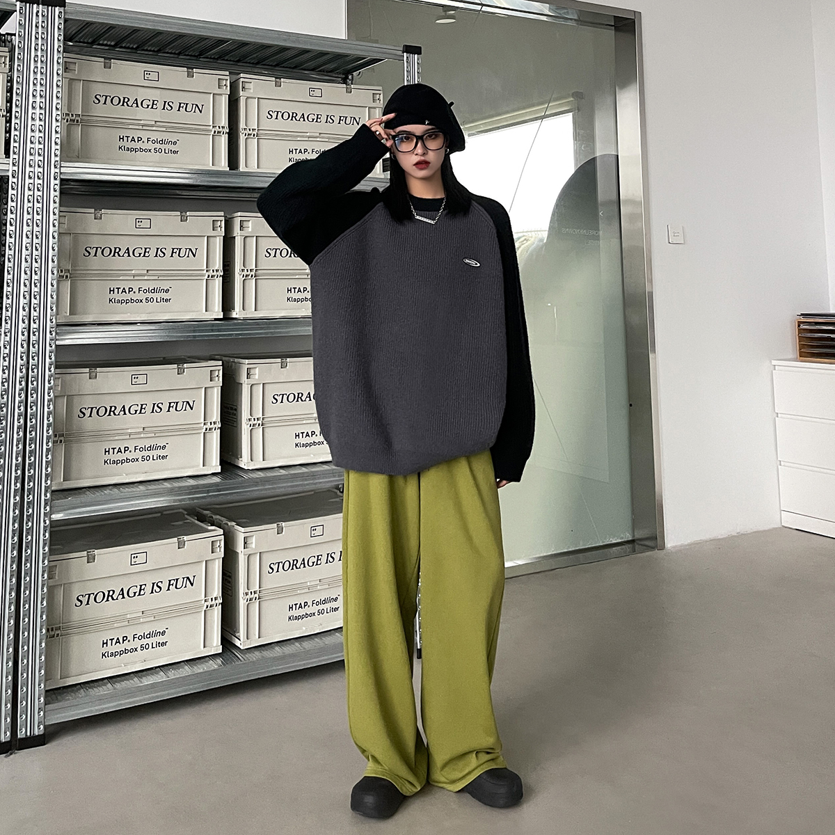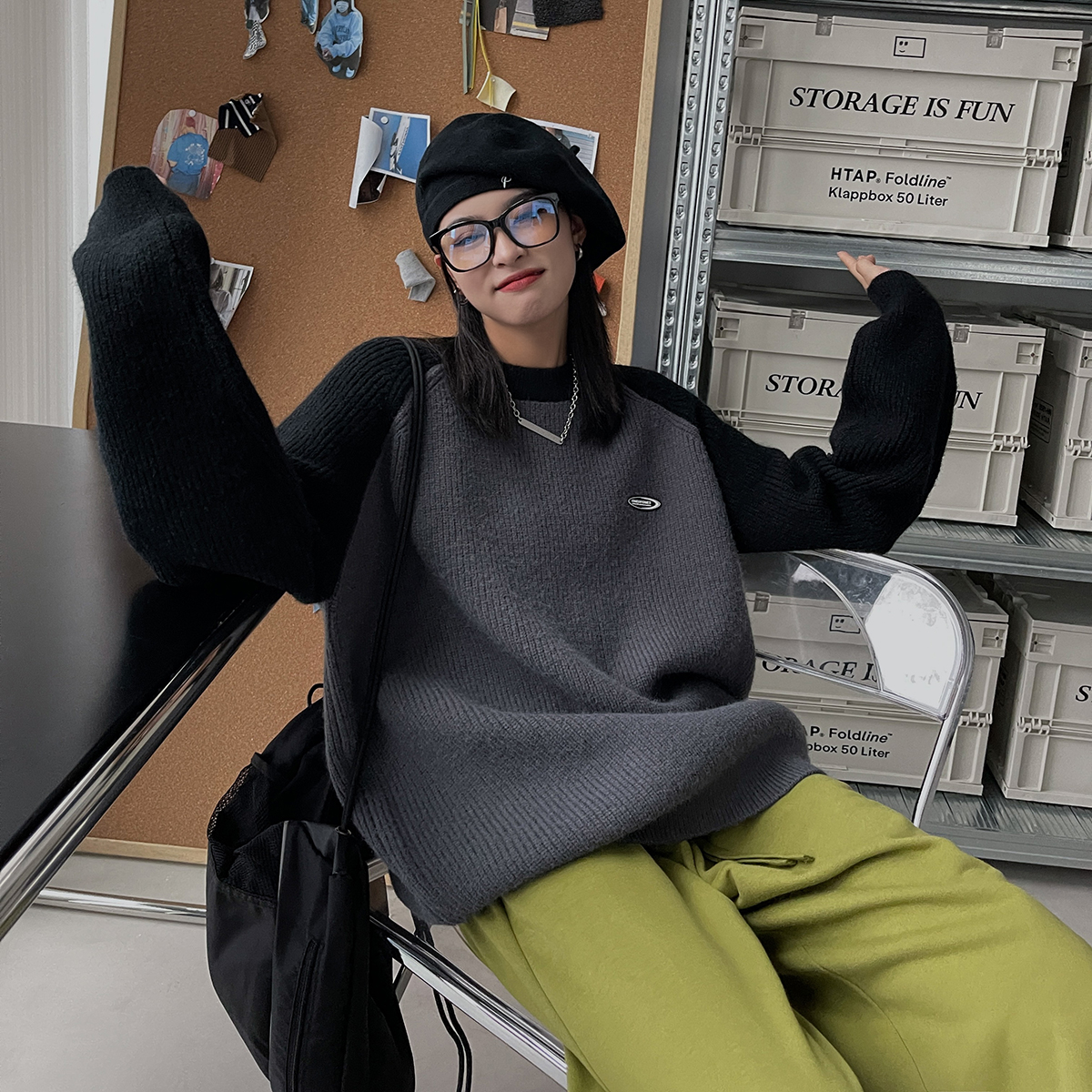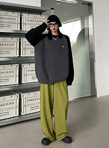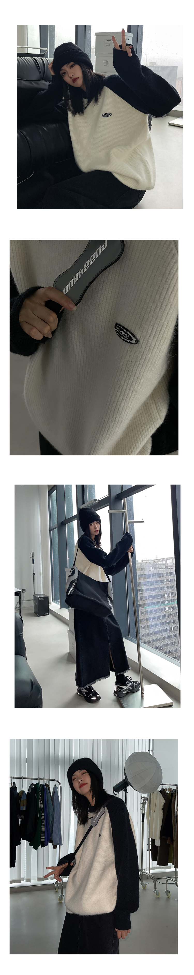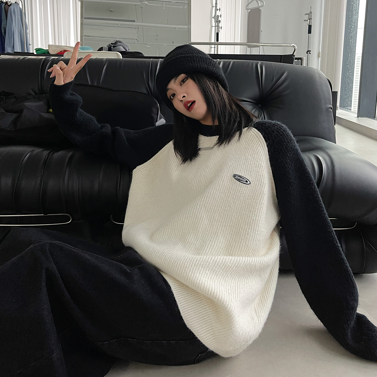 SIXI四喜家春季 撞色拼接插肩袖毛衣女慵懶寬鬆圓領套頭針織外套
