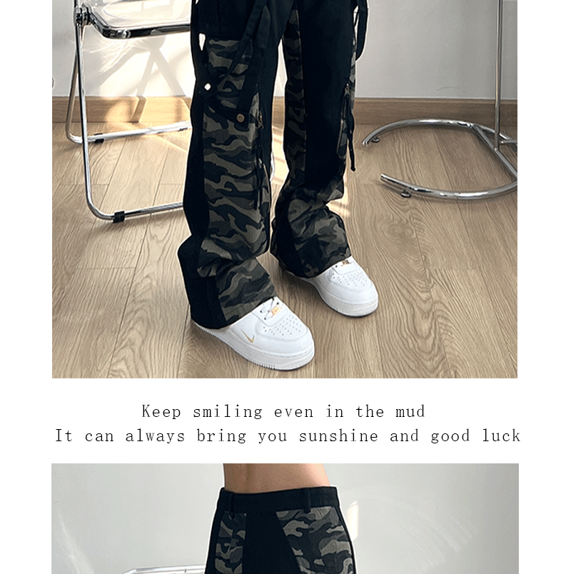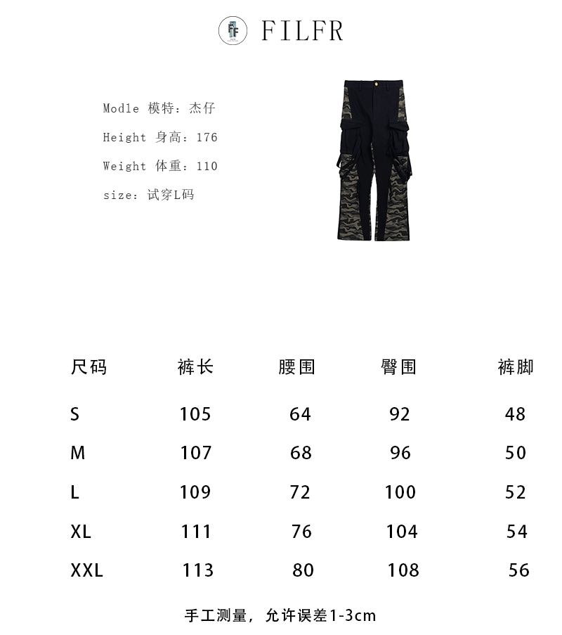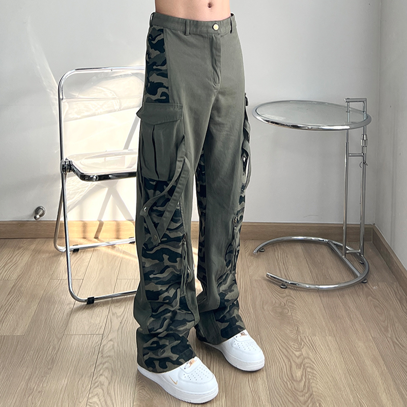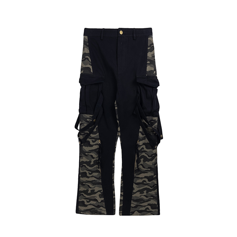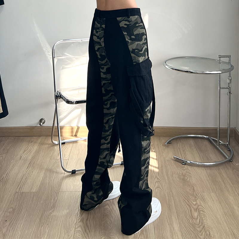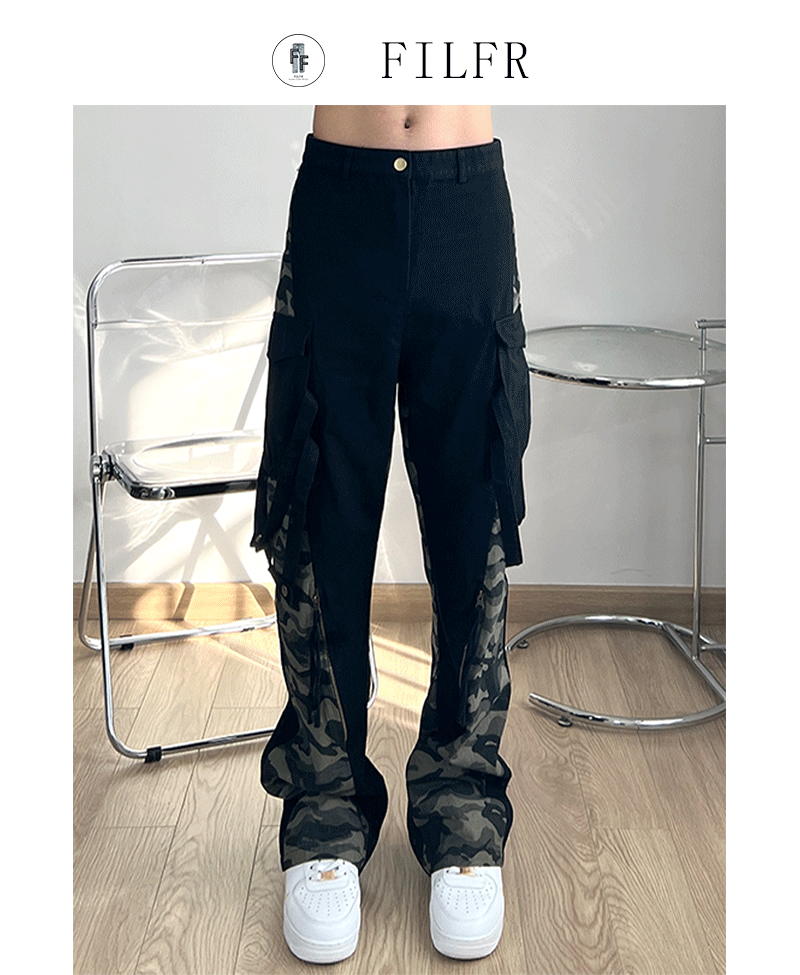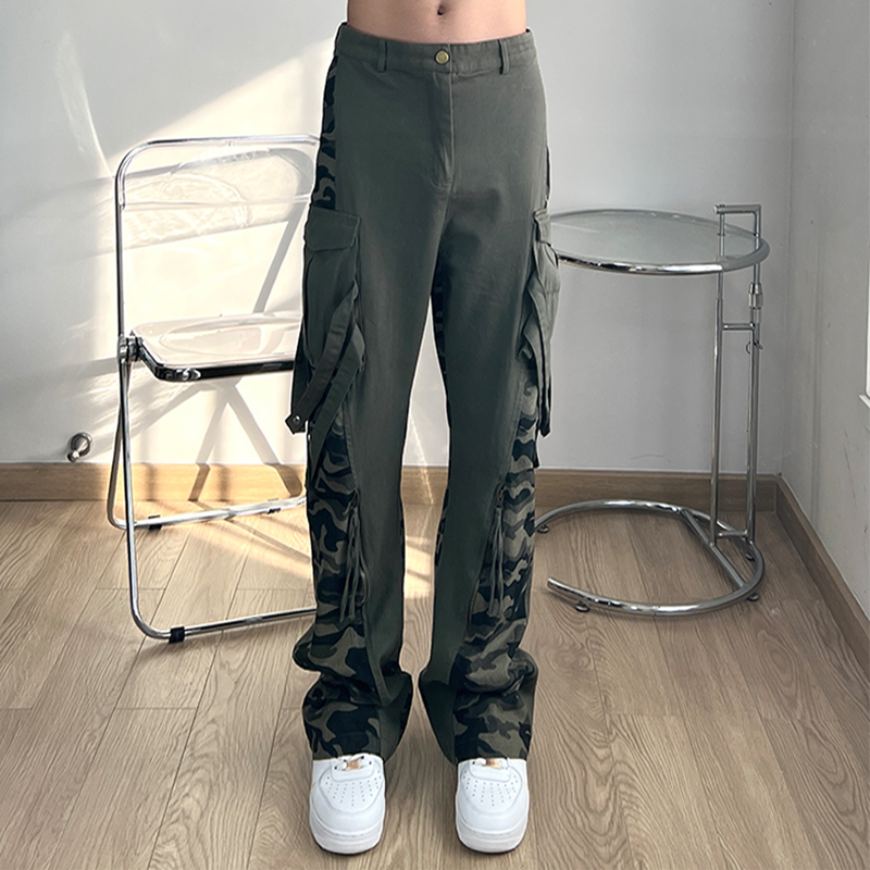 FILFR美式hiphop迷彩拼接工裝褲男高街設計感口袋拉鍊顯瘦微喇叭