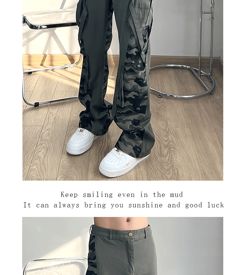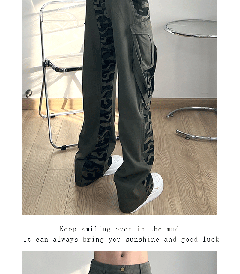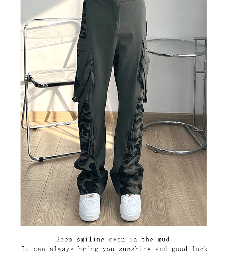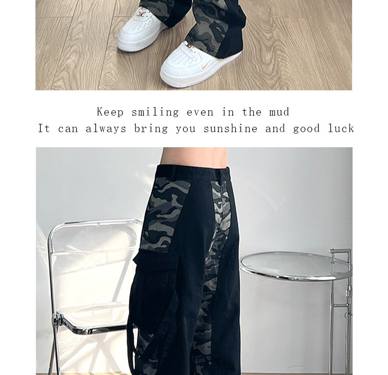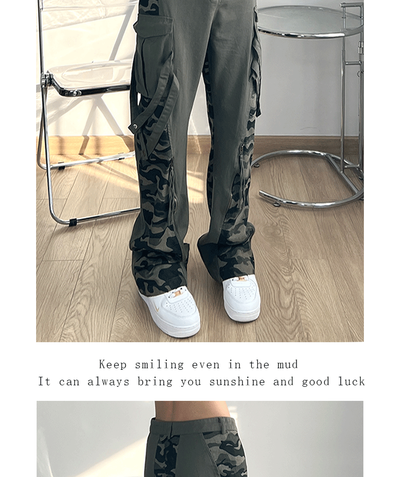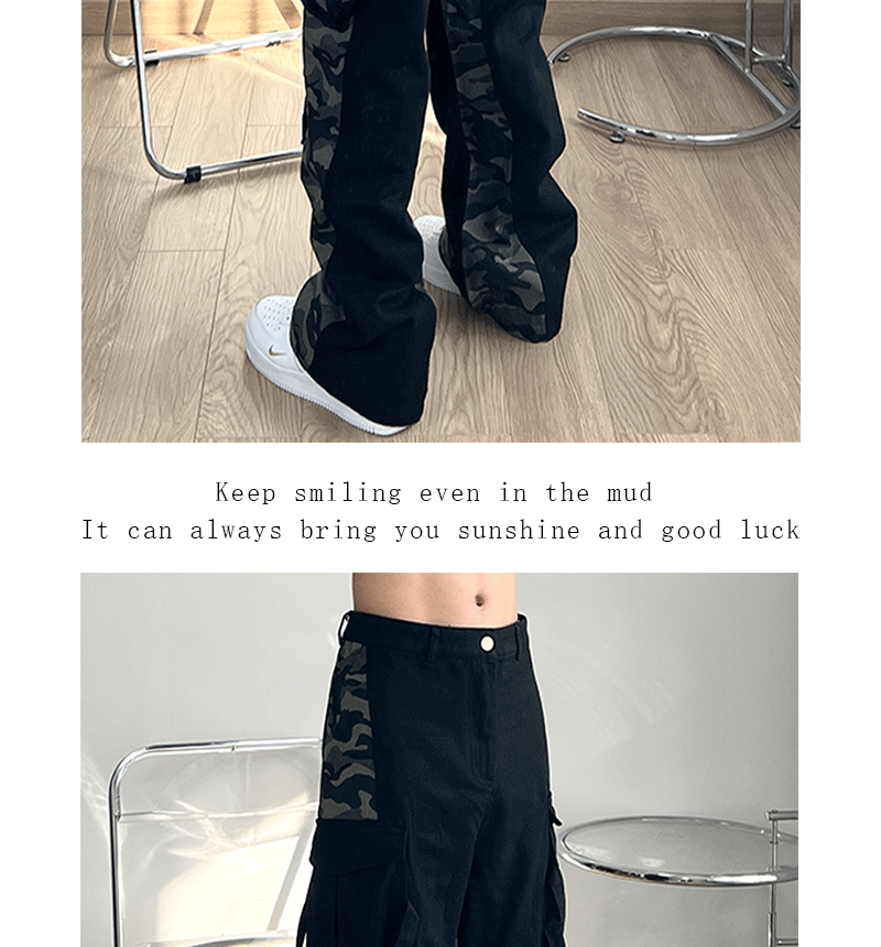 FILFR美式hiphop迷彩拼接工裝褲男高街設計感口袋拉鍊顯瘦微喇叭