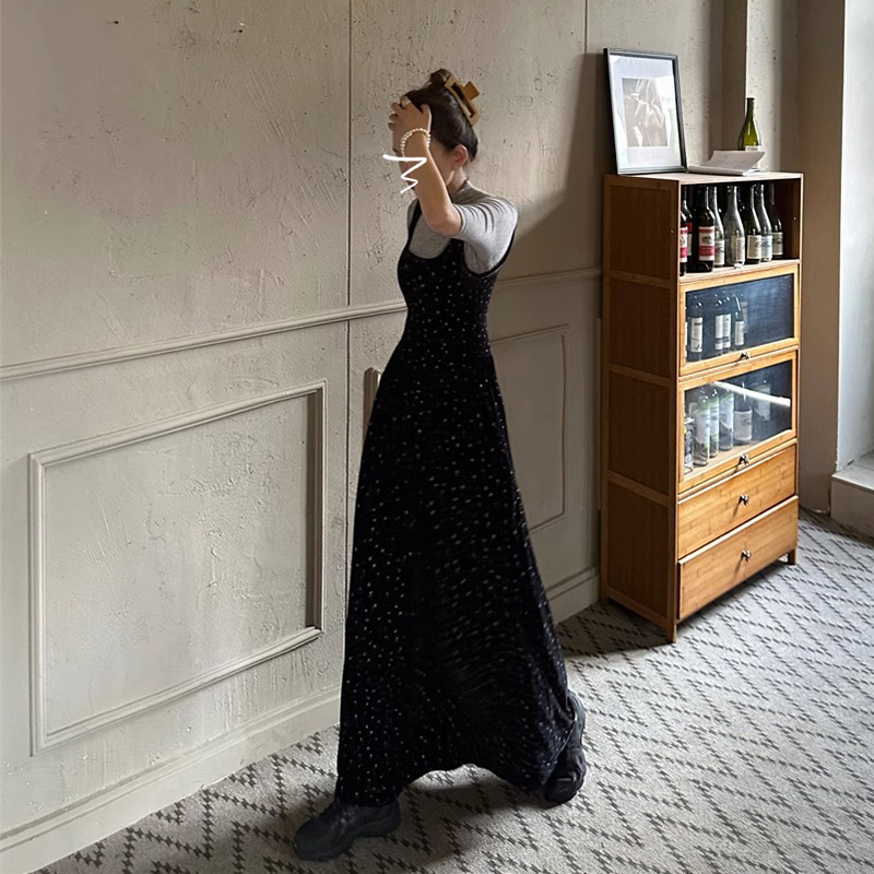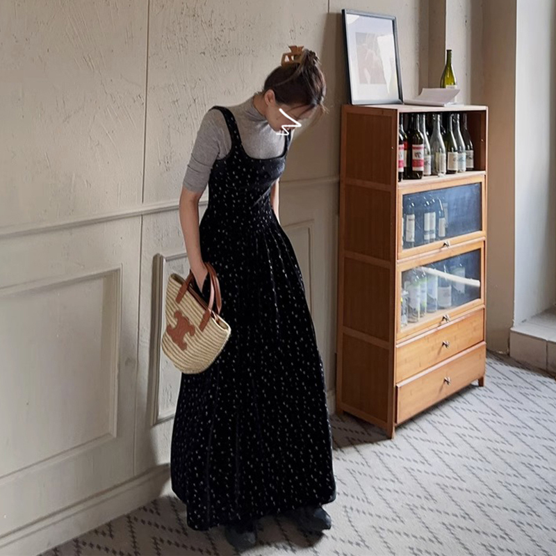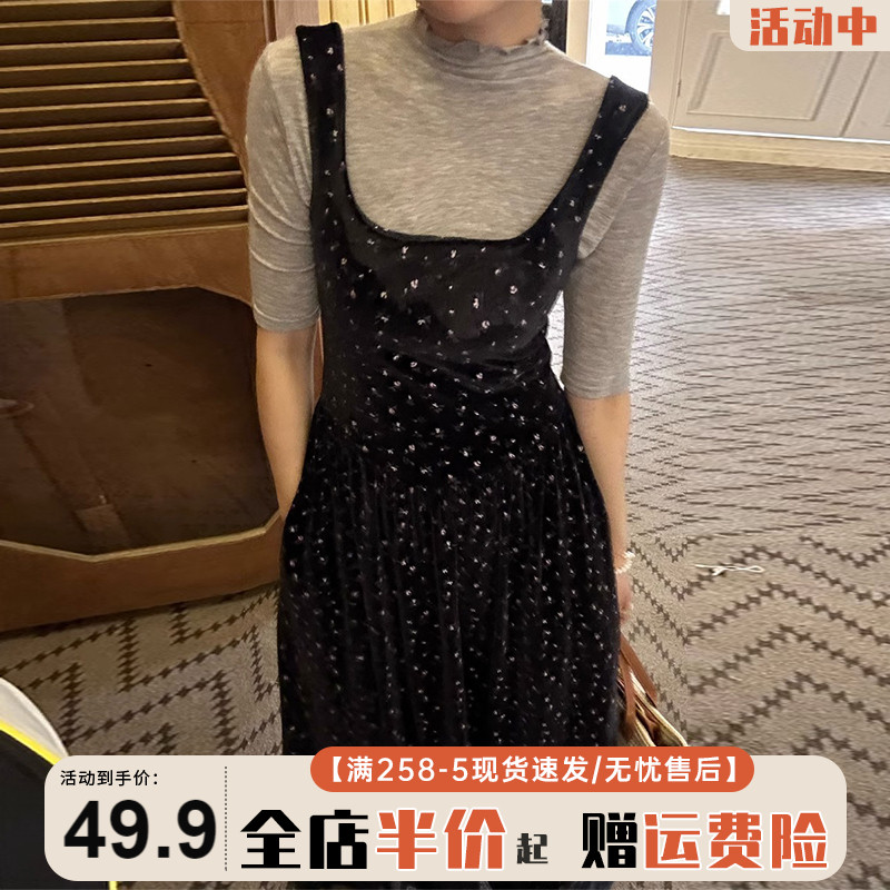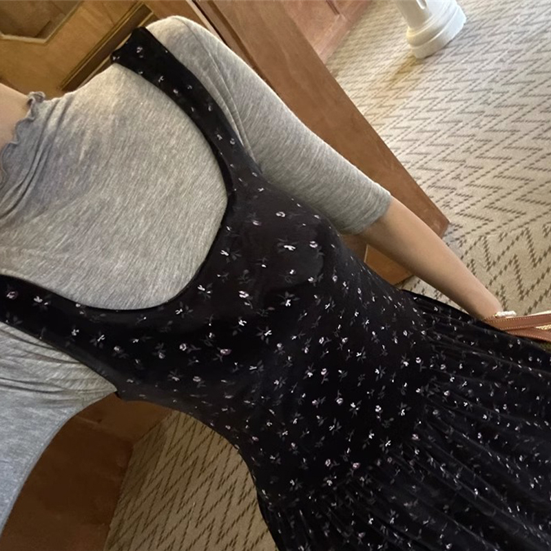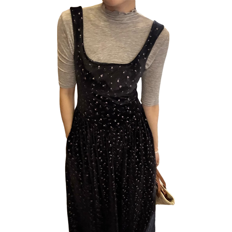 無袖絲絨黑色碎花洋裝子秋季2023年新款吊帶背心裙a字復古長裙