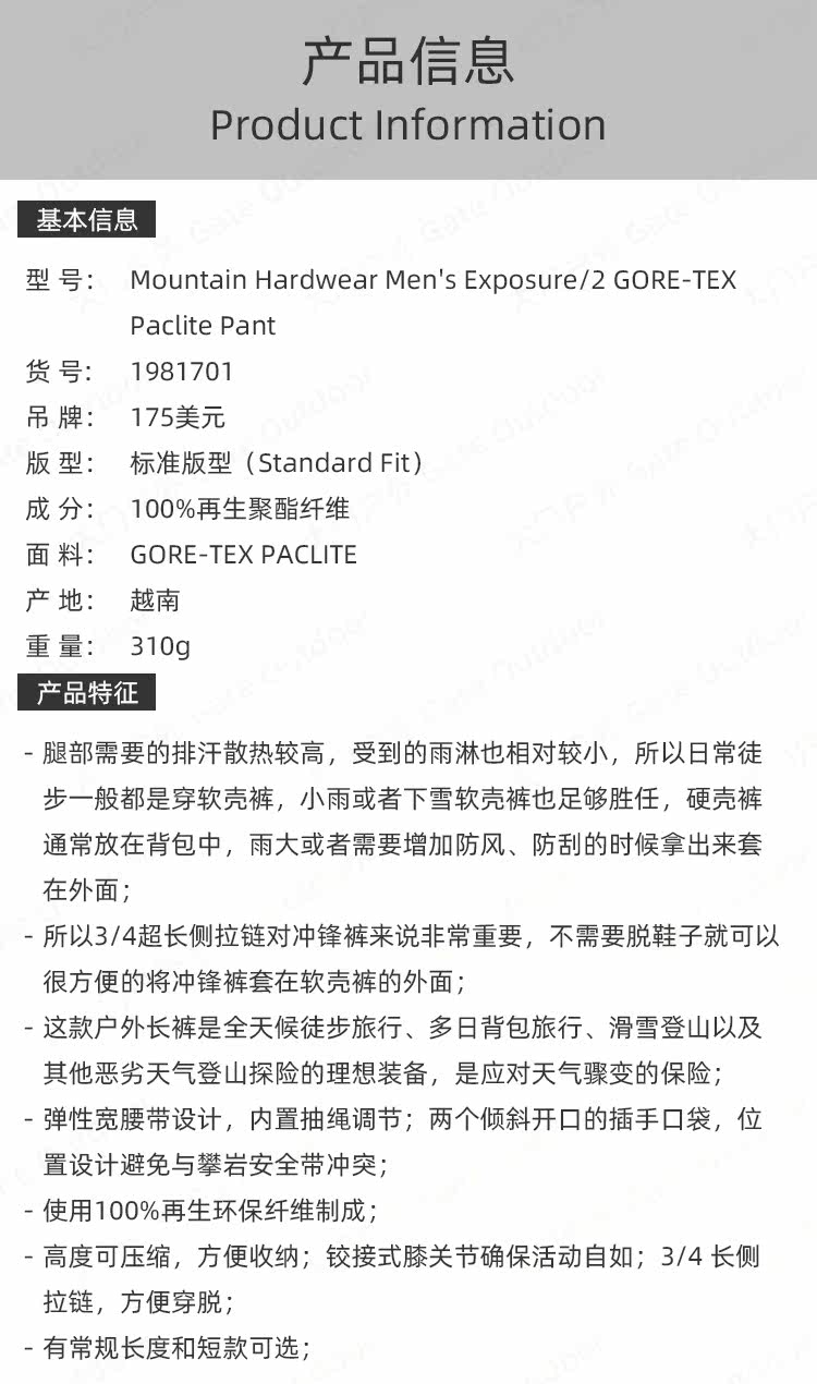 Mountain Hardwear山浩大螺母MHW男款GTX硬殼衝鋒褲戶外防暴雨水