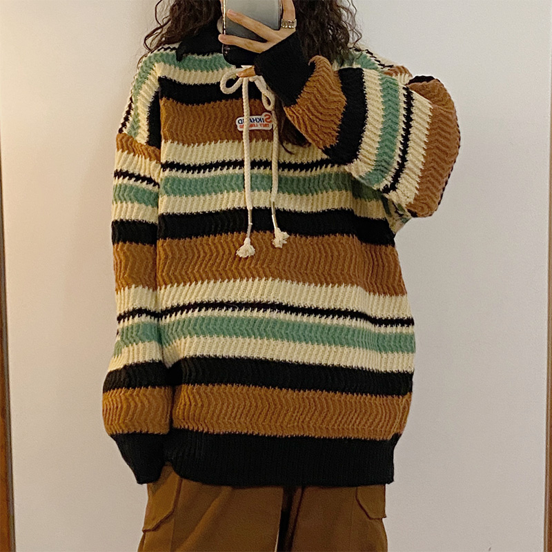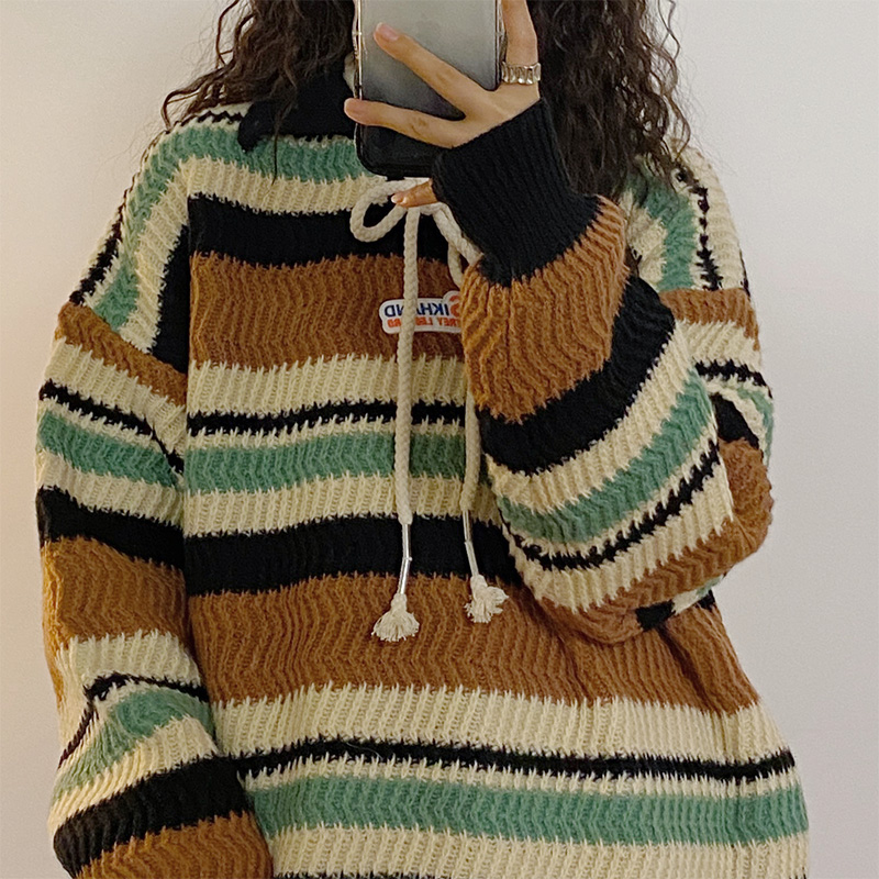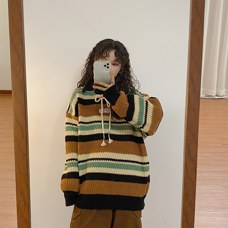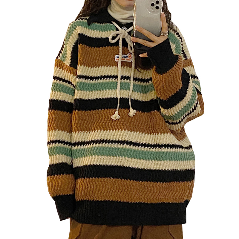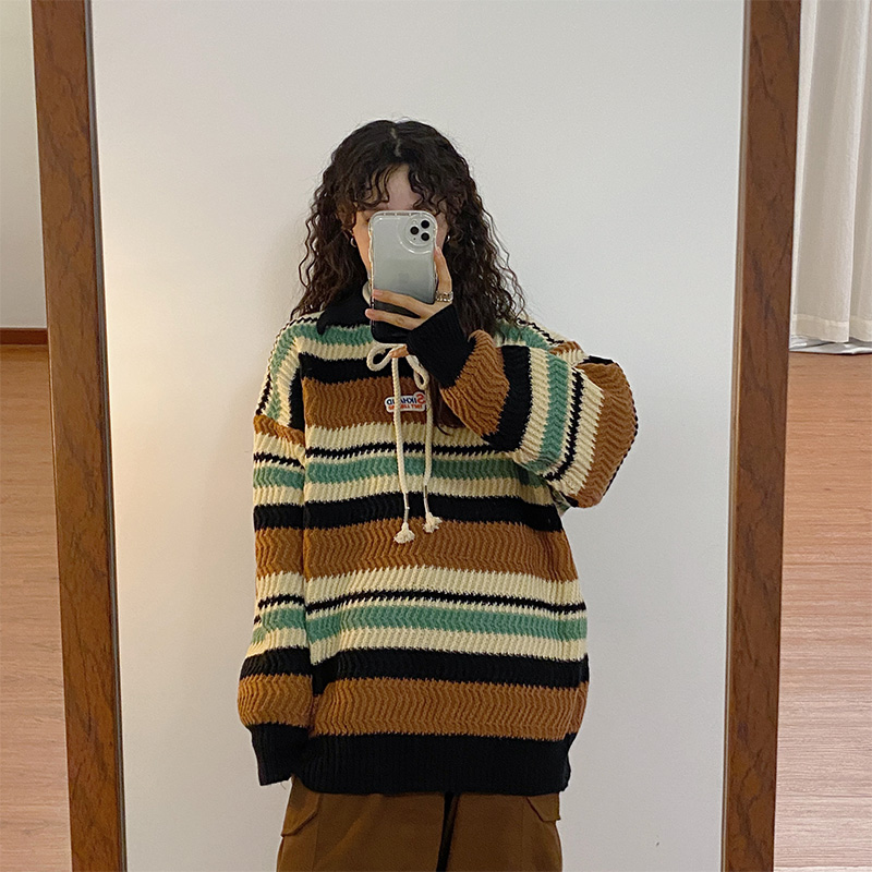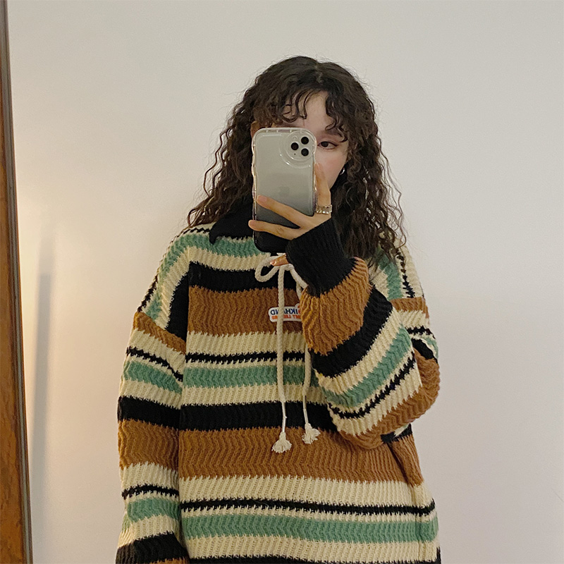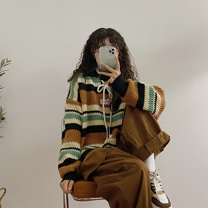 UATONLINE秋冬新款美式復古寬鬆條紋設計感圓領針織衫女套頭毛衣