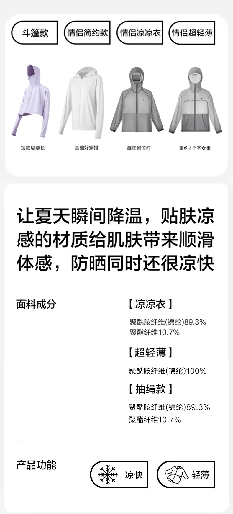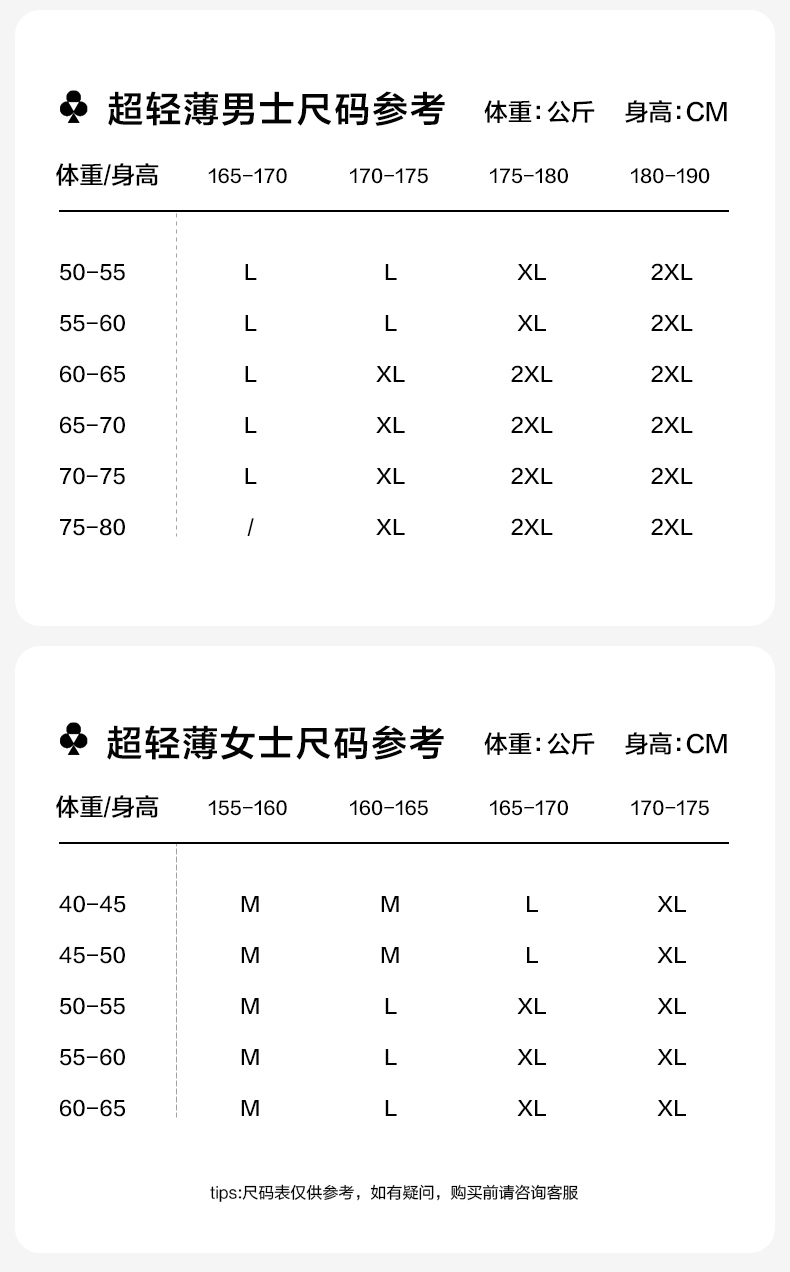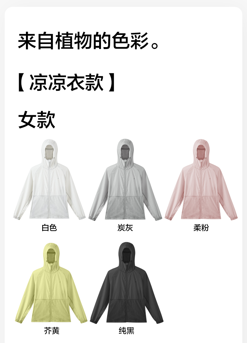 顏色分類 【涼涼衣】(女款)白色 【涼涼衣】(女款)黑色 【涼涼衣】(女款)芥黃 【涼涼衣】(女款)柔粉 【涼涼衣】(女款)碳灰 【涼涼衣】(男款)白色 【涼涼衣】(男款)黑色 【涼涼衣】(男款)芥黃 【涼涼衣】(男款)軍綠 【涼涼衣】(男款)碳灰 【基礎款】(男款)雅白 【基礎款】(男款)穹灰 【基礎款】(女款)麥花白 【基礎款】(女款)草木灰 【基礎款】(女款)櫻花粉 【基礎款】(女款)薔薇紫 【鬥篷款】(均碼)幽靜灰 【鬥篷款】(均碼)靜謐白 【鬥篷款】(均碼)爛漫粉 【鬥篷款】(均碼)高貴紫