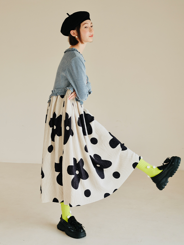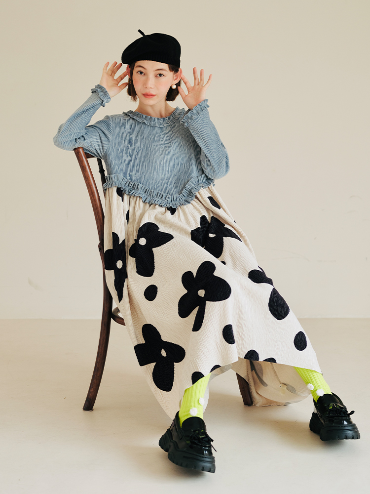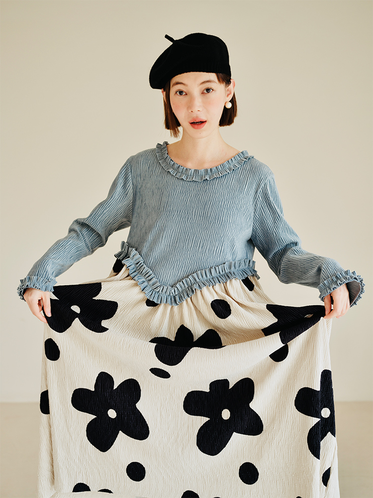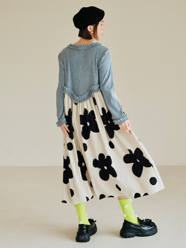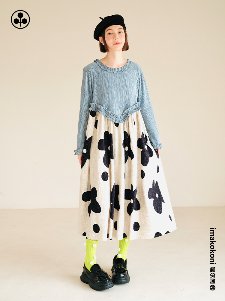 imakokoni 原創小眾藍色壓皺花朵拼色洋裝女秋冬長版裙子223894