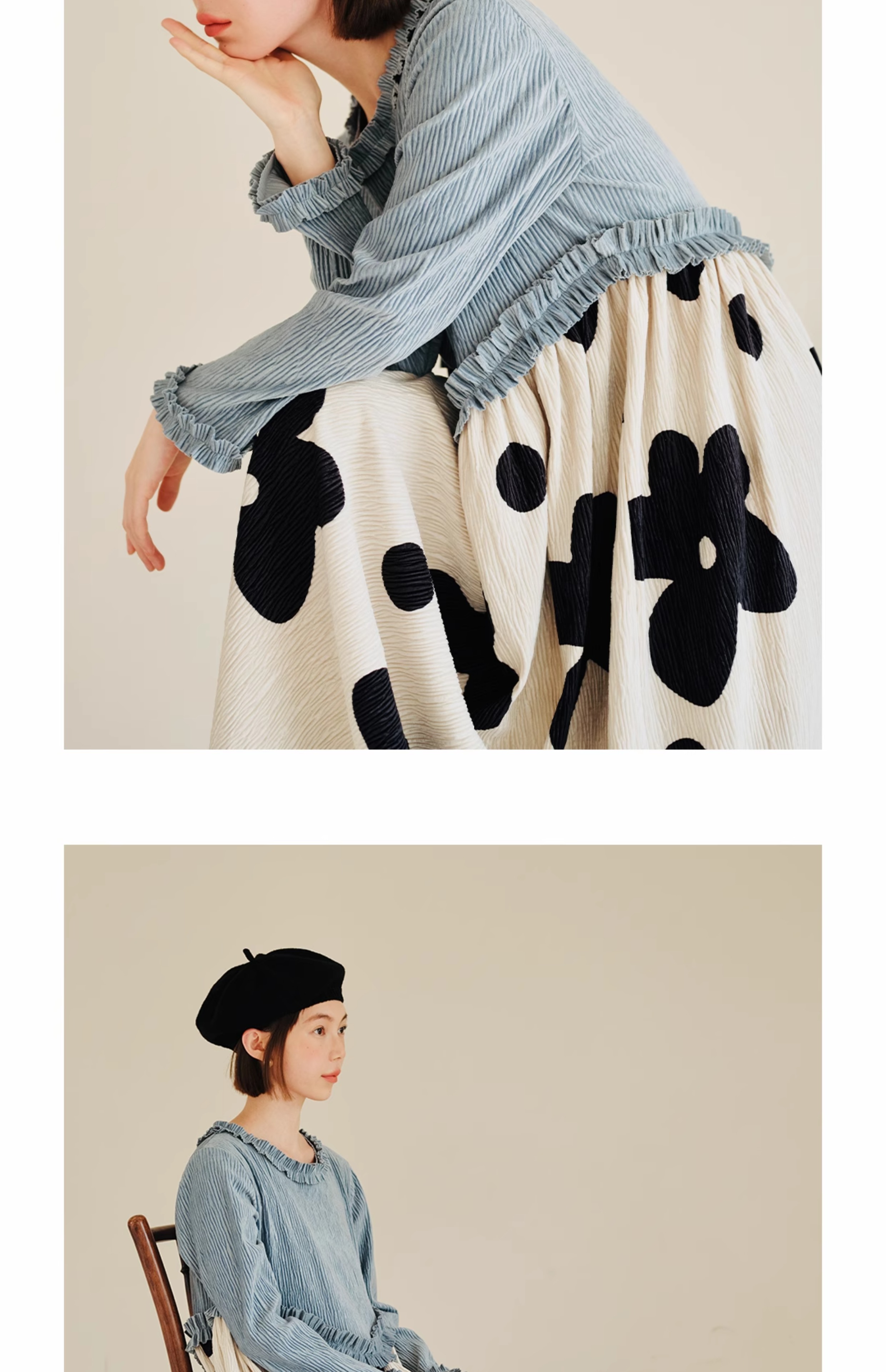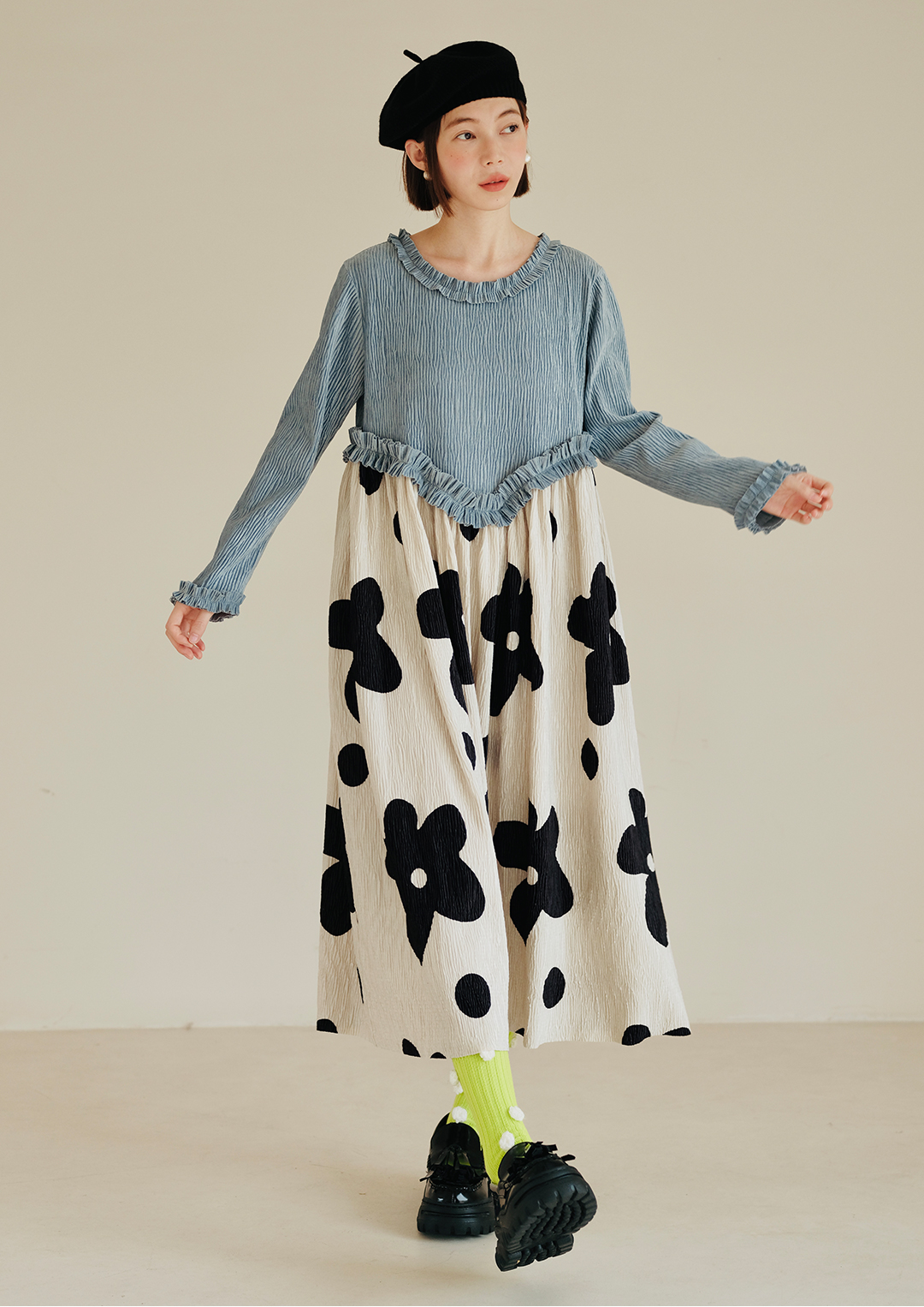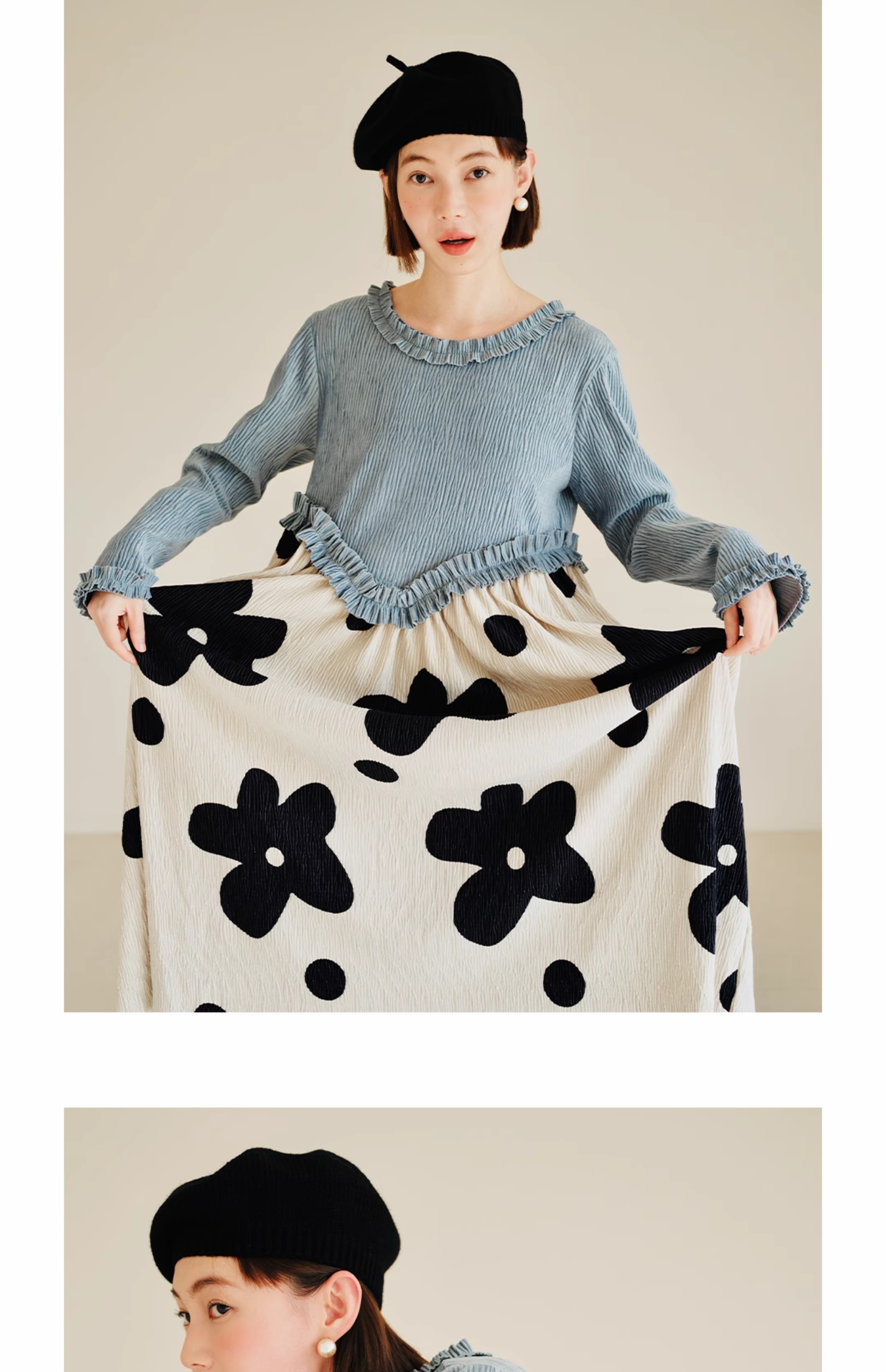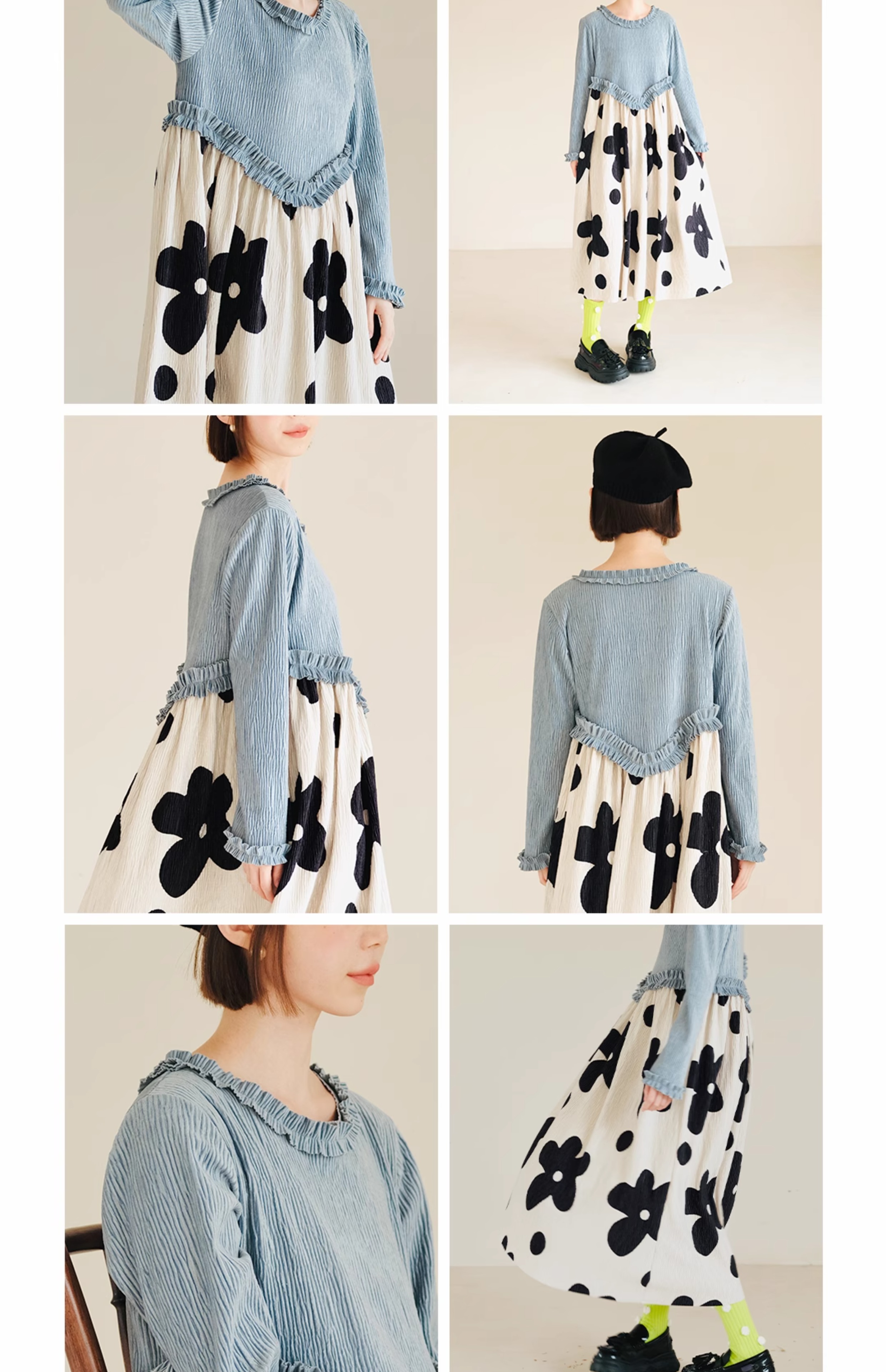 imakokoni 原創小眾藍色壓皺花朵拼色洋裝女秋冬長版裙子223894
