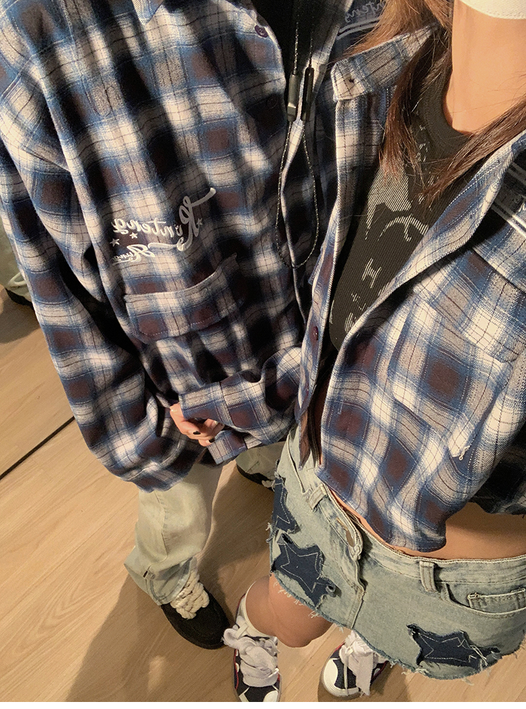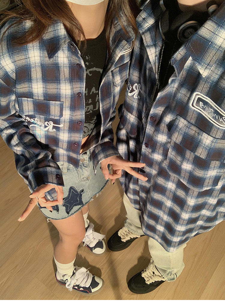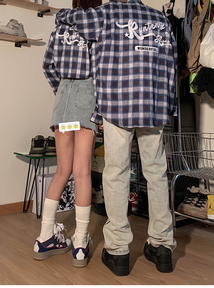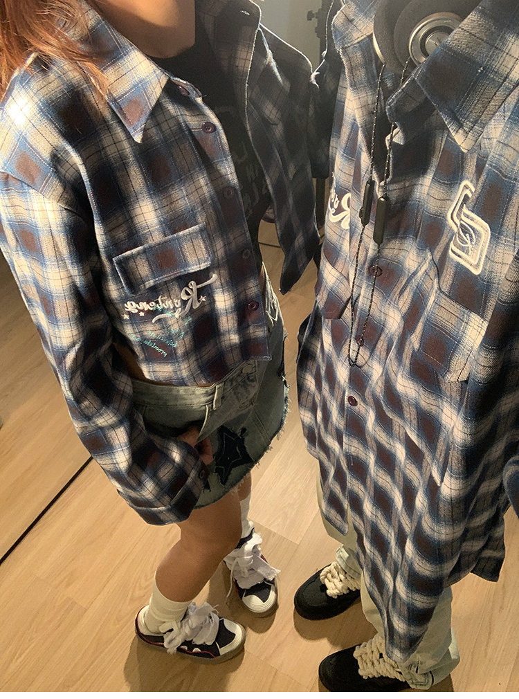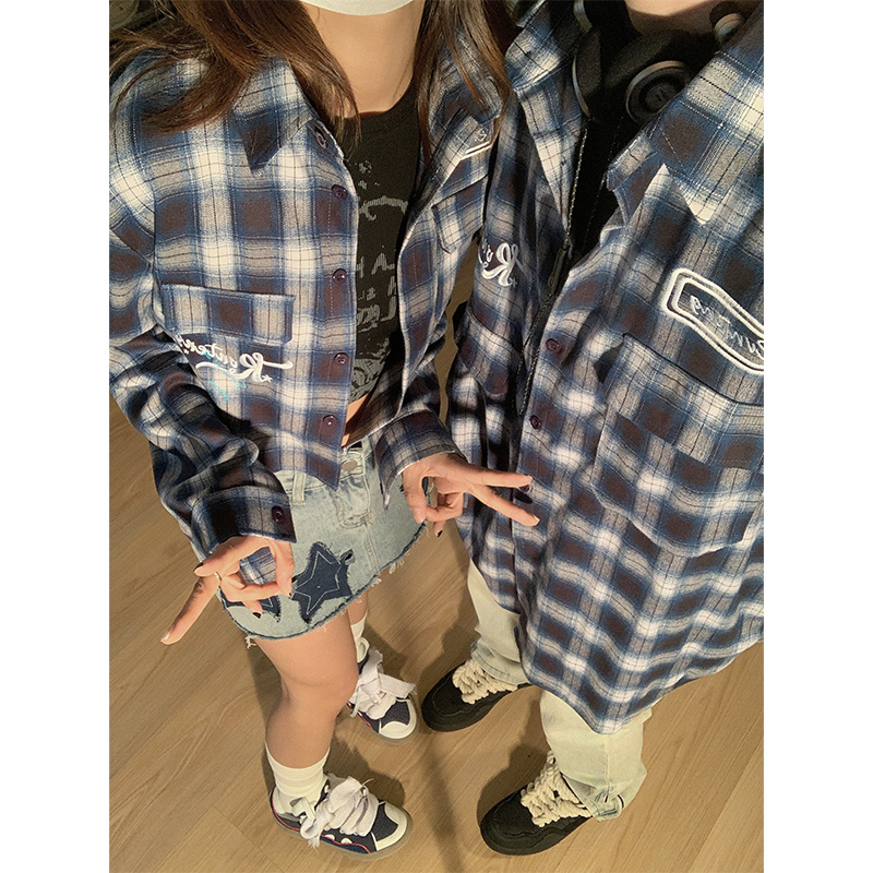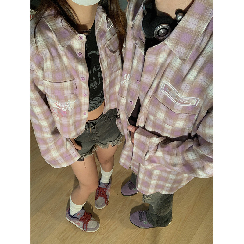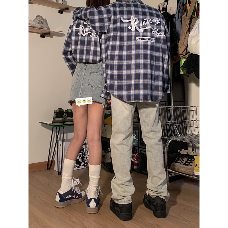 素素本SU美式復古情侶格子襯衫長袖潮牌高街寬鬆一長一短男女外套