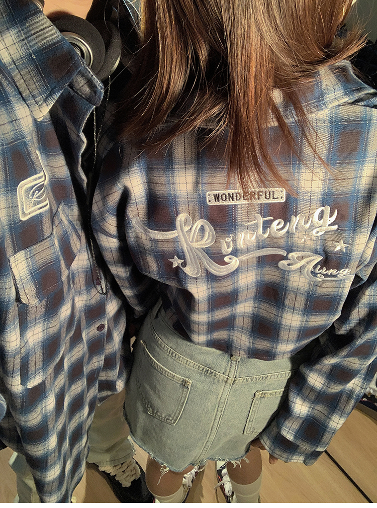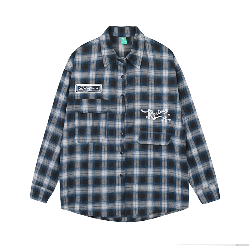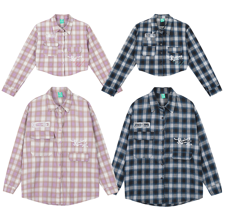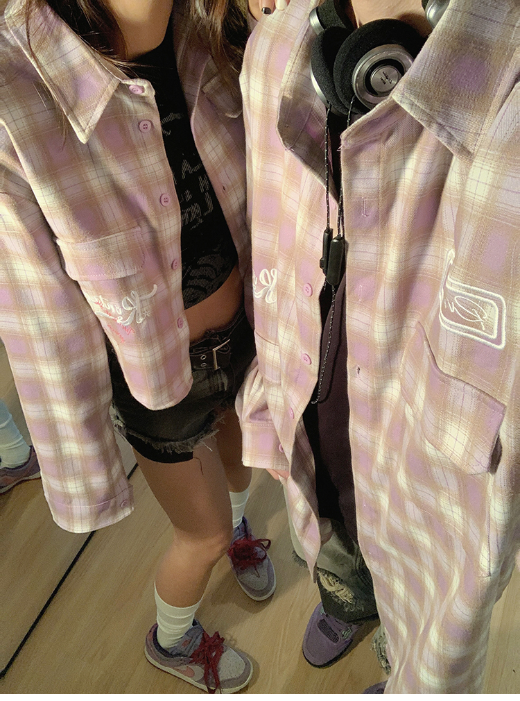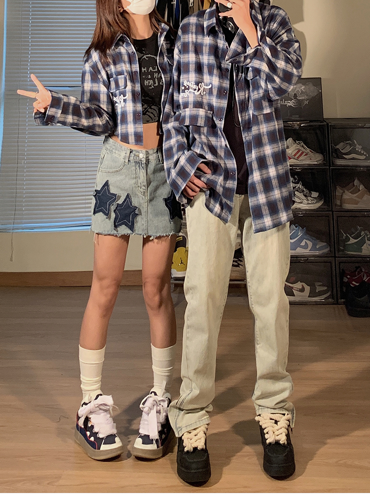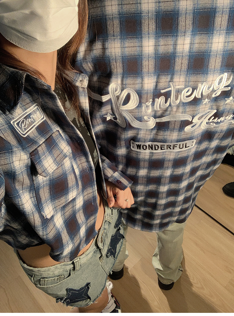 素素本SU美式復古情侶格子襯衫長袖潮牌高街寬鬆一長一短男女外套