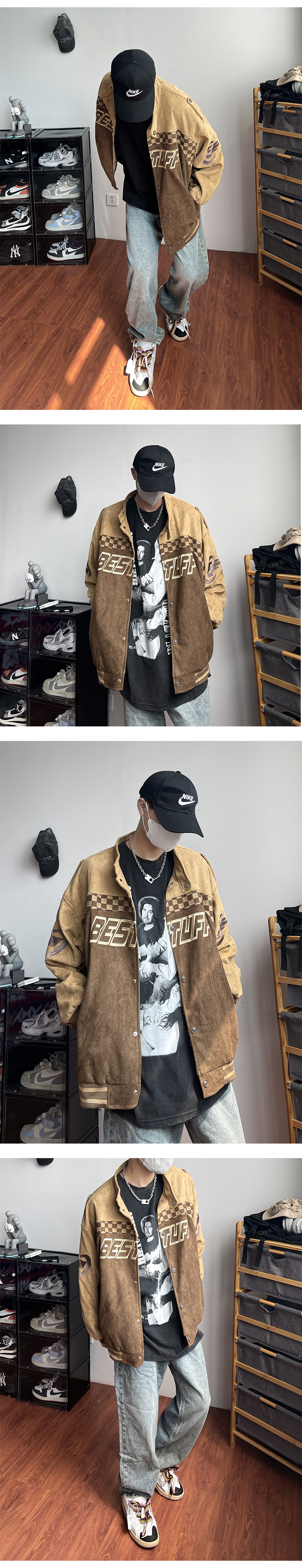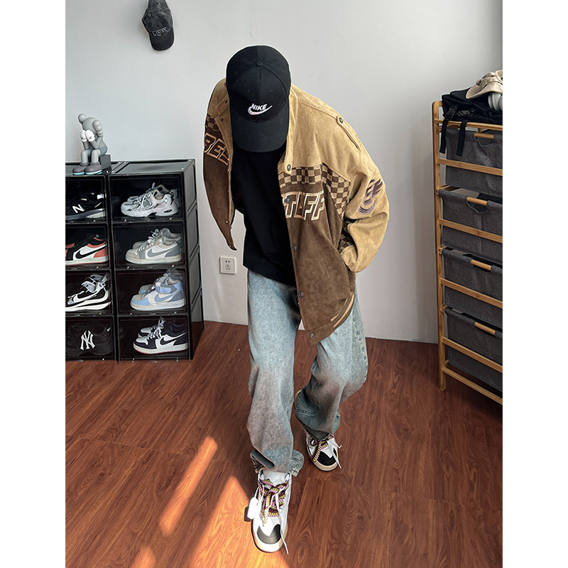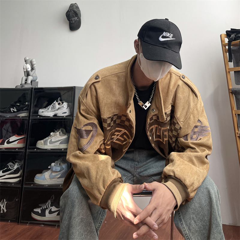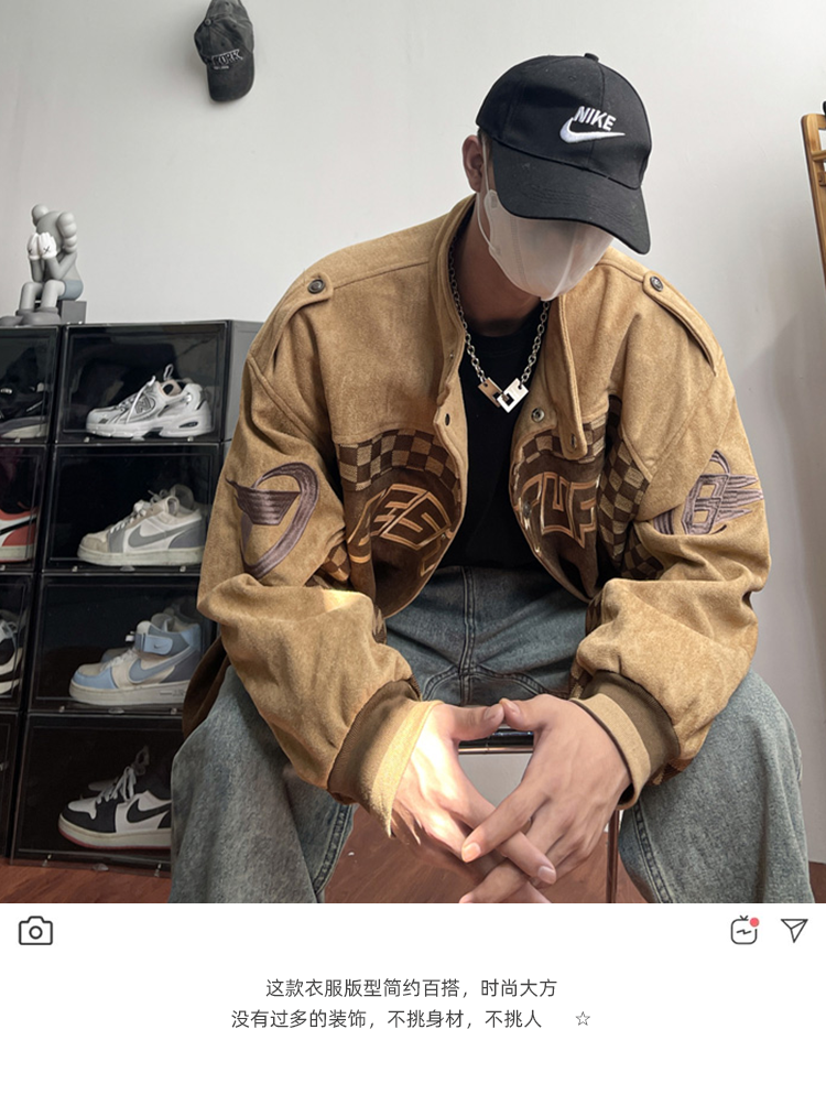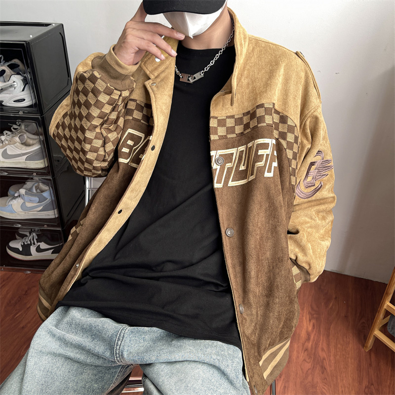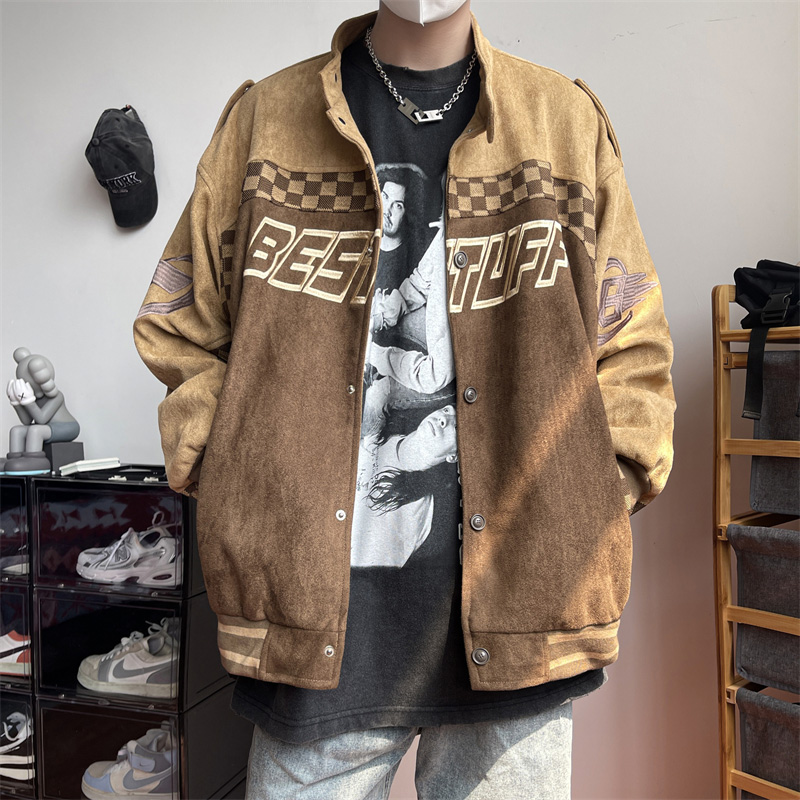 美式復古麂皮絨賽車服外套男春季高街潮牌棒球服寬鬆休閒情侶夾克