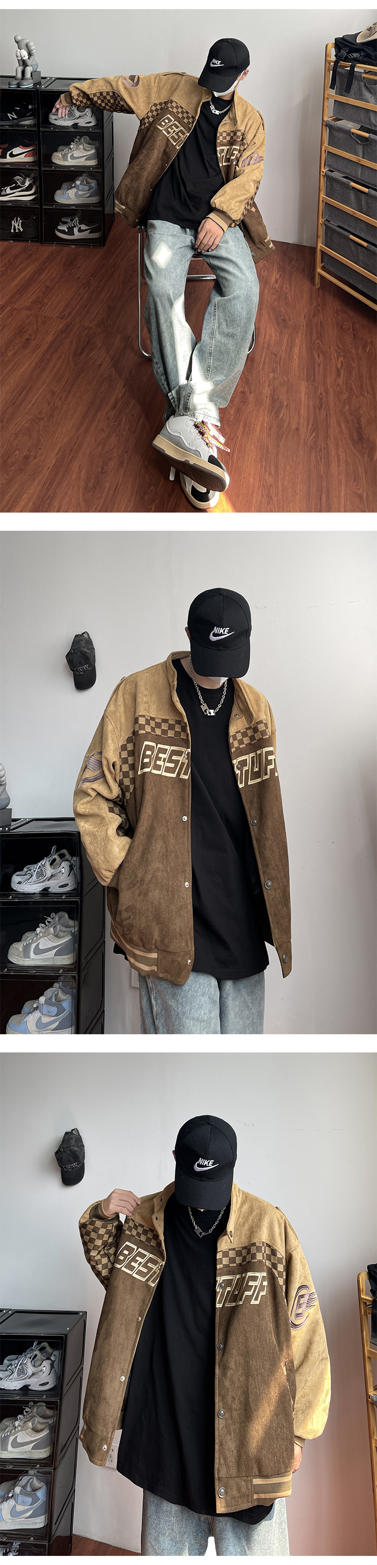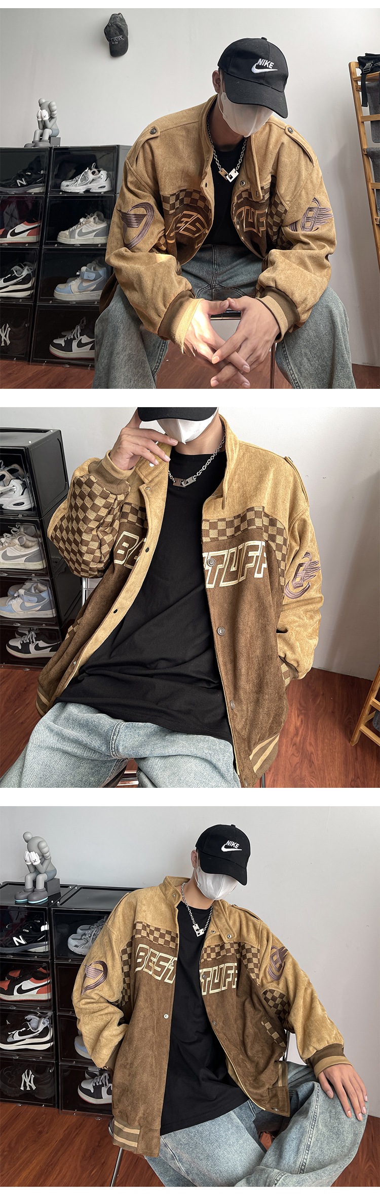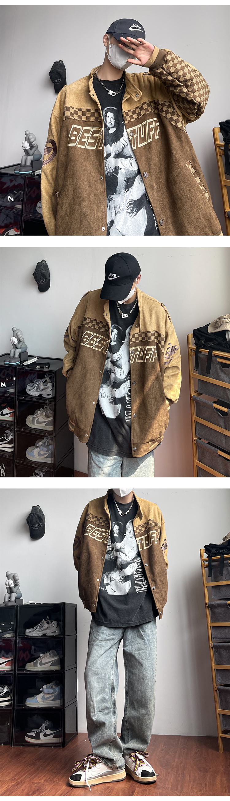 美式復古麂皮絨賽車服外套男春季高街潮牌棒球服寬鬆休閒情侶夾克