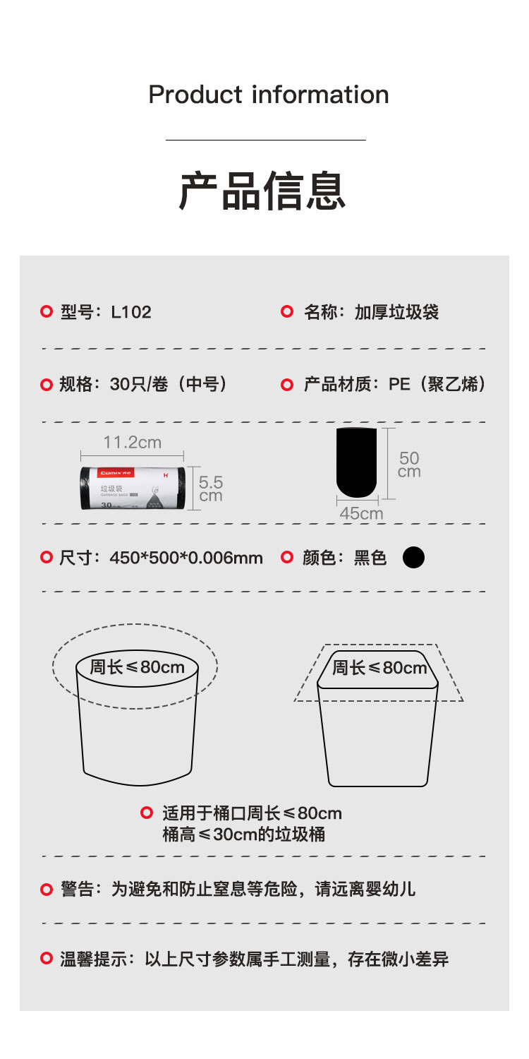 颜色 30只装45*50cm L102(需要整箱请购买60包),【加厚款】30只装45*50cm L101(需要整箱请购买60包),30只装50*60cm L105(需要整箱请购买60包),【加厚款】30只装50*60cm L104(需要整箱请购买60包),【加厚型】50个装45*60cm L108(需要整箱请购买40包),90只装45*50cm L110(需要整箱请购买40包),【彩色分类款】90只装45*55cm L109E(需要整箱请购买30包),90只装 抽绳垃圾袋45*50cm L226