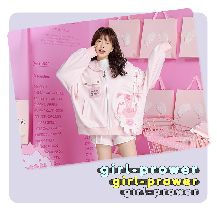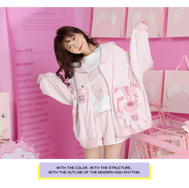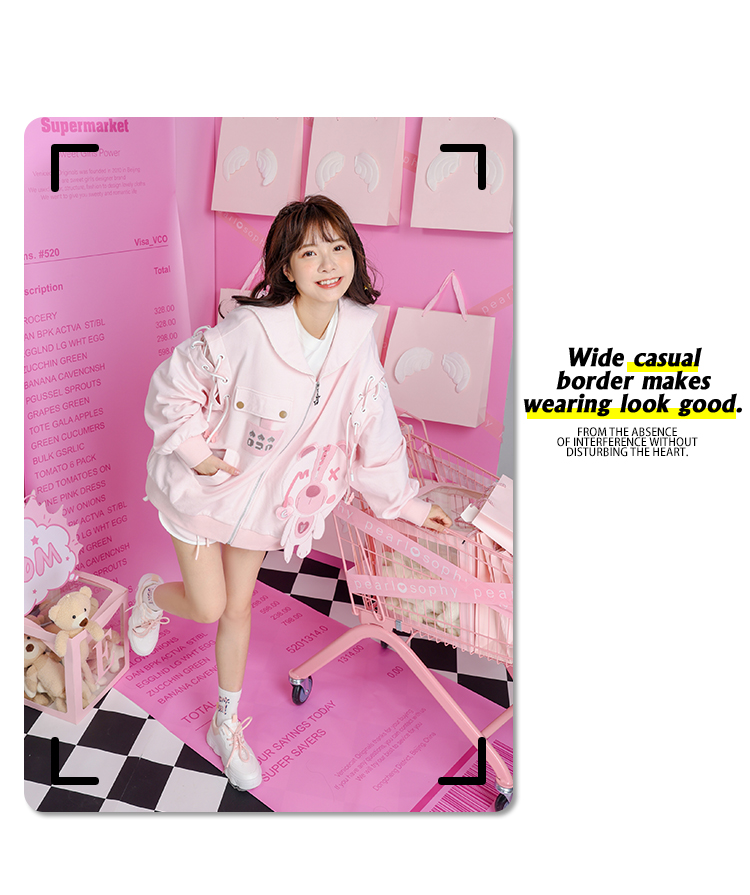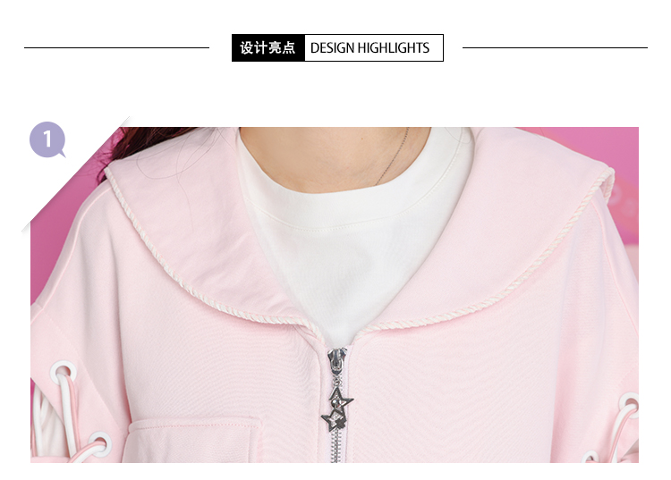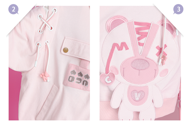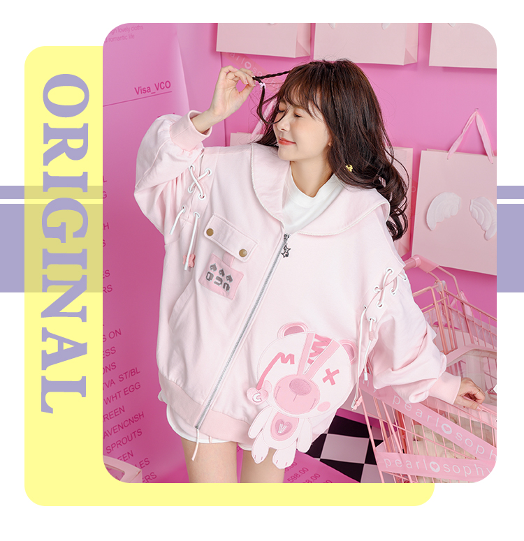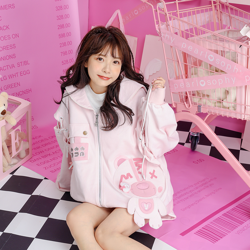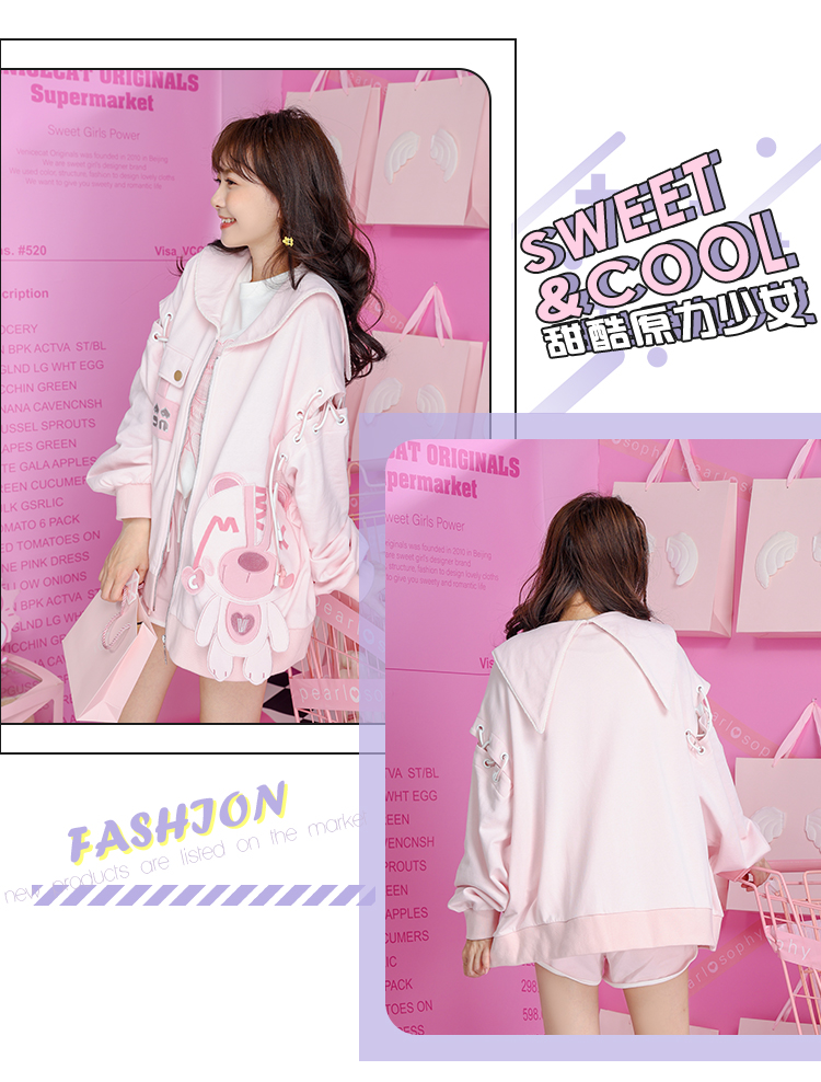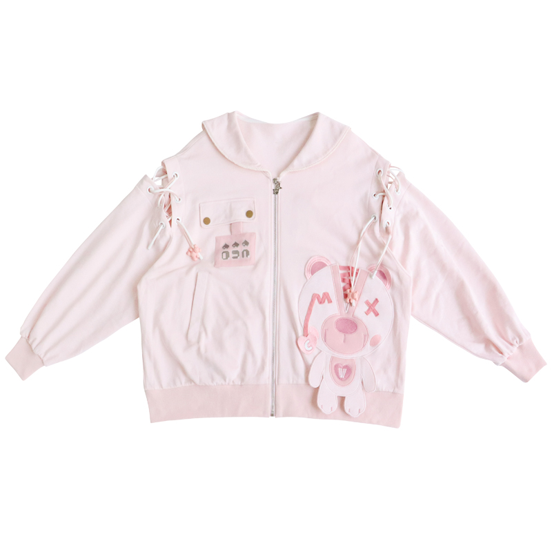 2023秋裝甜美少女卡通小熊繡花串繩露肩粉色海軍領長袖厚棉T開衫
