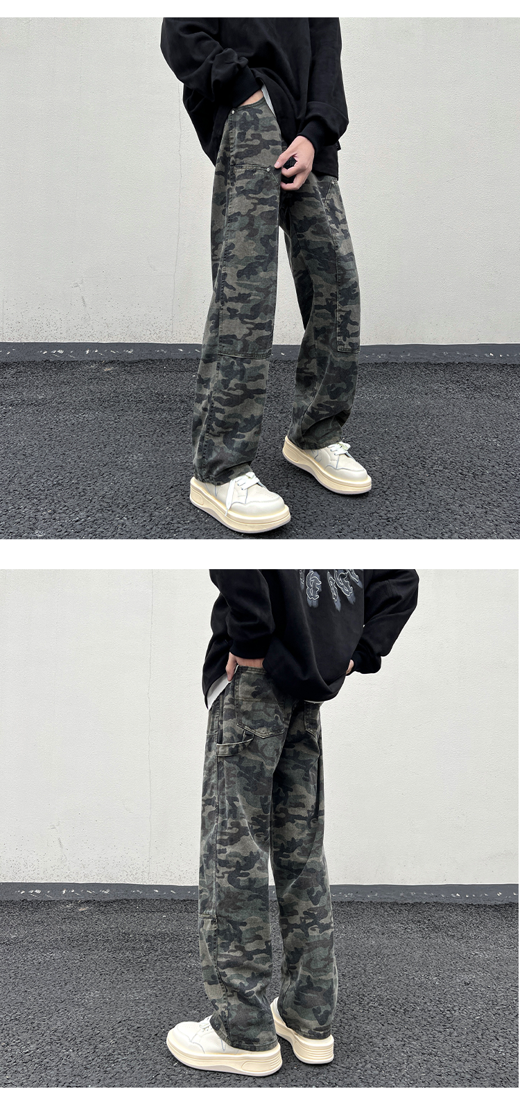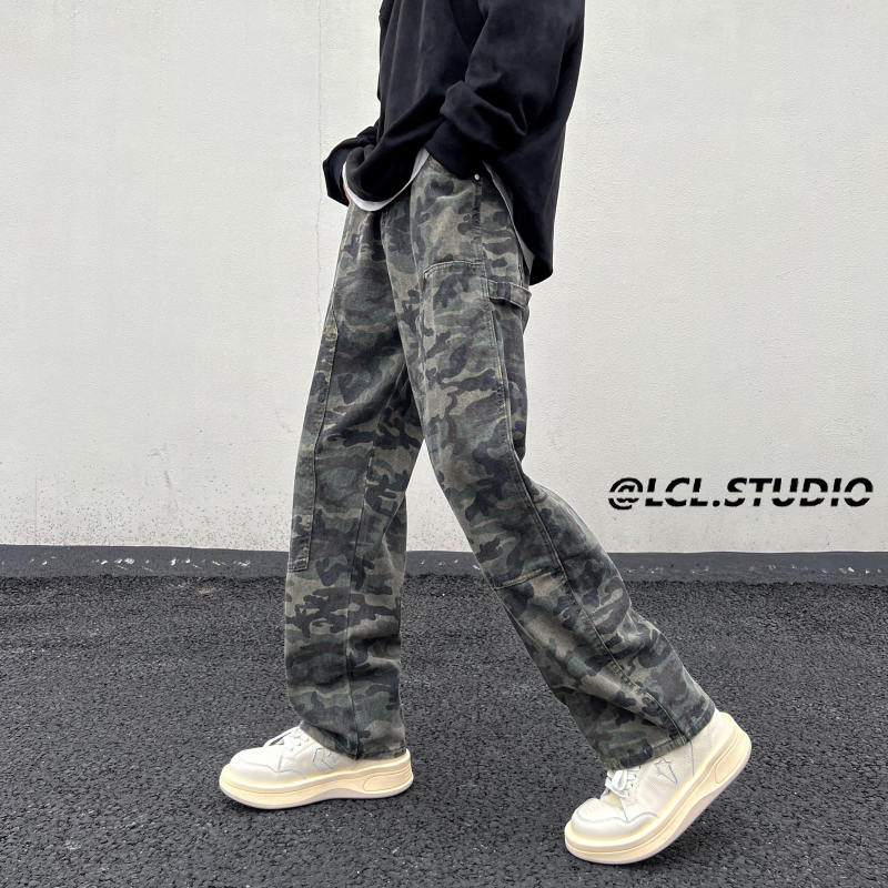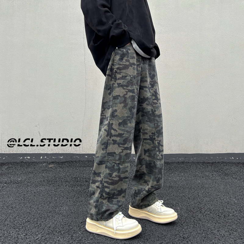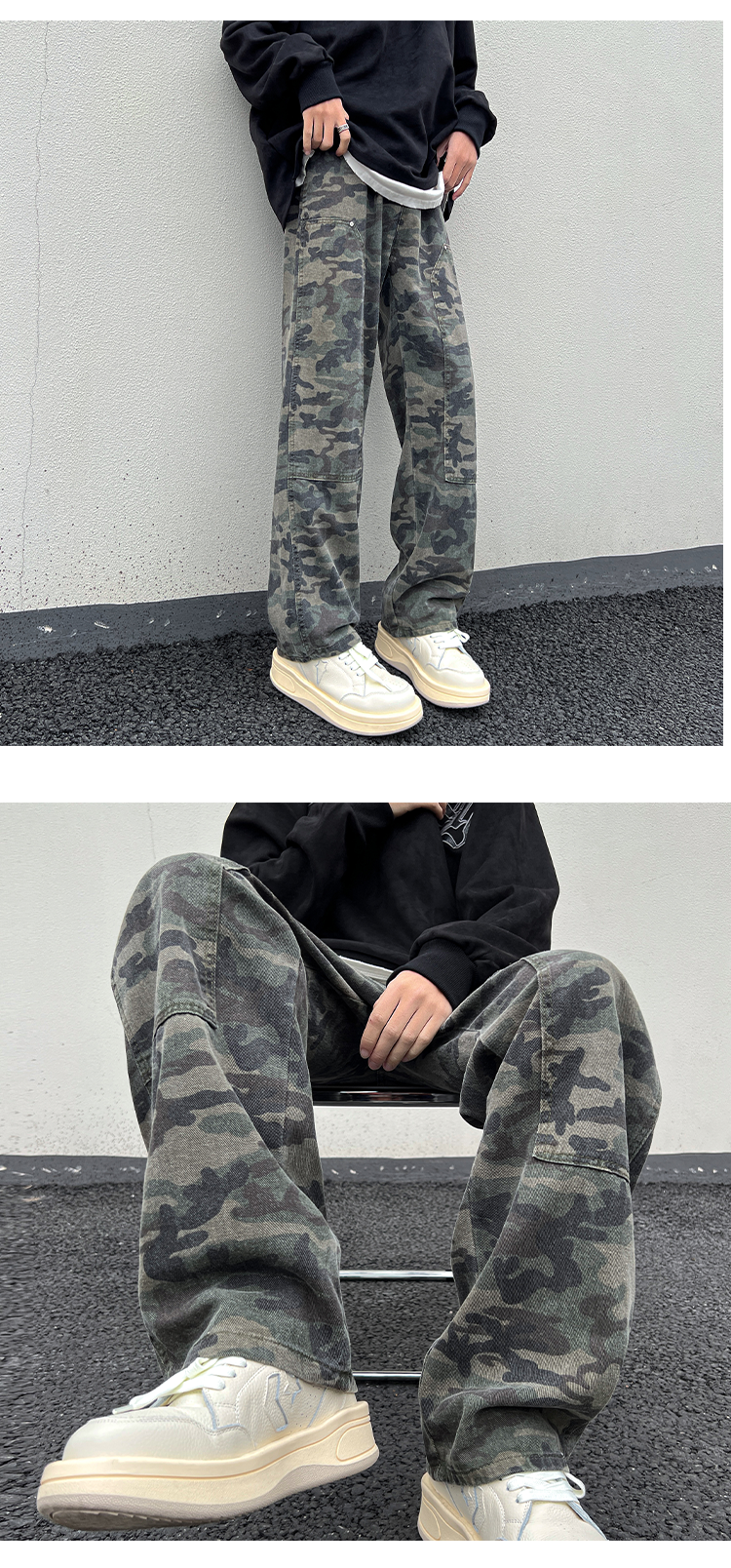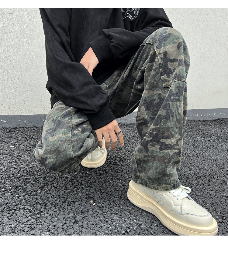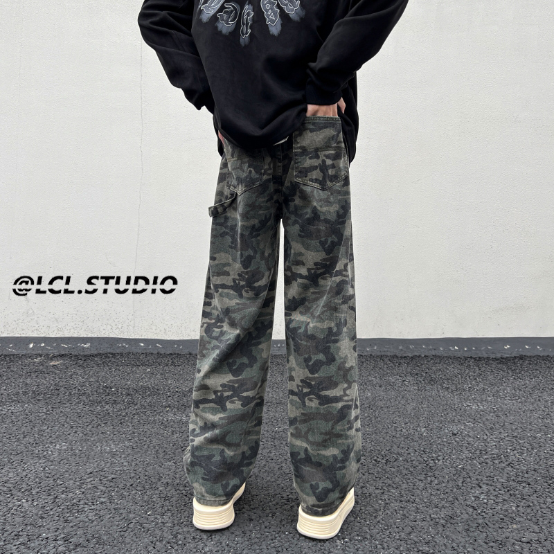 高街迷彩牛仔褲vibe風美式復古潮牌長褲男hiphopins潮炸街直筒褲