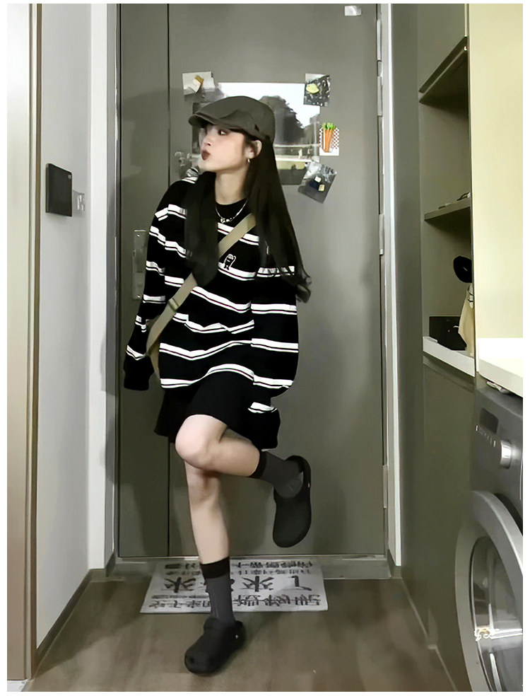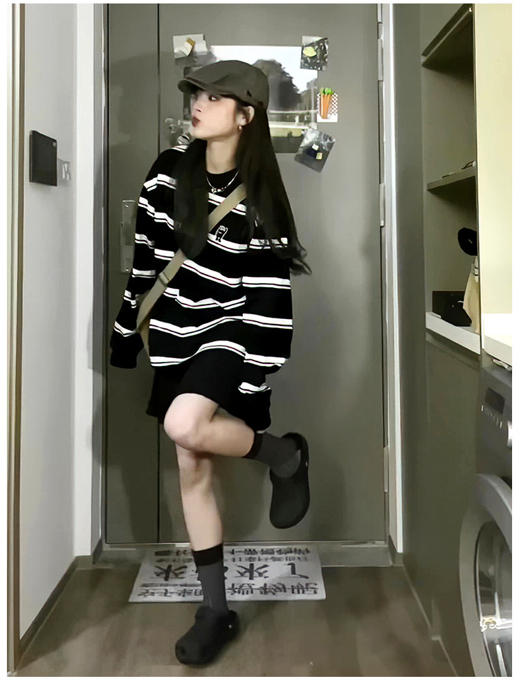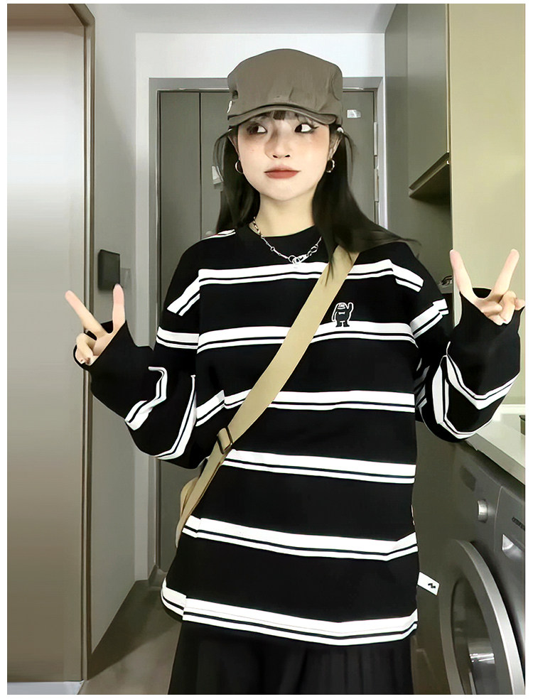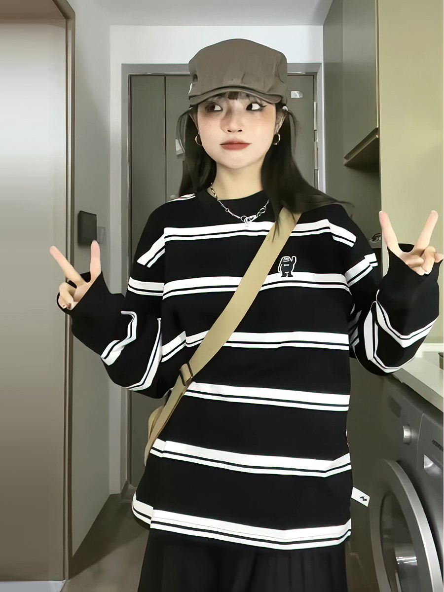 日系寬鬆條紋長袖厚棉T女2023春秋新款圓領純棉情侶百搭基礎外套潮