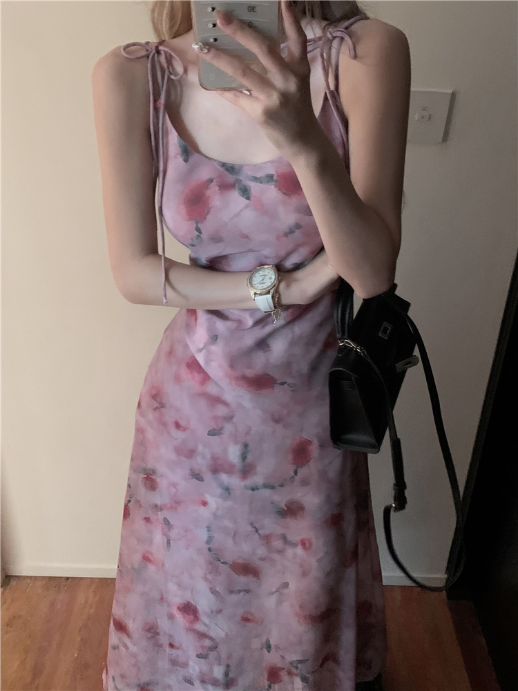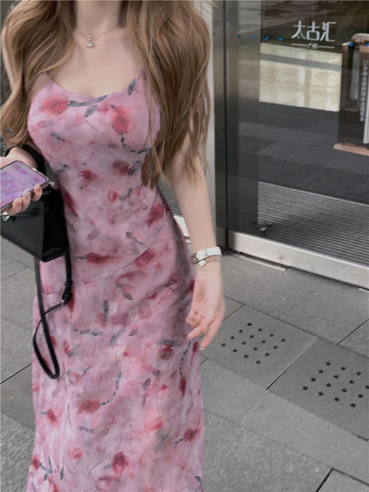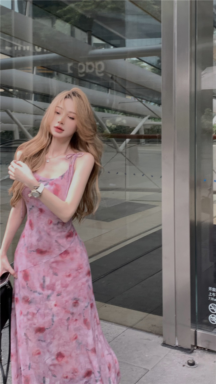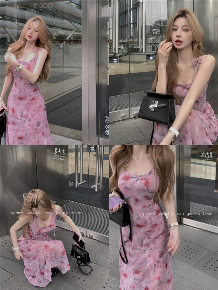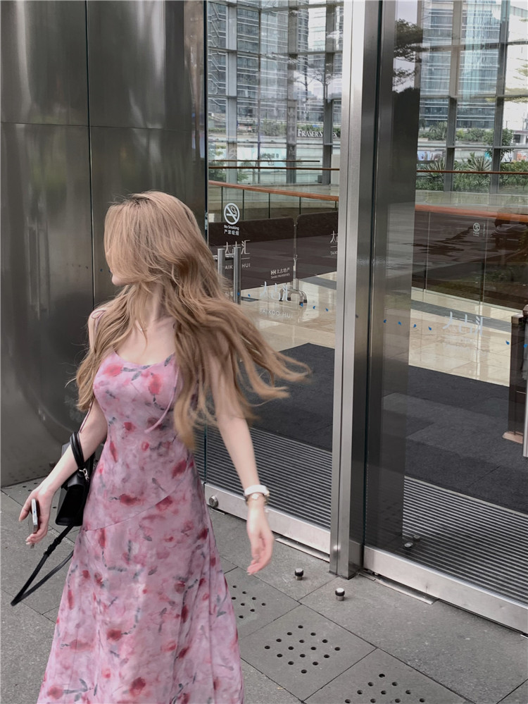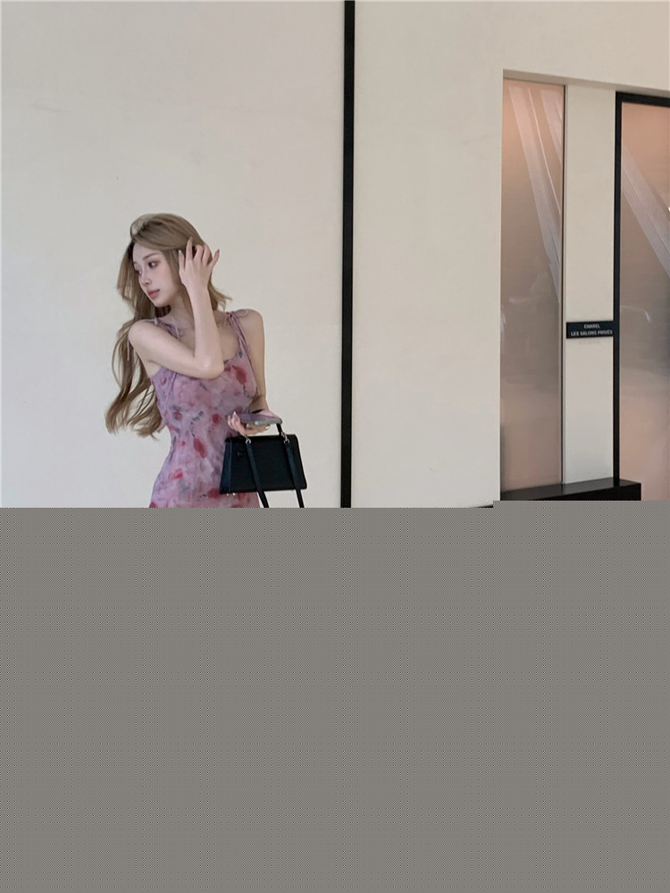 懷秋少女~乾枯玫瑰色系莫奈花園修身洋裝夏季新款顯瘦花色裙子
