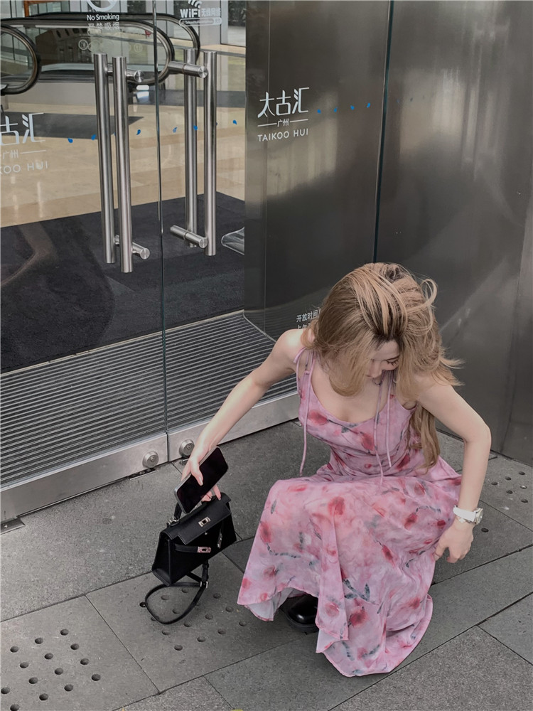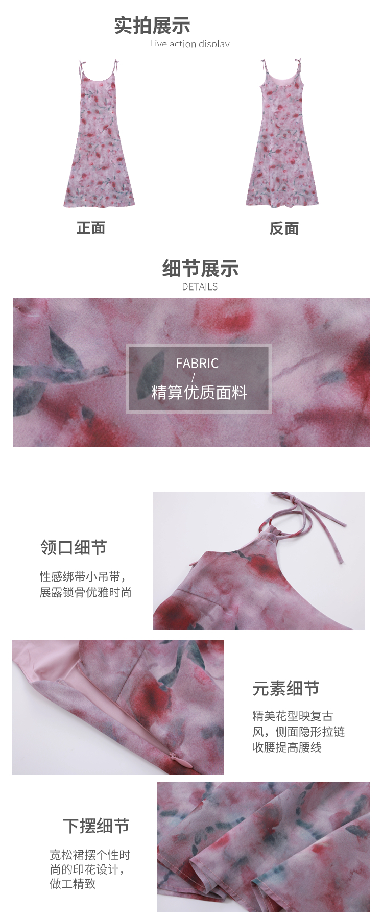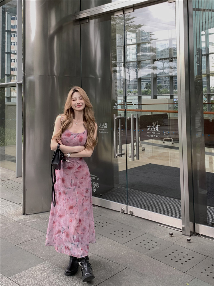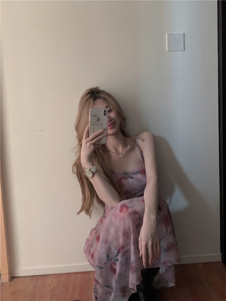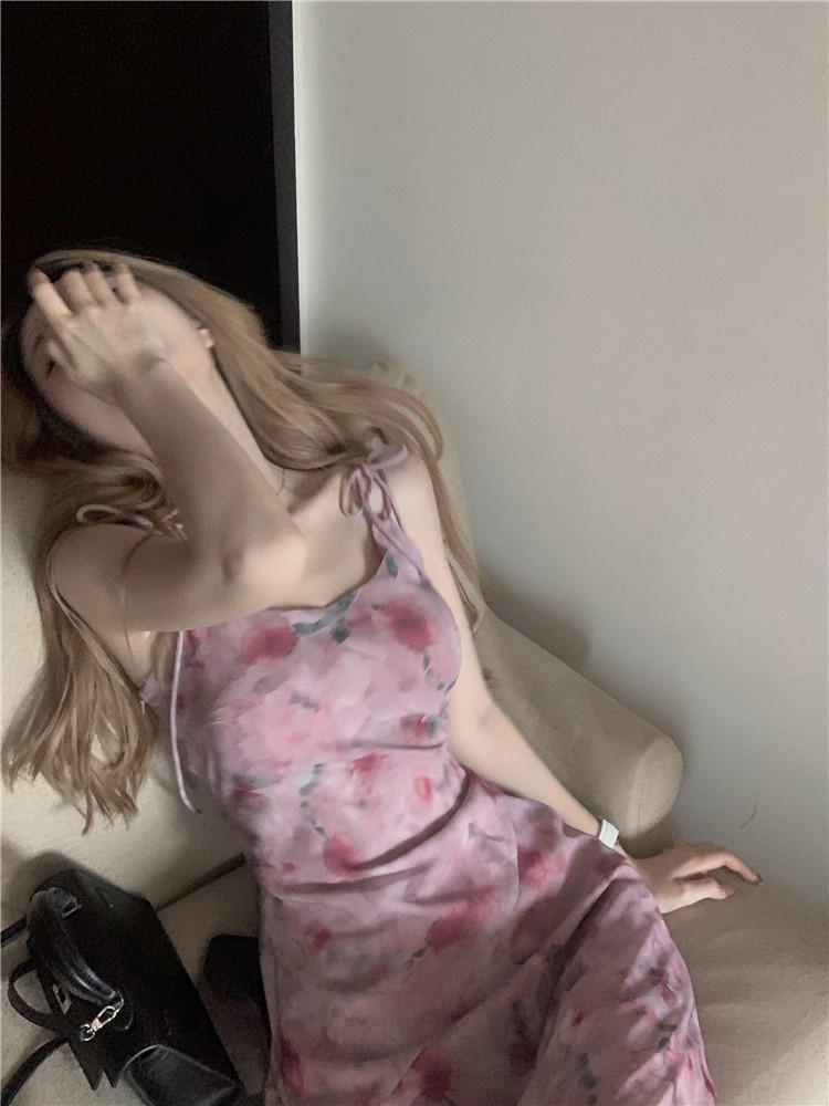 懷秋少女~乾枯玫瑰色系莫奈花園修身洋裝夏季新款顯瘦花色裙子