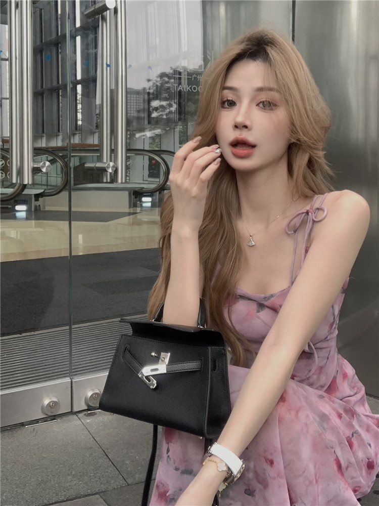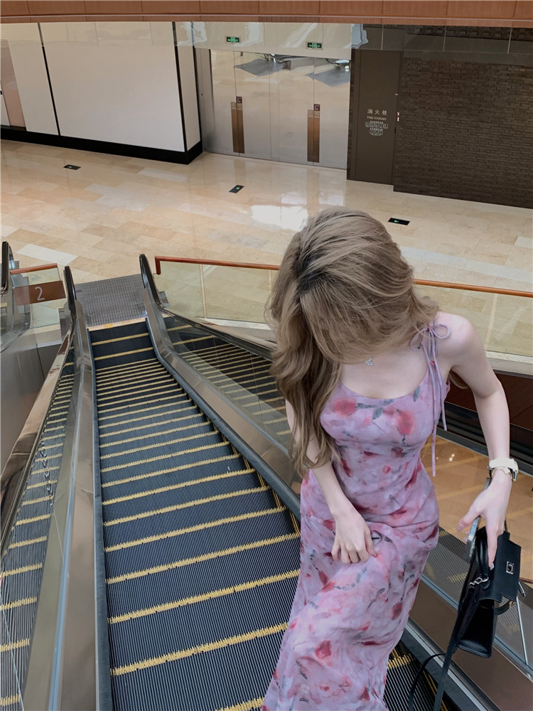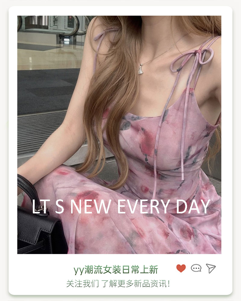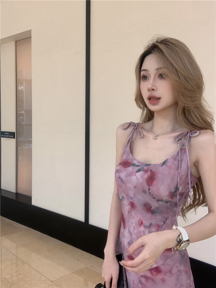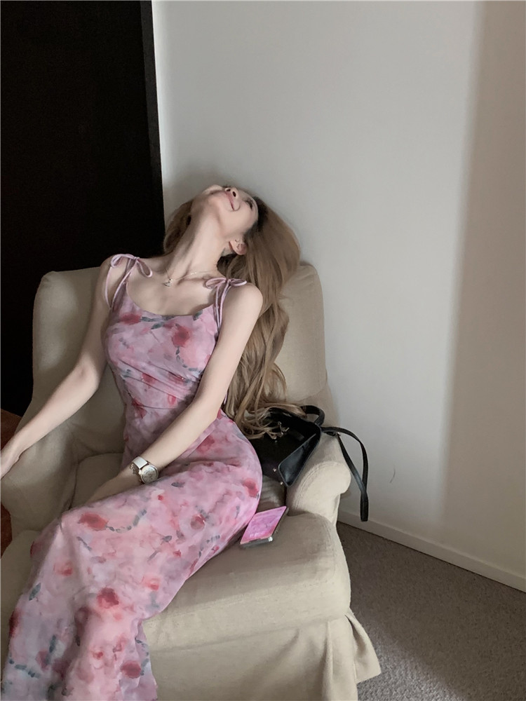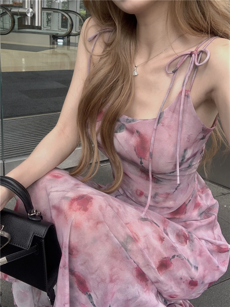 懷秋少女~乾枯玫瑰色系莫奈花園修身洋裝夏季新款顯瘦花色裙子