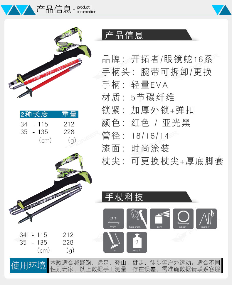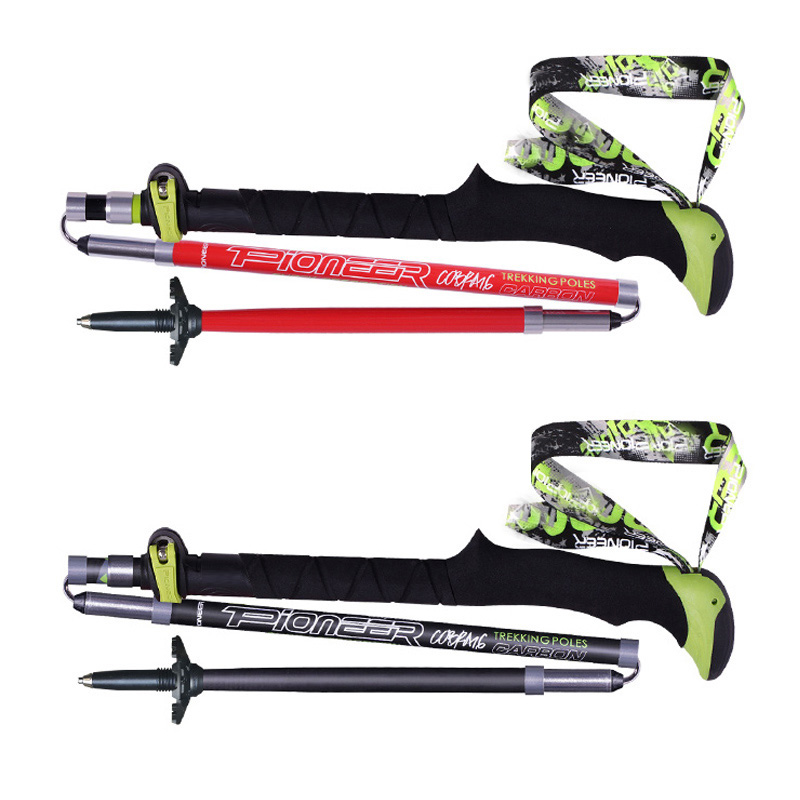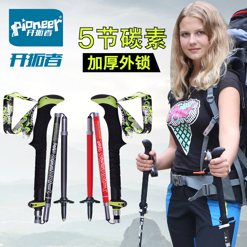 開拓者 五節碳纖維摺疊登山杖 超輕可伸縮碳素柺杖 徒步戶外手杖