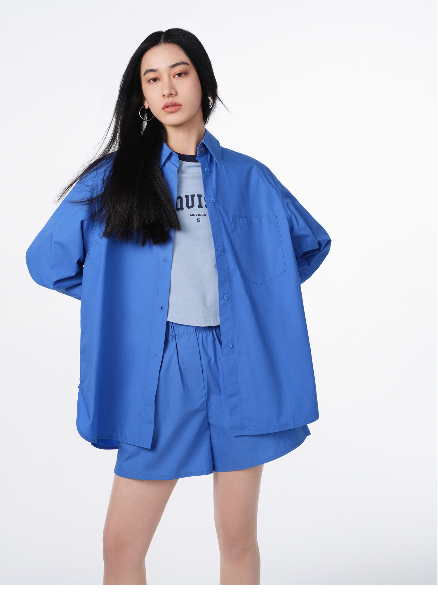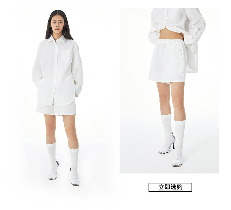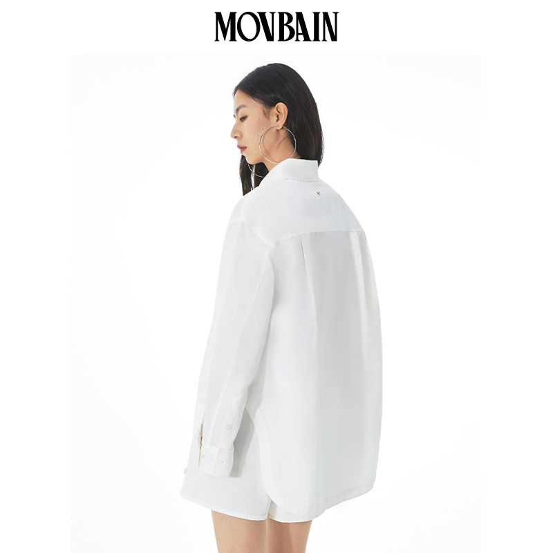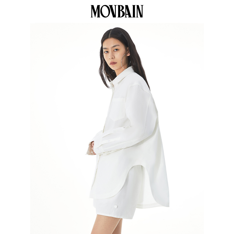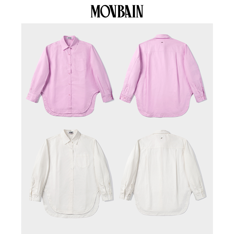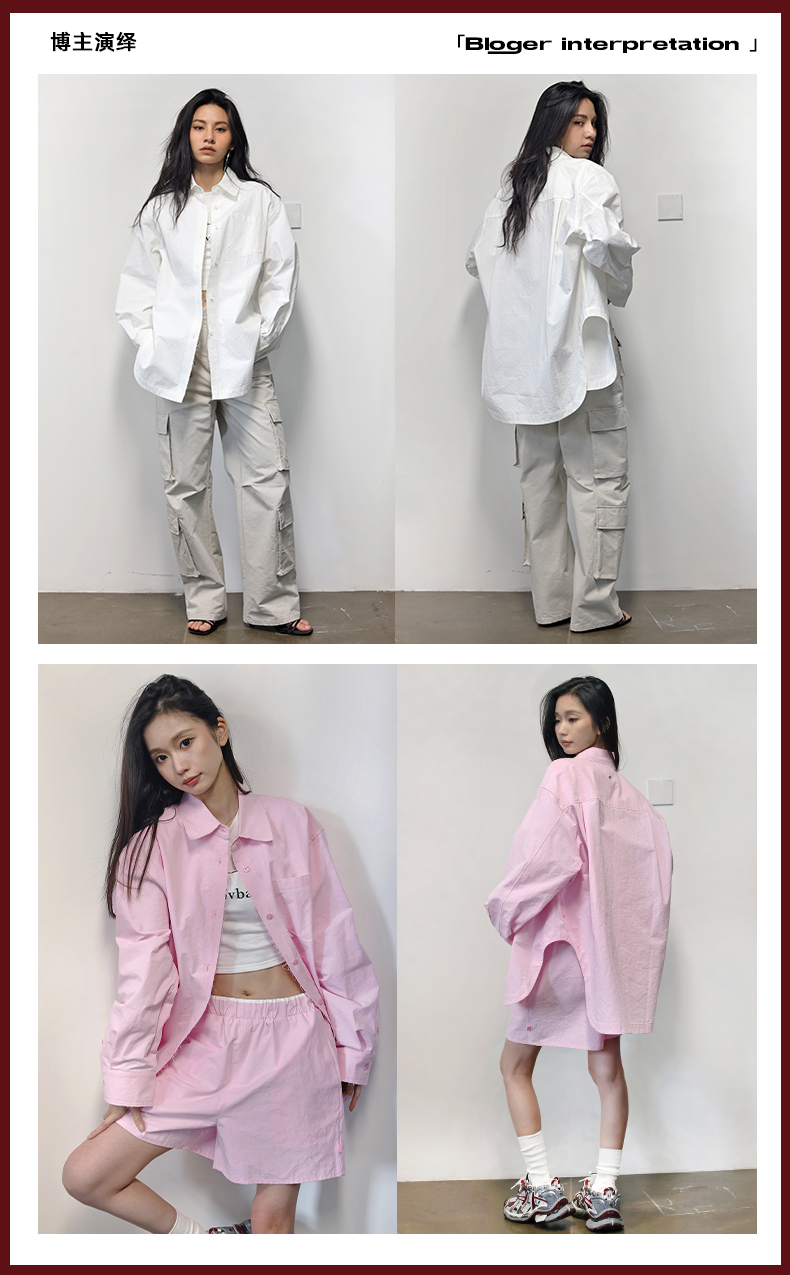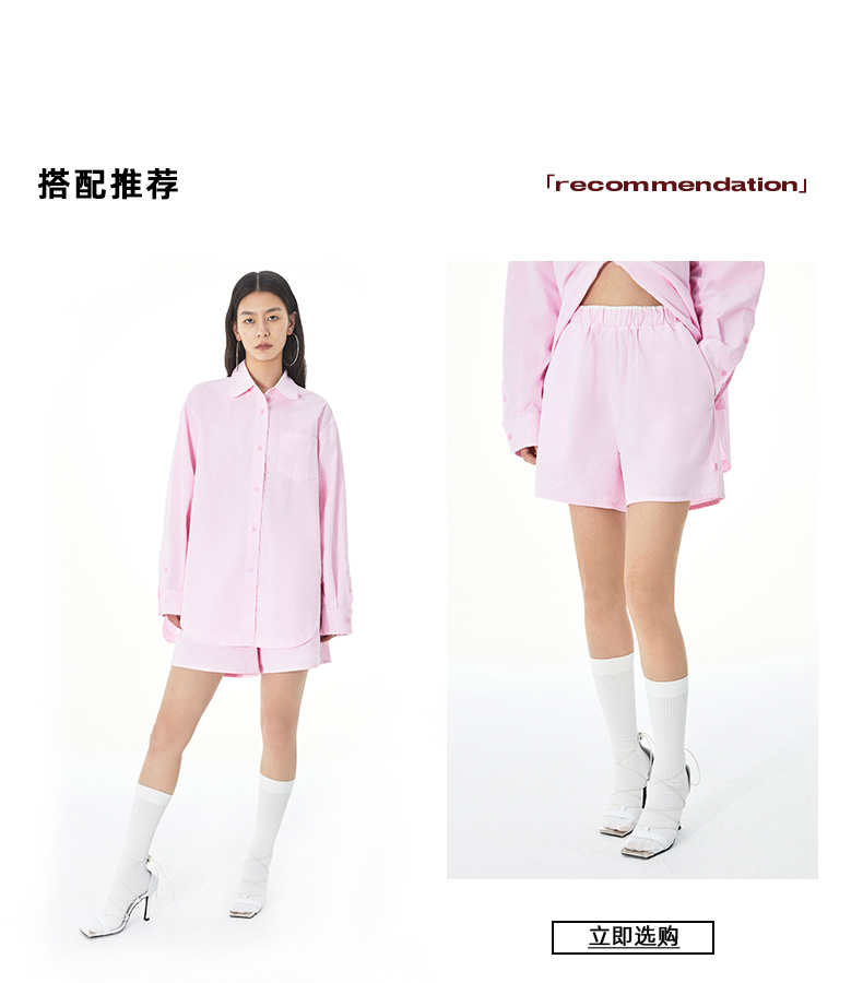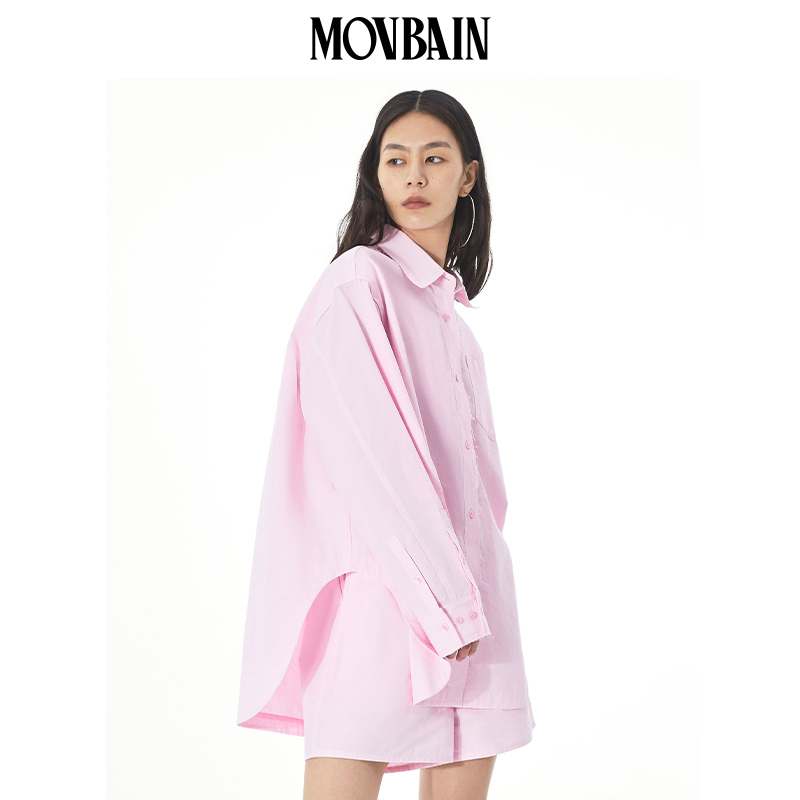MOVBAIN2023春季新品拼縫純棉粉色襯衫套裝 寬鬆休閒短褲白色上衣