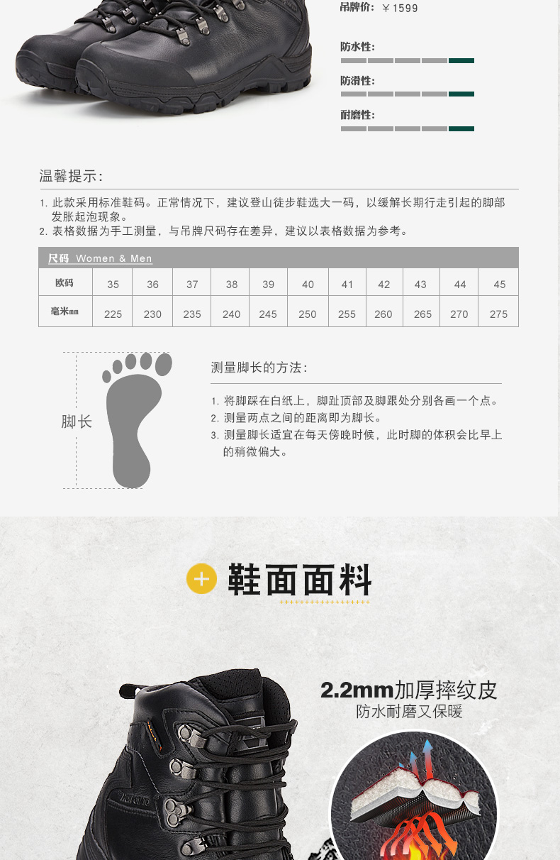 功能 防水 平衡 輕便 防滑 保暖 耐磨 支撐 減震 包裹性 抗衝擊